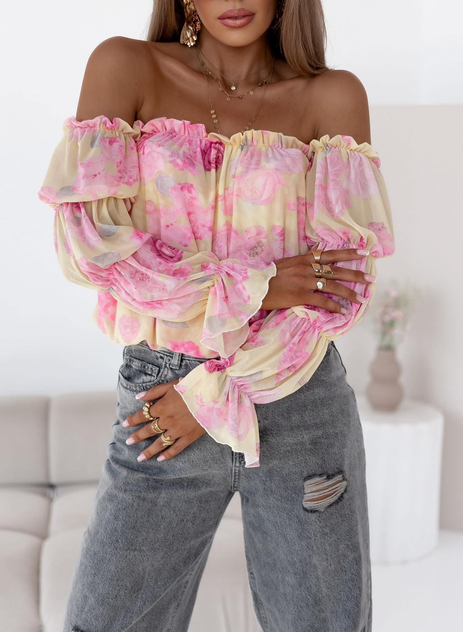 Eine klassische Bluse mit spanischem Schnitt, aus doppeltem Mesh-Material in schönen Blumenmustern.