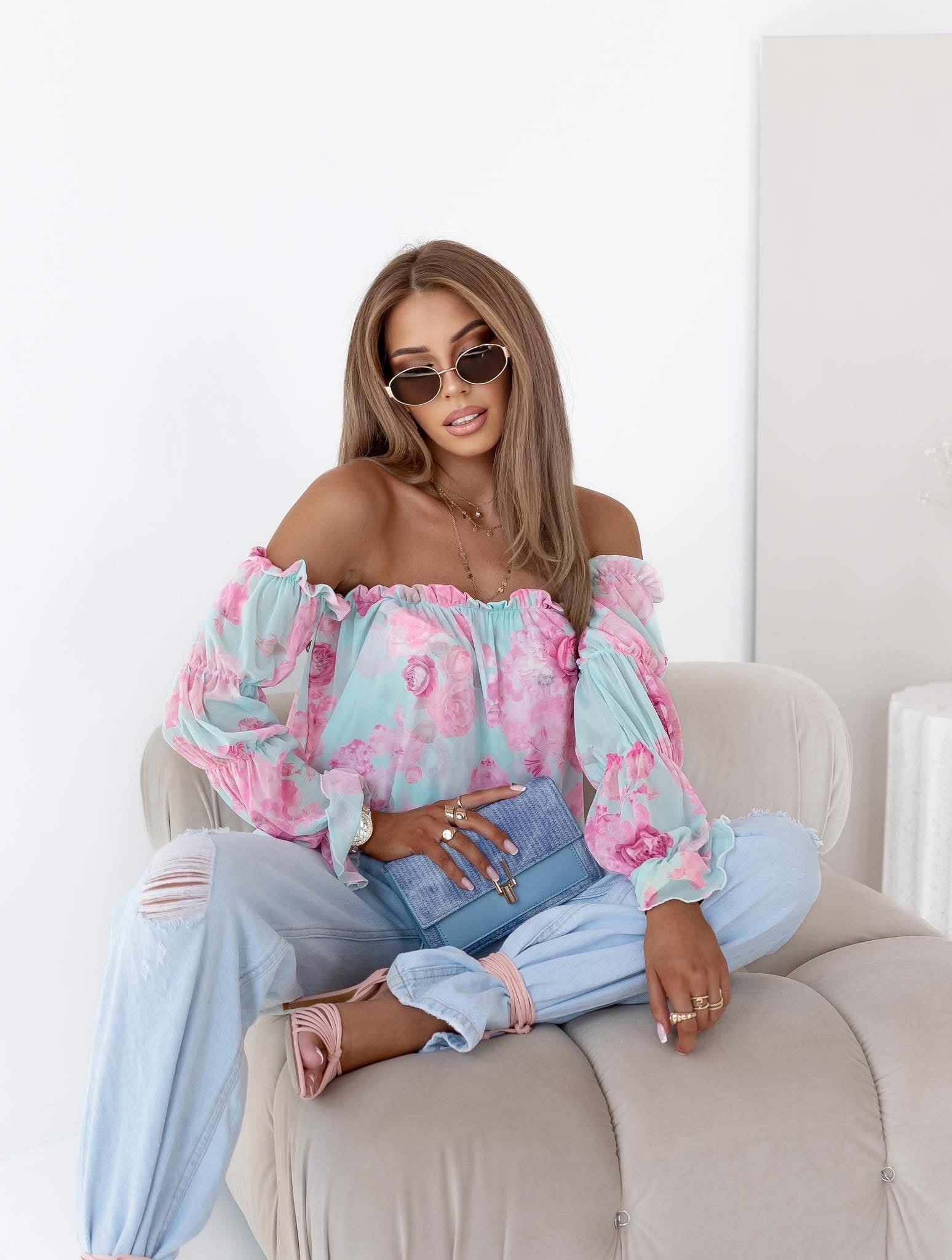 Off- Schoulder Damenbluse hellblau- Blumen