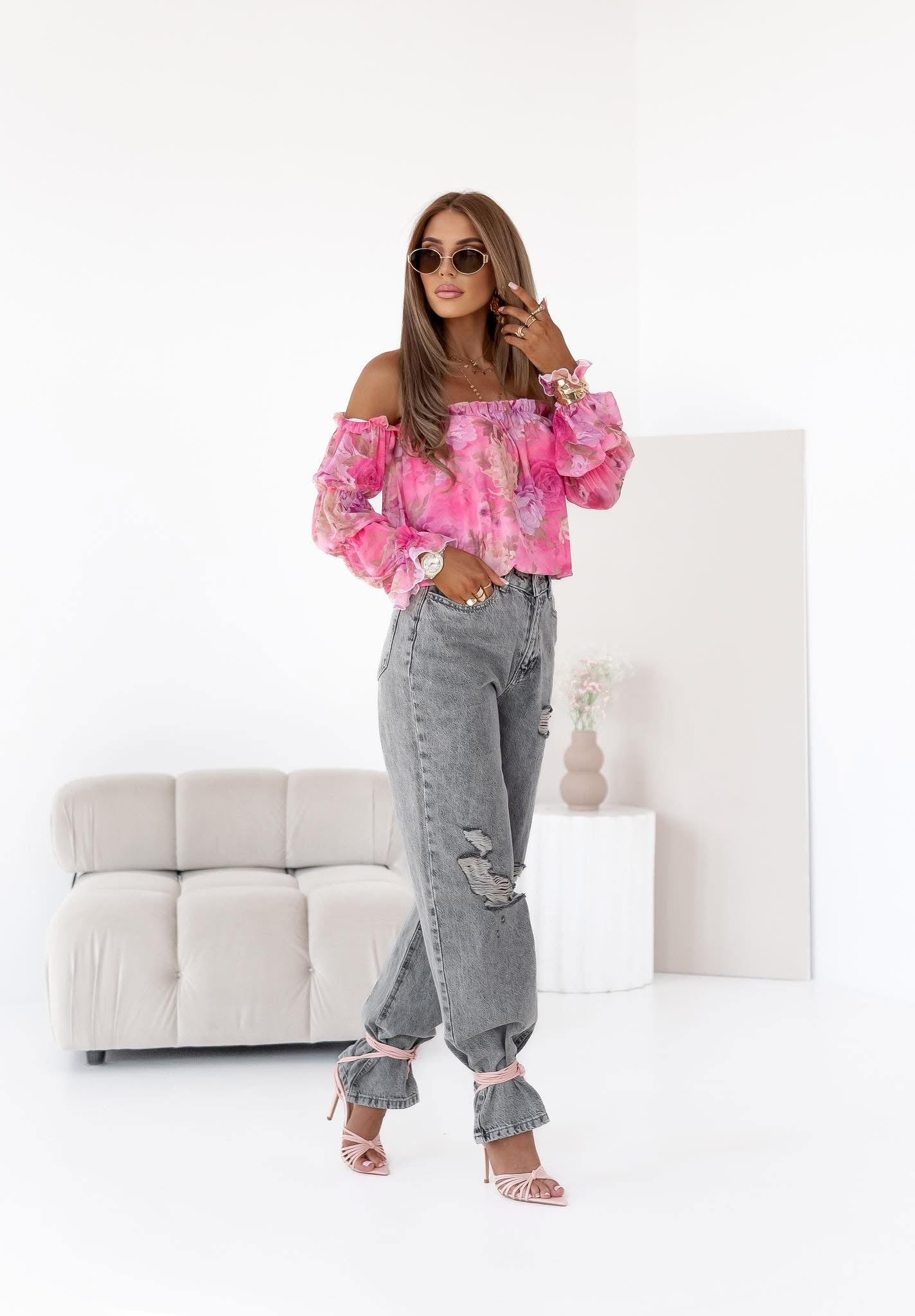 Eine klassische Bluse mit spanischem Schnitt, aus doppeltem Mesh-Material in schönen Blumenmustern.