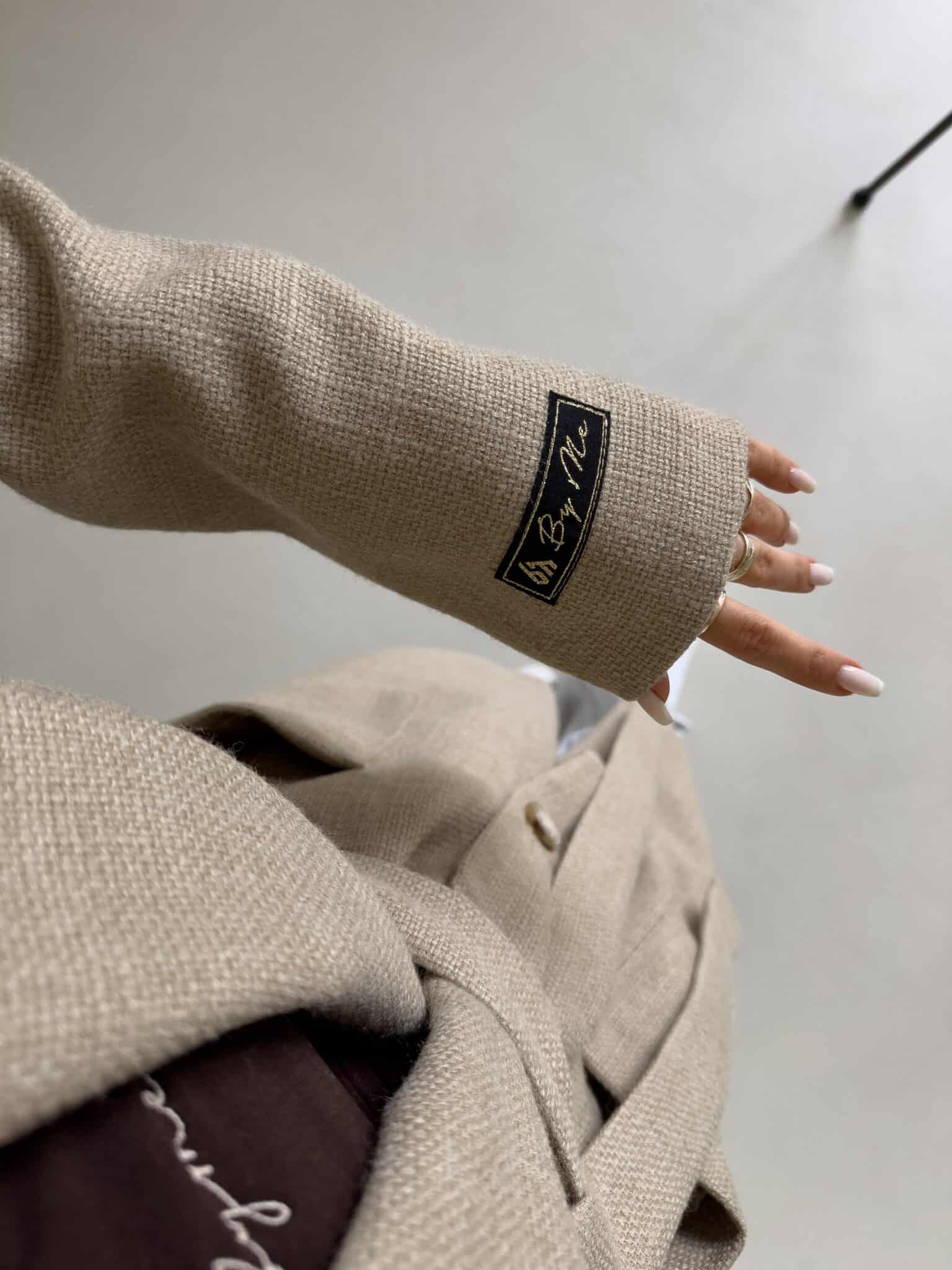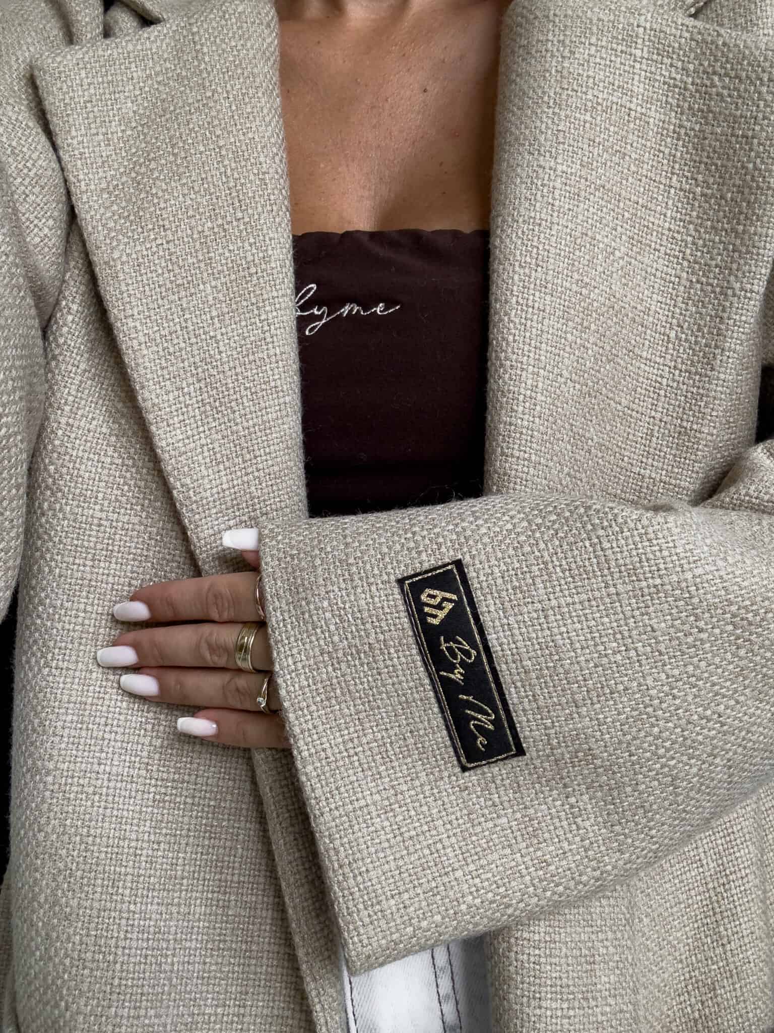 Das Modell ist mit einem breiten, klassischen Kragen mit Revers ausgestattet. Einzelknopfverschluss in der Taille und befestigter Riemen. Es gibt große, aufgesetzte Taschen auf der Vorderseite. Ein zusätzlicher Akzent ist ein Patch mit einem Logo auf dem Ärmel.