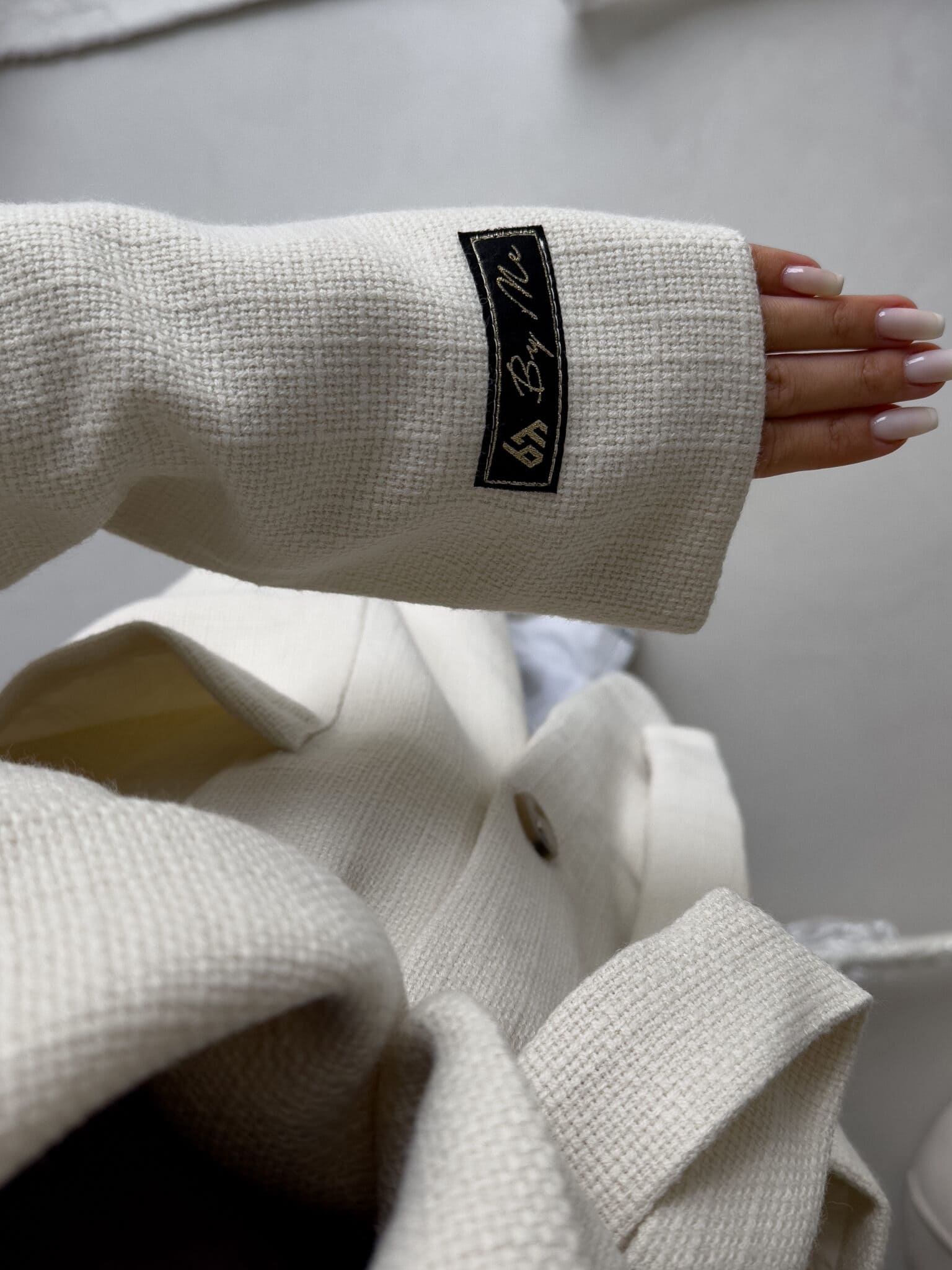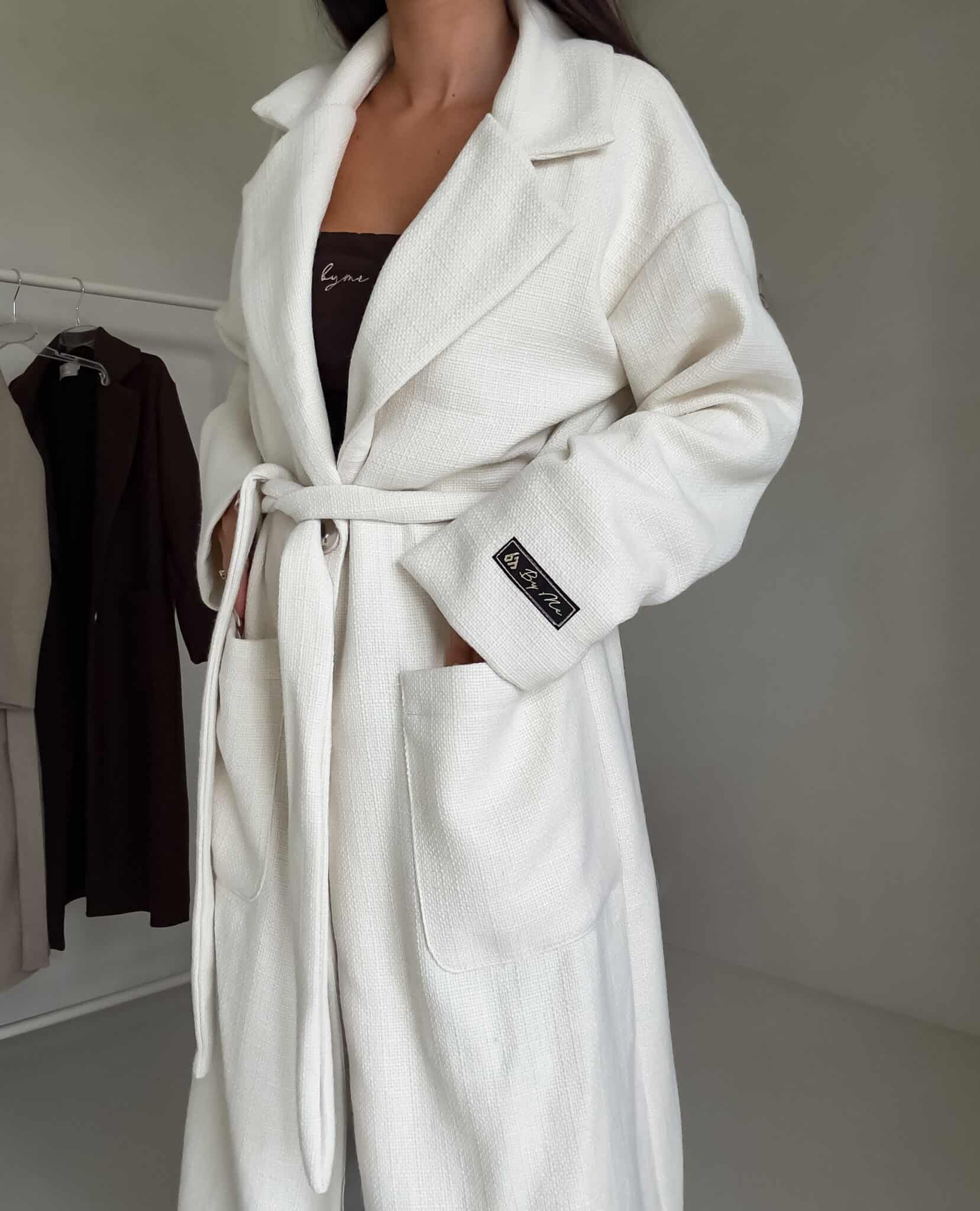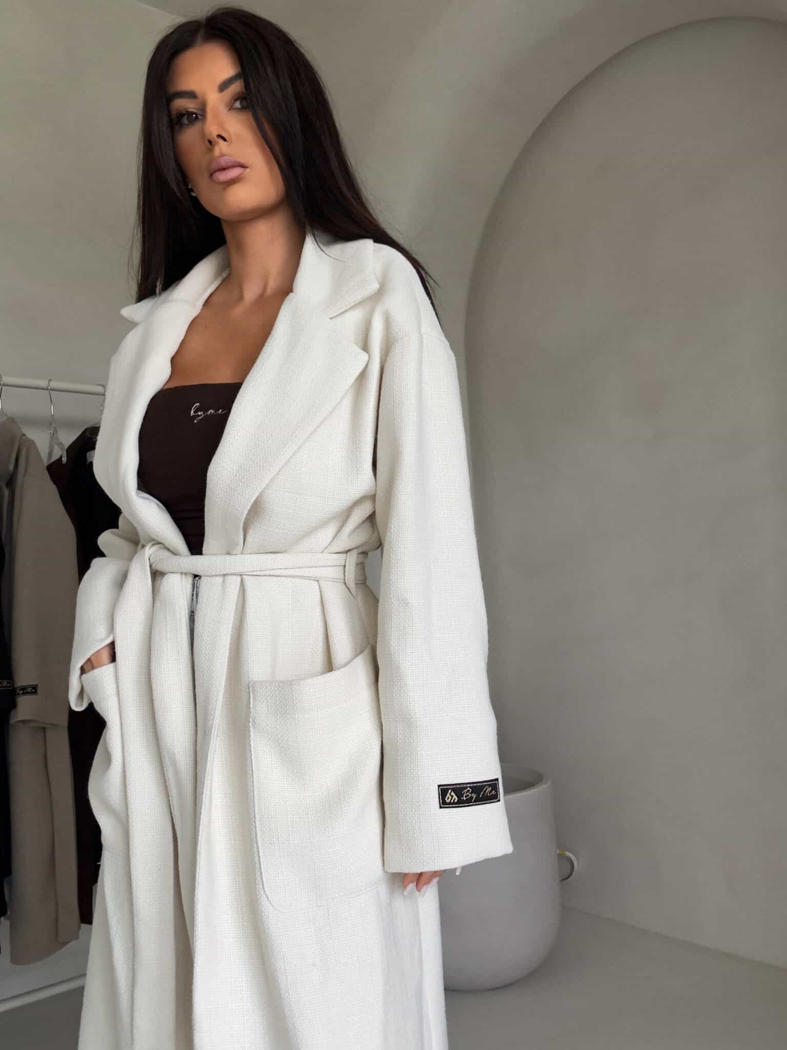 Das Modell ist mit einem breiten, klassischen Kragen mit Revers ausgestattet. Einzelknopfverschluss in der Taille und befestigter Riemen. Es gibt große, aufgesetzte Taschen auf der Vorderseite. Ein zusätzlicher Akzent ist ein Patch mit einem Logo auf dem Ärmel.