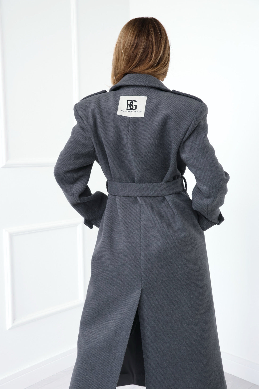 Produktbeschreibung: Langer eleganter Mantel mit . Zweireihig, mit Knöpfen befestigt. Es hat Taschen an den Seiten. Dekorativer Baumwollaufnäher mit dem BG Brandenburg Couture Logo auf dem Hals. Darüber hinaus verleihen hohe Kissen in den Schultern Chic. Mantel auf das Futter.