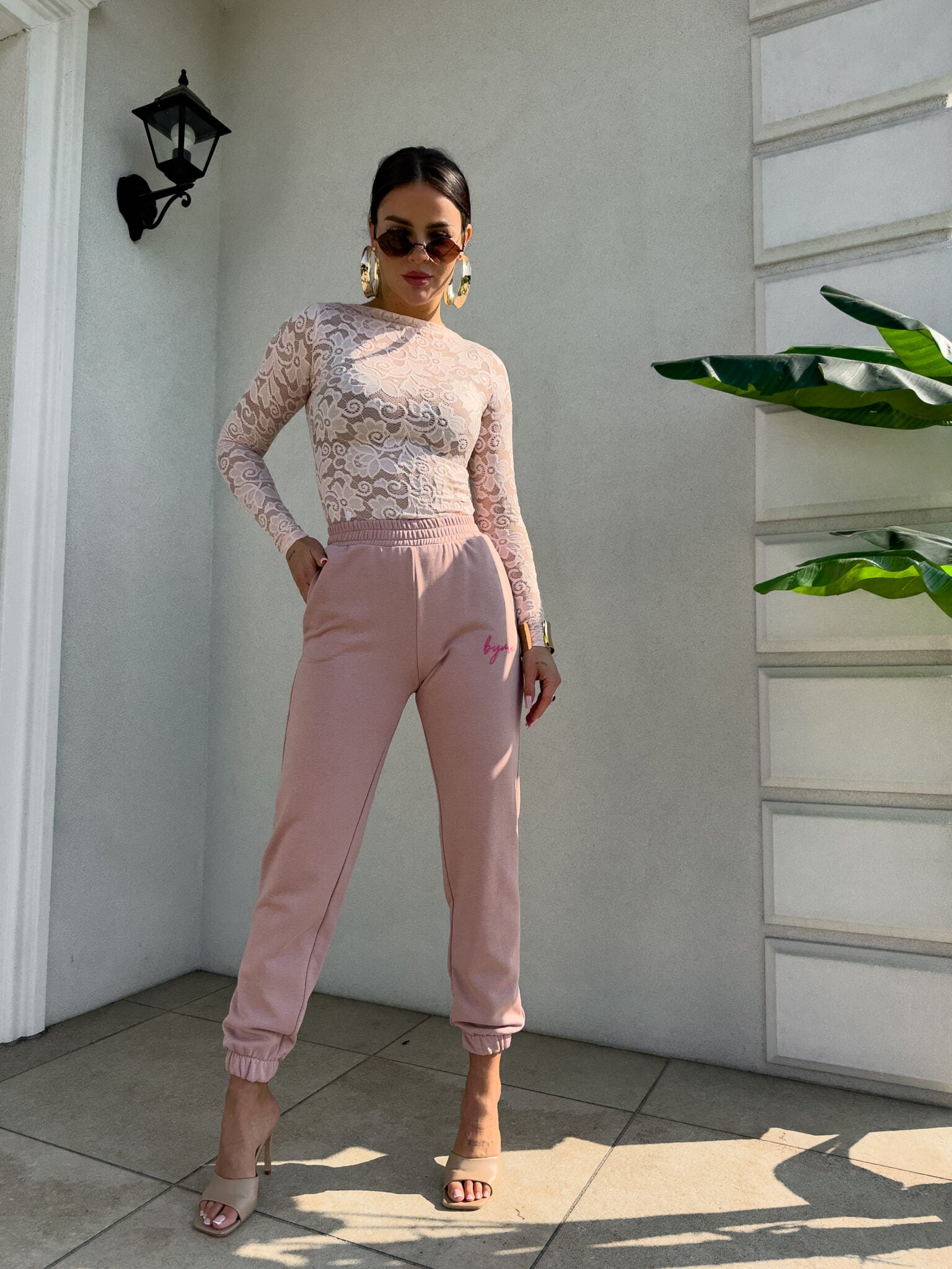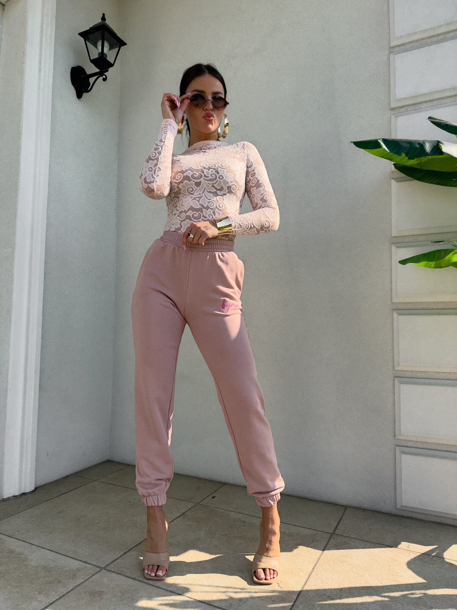 Jogginghose aus weichem Material, ideal für den täglichen Gebrauch und sportliche Aktivitäten. Die Beine sind mit einem praktischen Gummiband versehen, das Komfort und Passform für den Körper bietet. Es gibt ein elastisches Band an der Taille, das ein angenehmes Tragen und eine angemessene Passform ermöglicht. Die Hose ist mit einem dezenten Logo am Bein in einer zarten rosa Farbe verziert, die ihnen einen modischen und stilvollen Charakter verleiht. Sie sind mit praktischen Taschen an den Seiten ausgestattet, die sich ideal zur Aufbewahrung kleiner Gegenstände eignen. Die perfekte Kombination aus Funktionalität und Design.