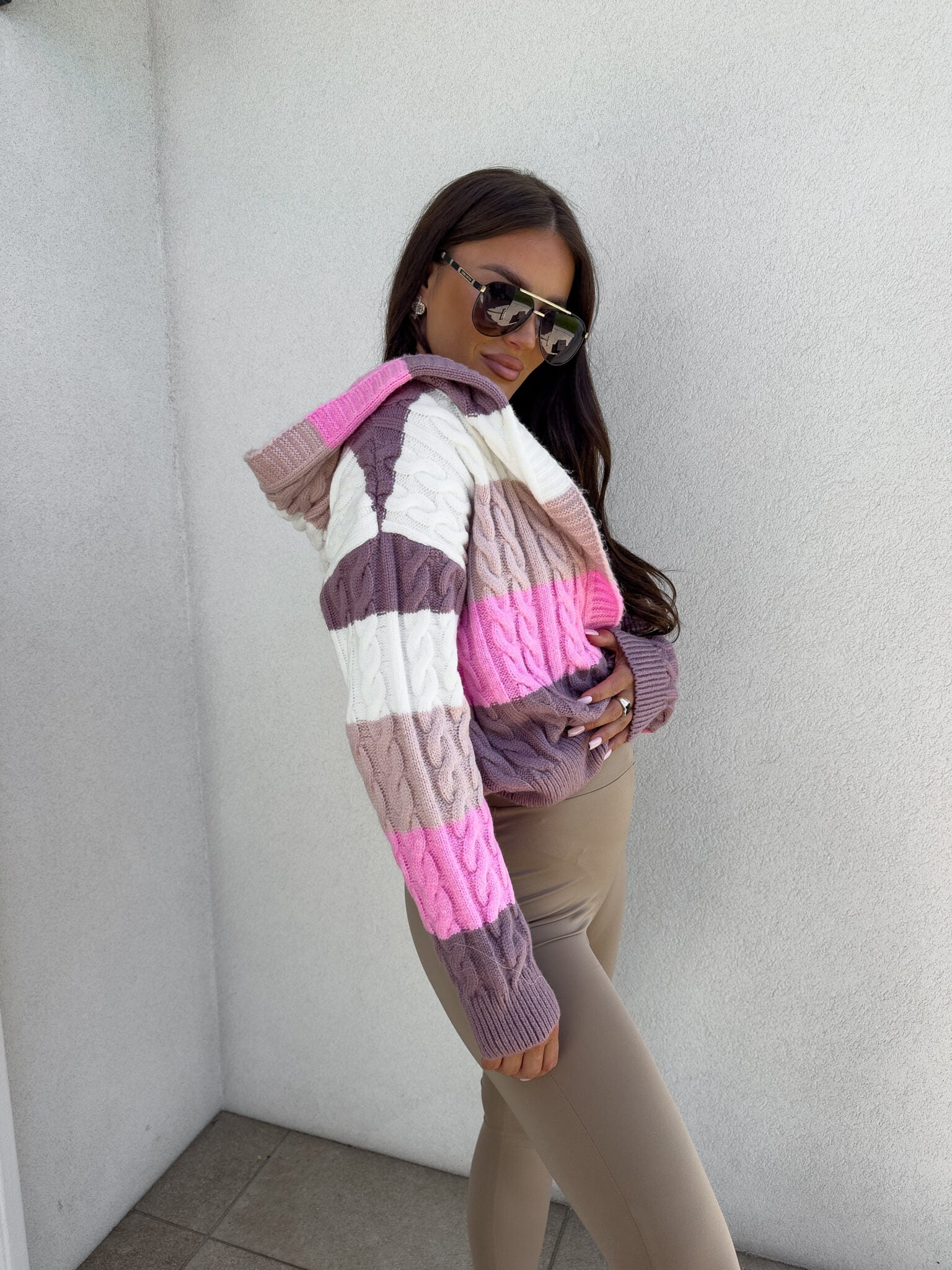 Strickpullover mit Kapuze, aus einem dicken, geflochtenen Material mit markantem Maschenmuster gefertigt. Die Ärmel und der Saum sind mit einem Rippbündchen abgeschlossen.