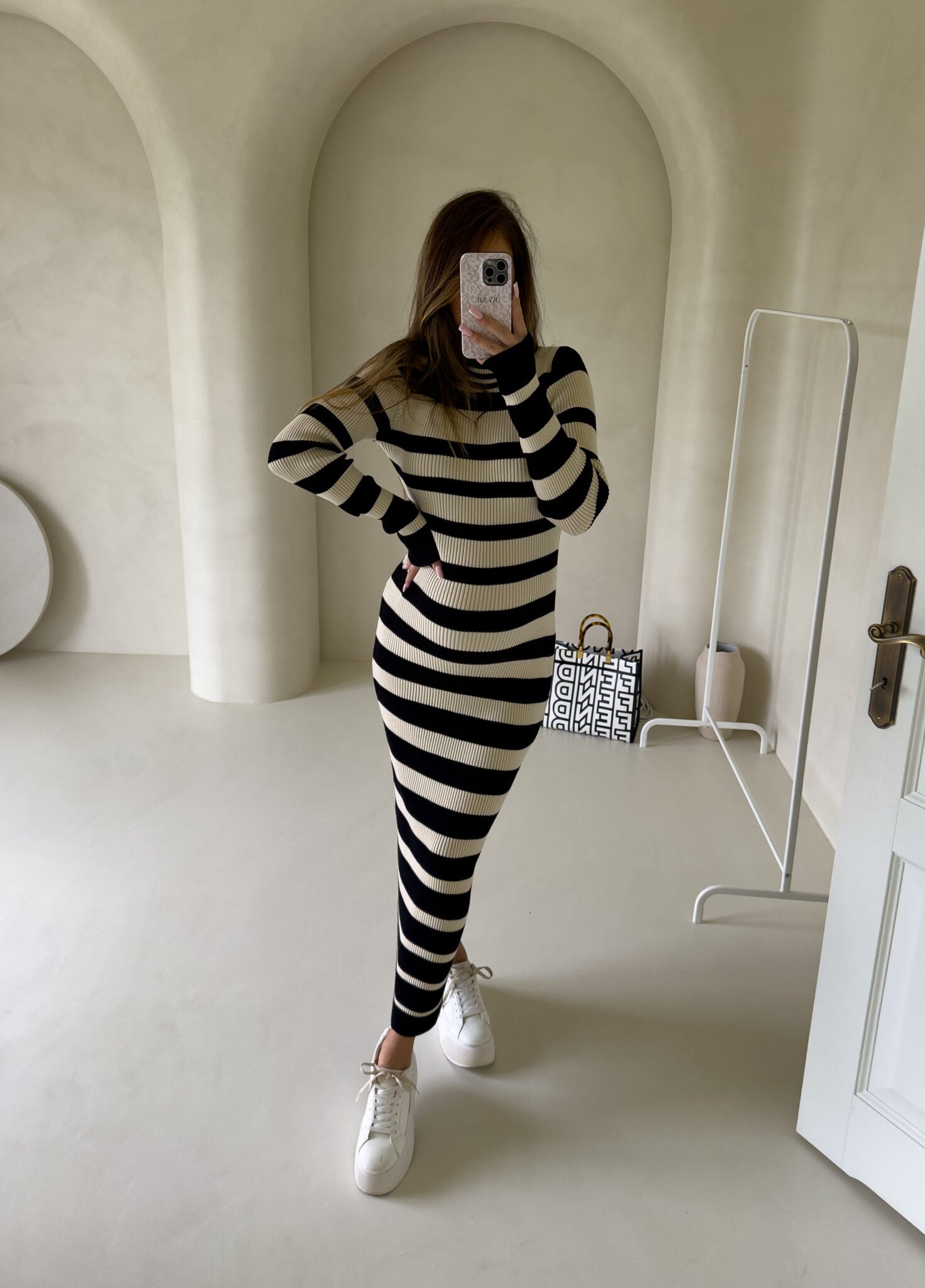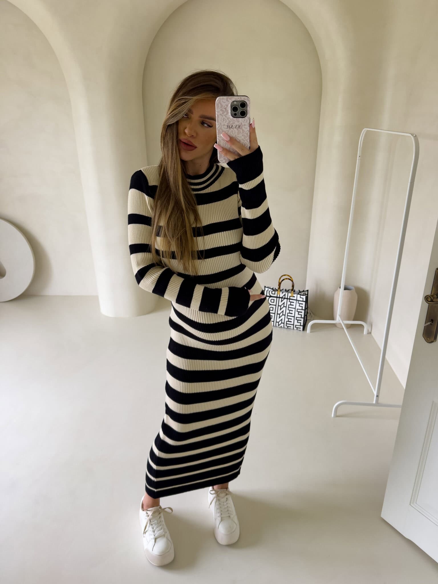 Strickkleid, mit klassischen horizontalen Streifen versehen. Bei einem langen Ärmel reicht es bis zu den Knöcheln, was ihm einen eleganten und minimalistischen Look verleiht. Das Muster der Streifen ist regelmäßig, was die Silhouette visuell betont. Das gerippte Material ist ein gestricktes Gewebe, das sich gut an den Körper anpasst.