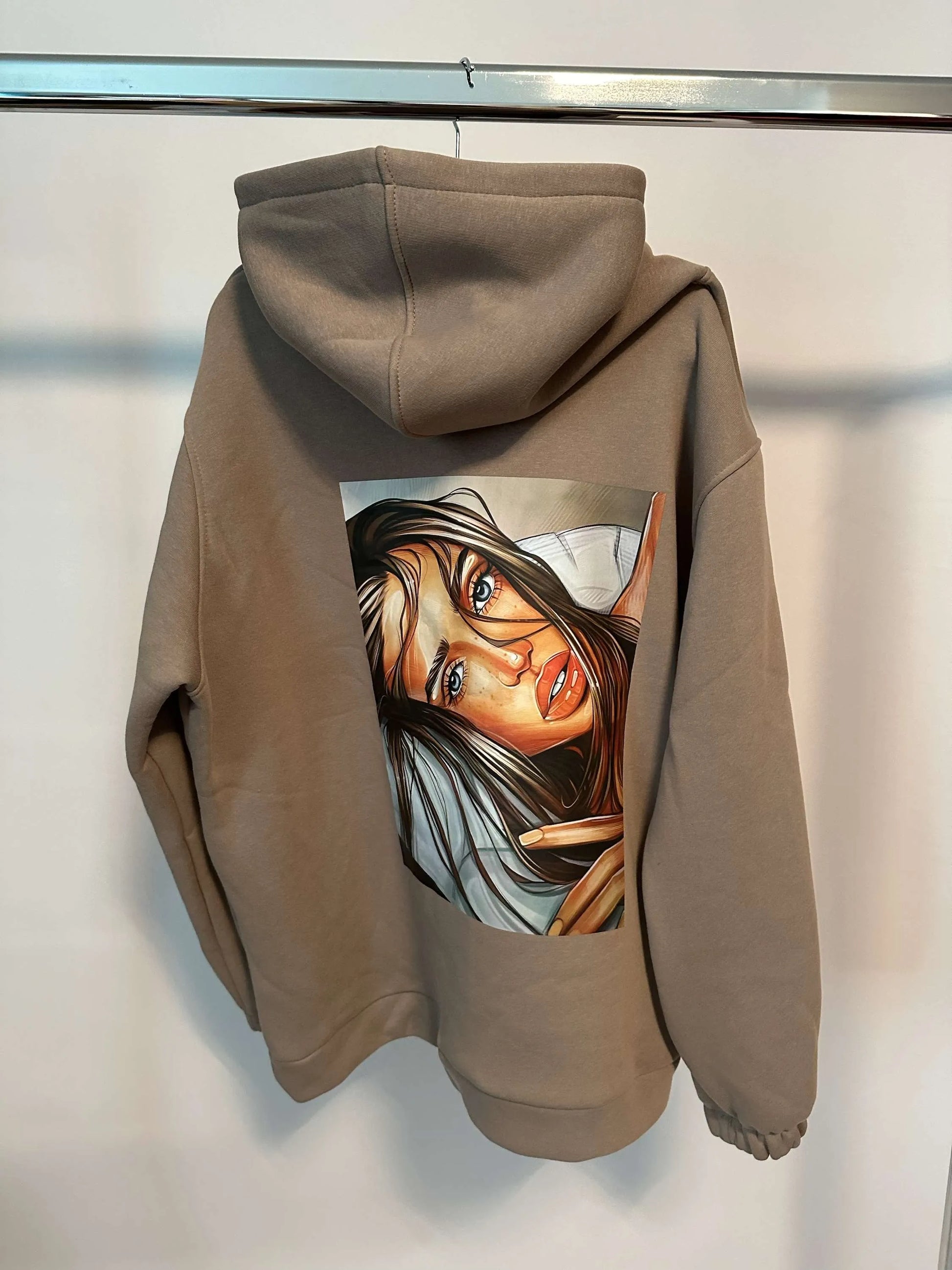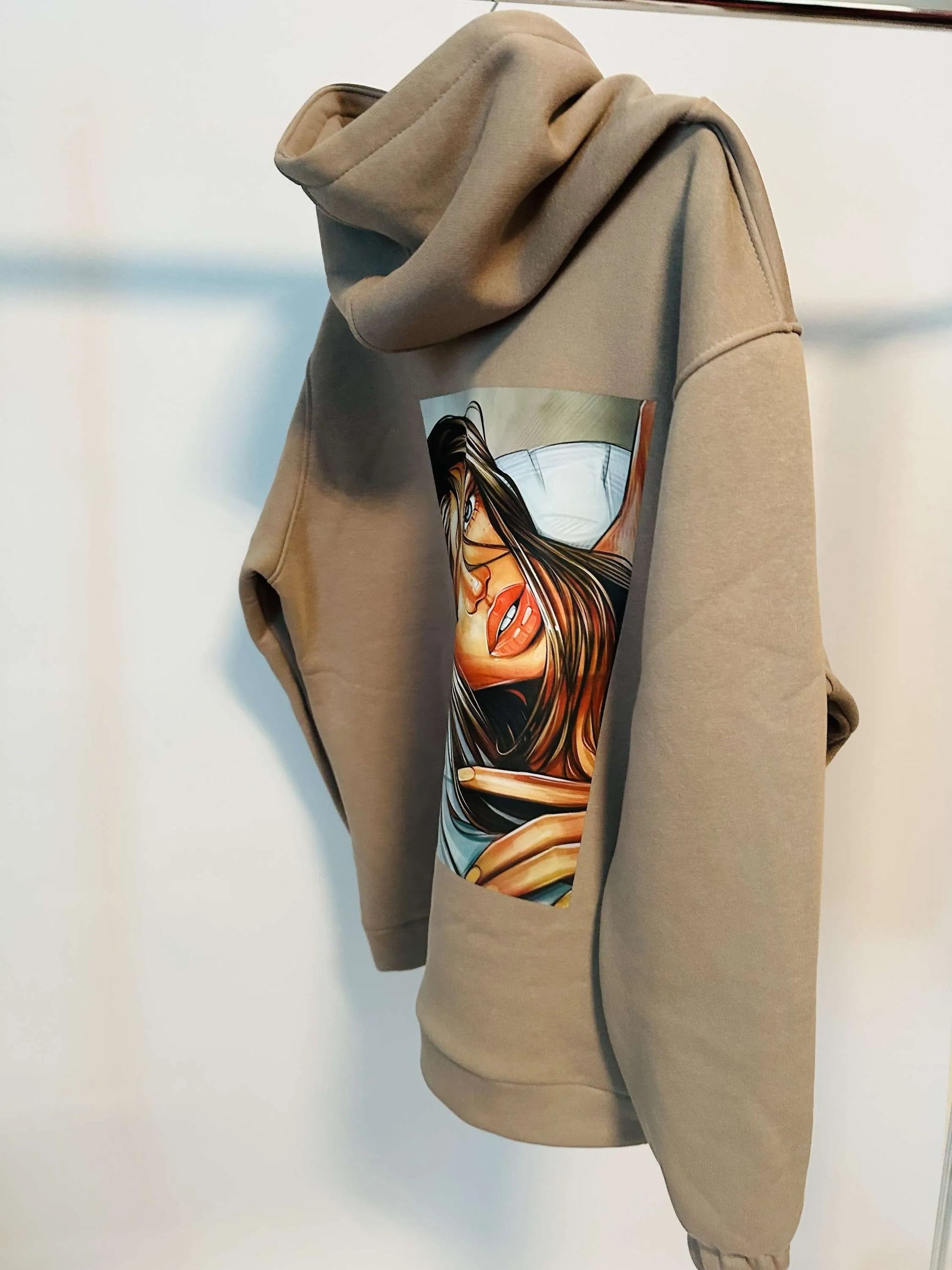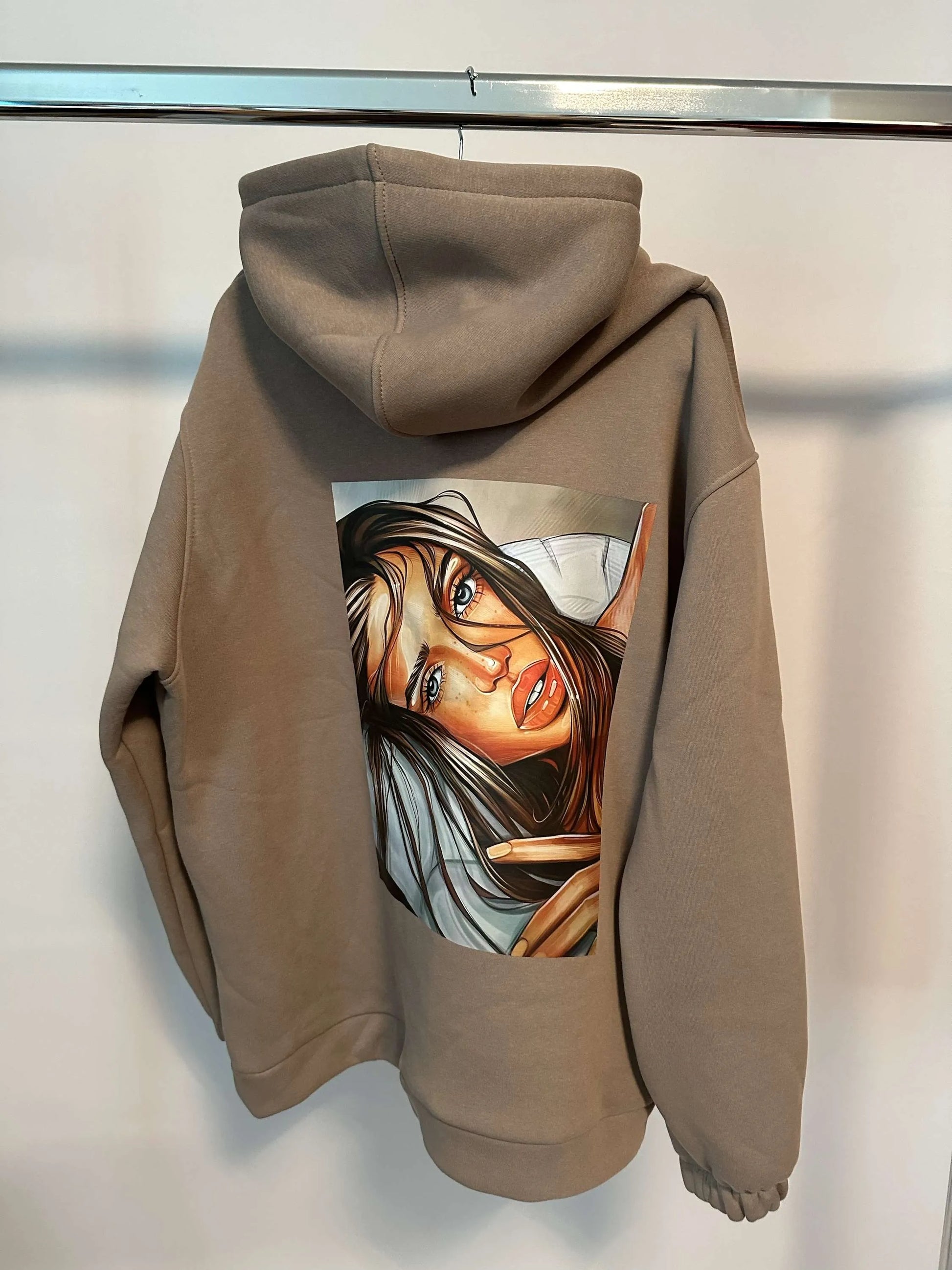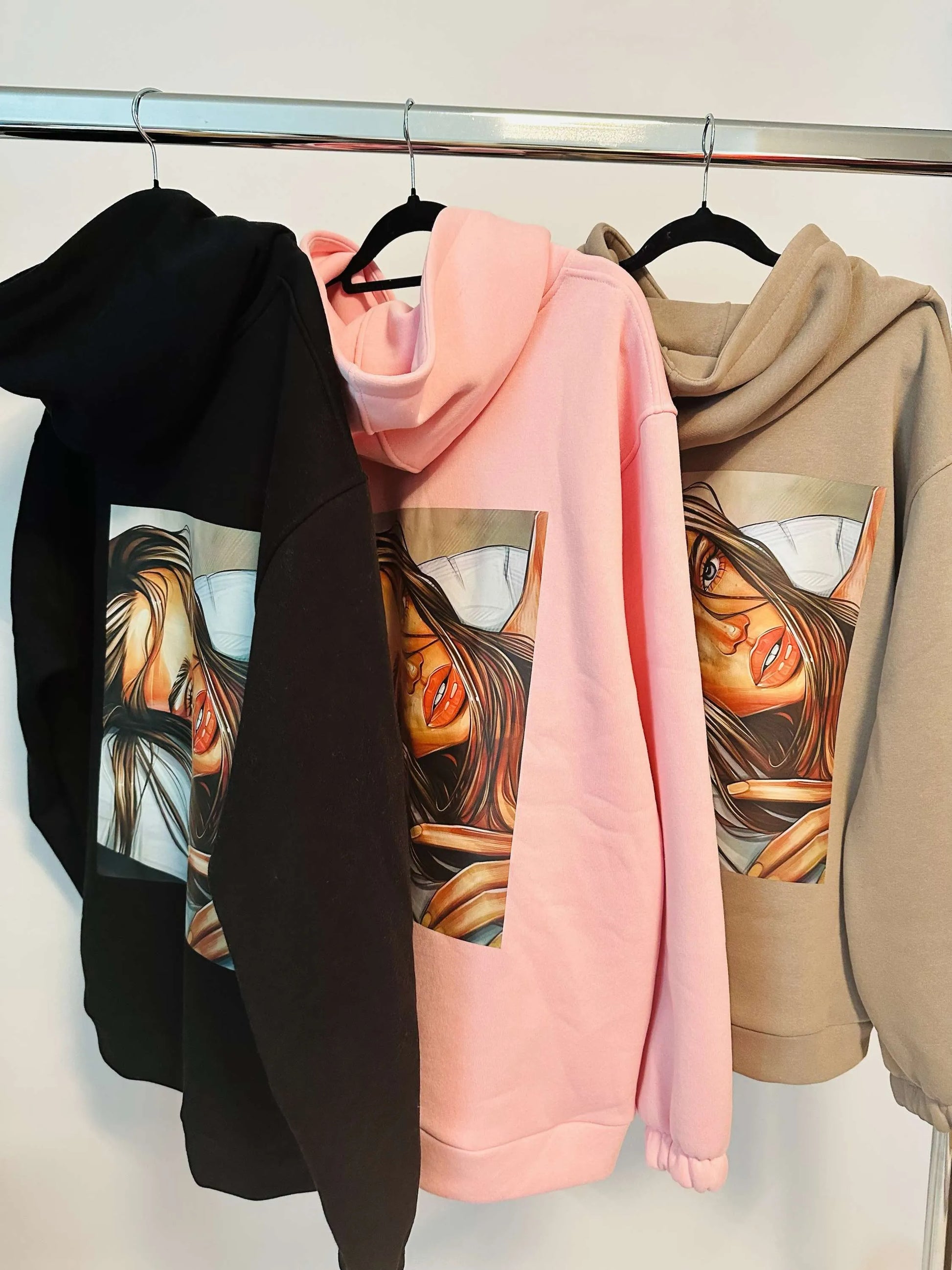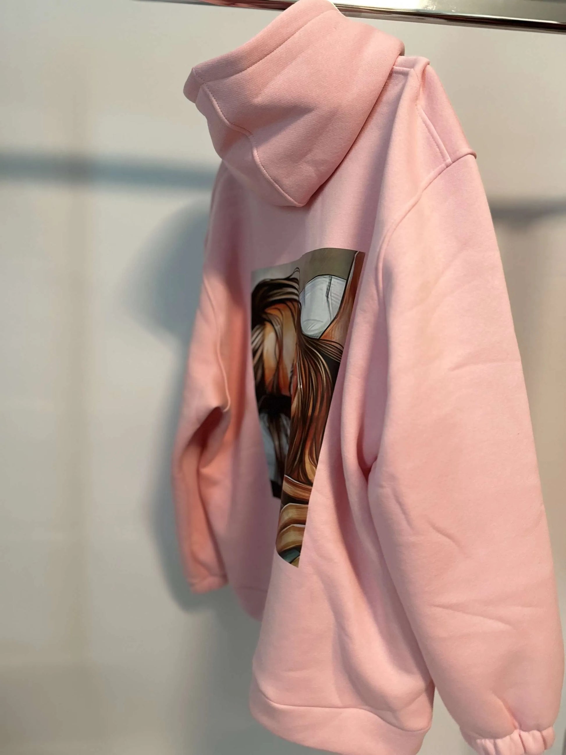 Lange Damen Sweatshirt mit Kapuze und moderner Motiv am Rücken.