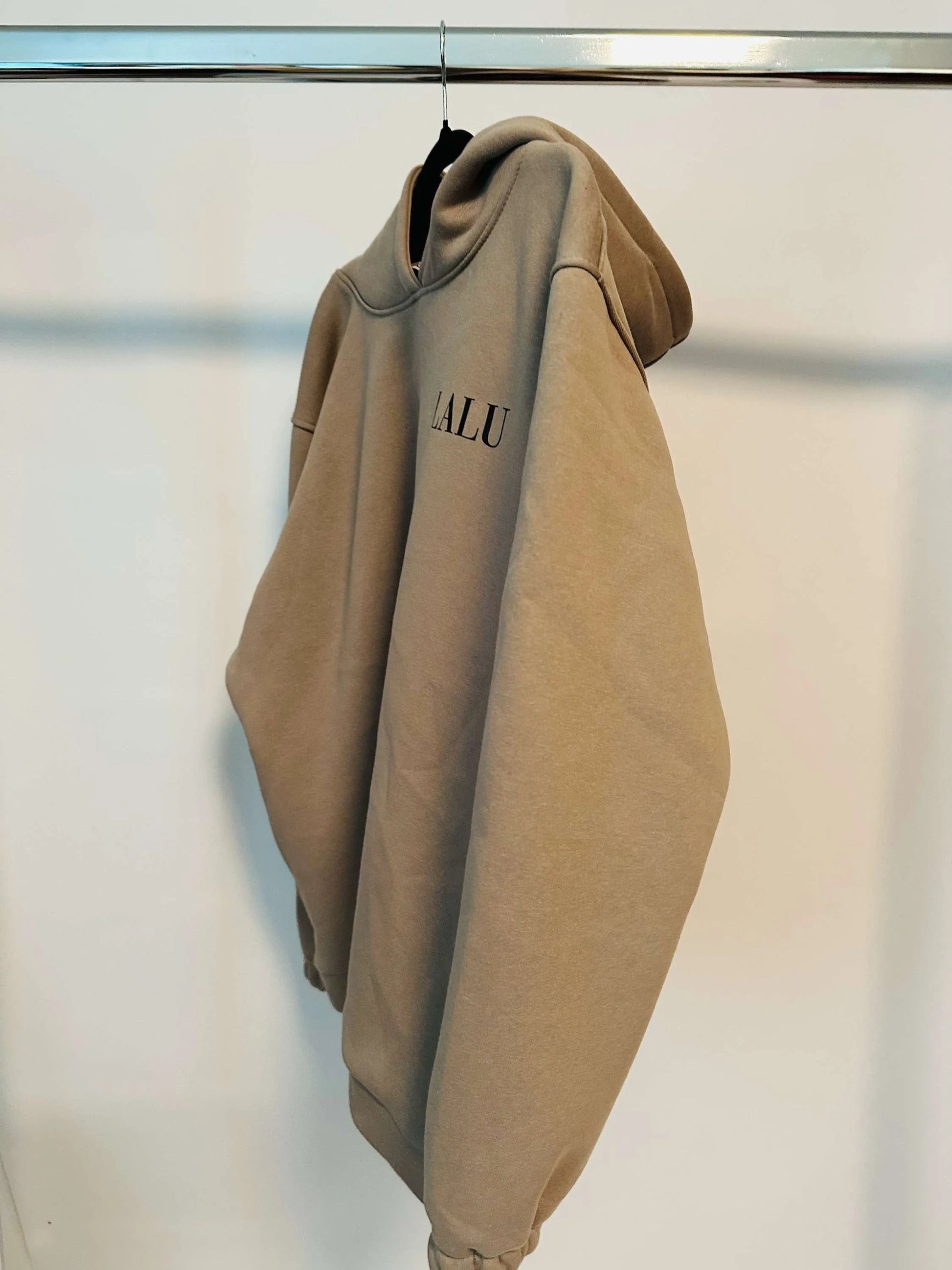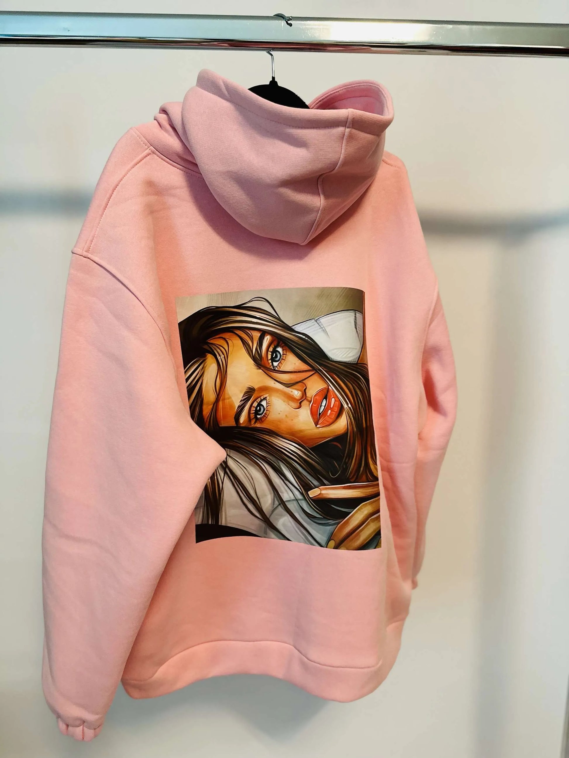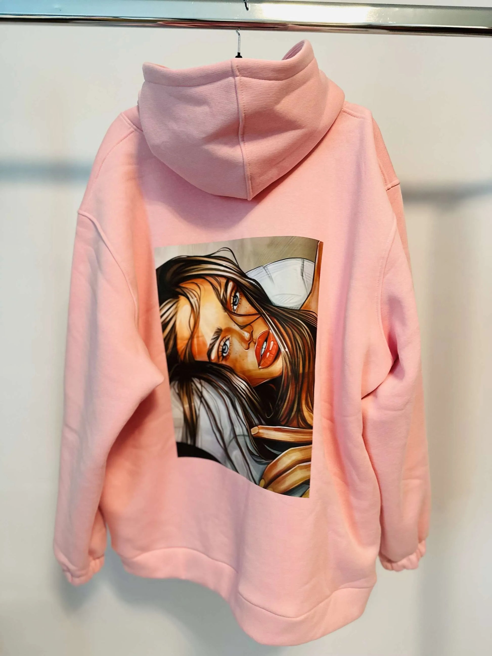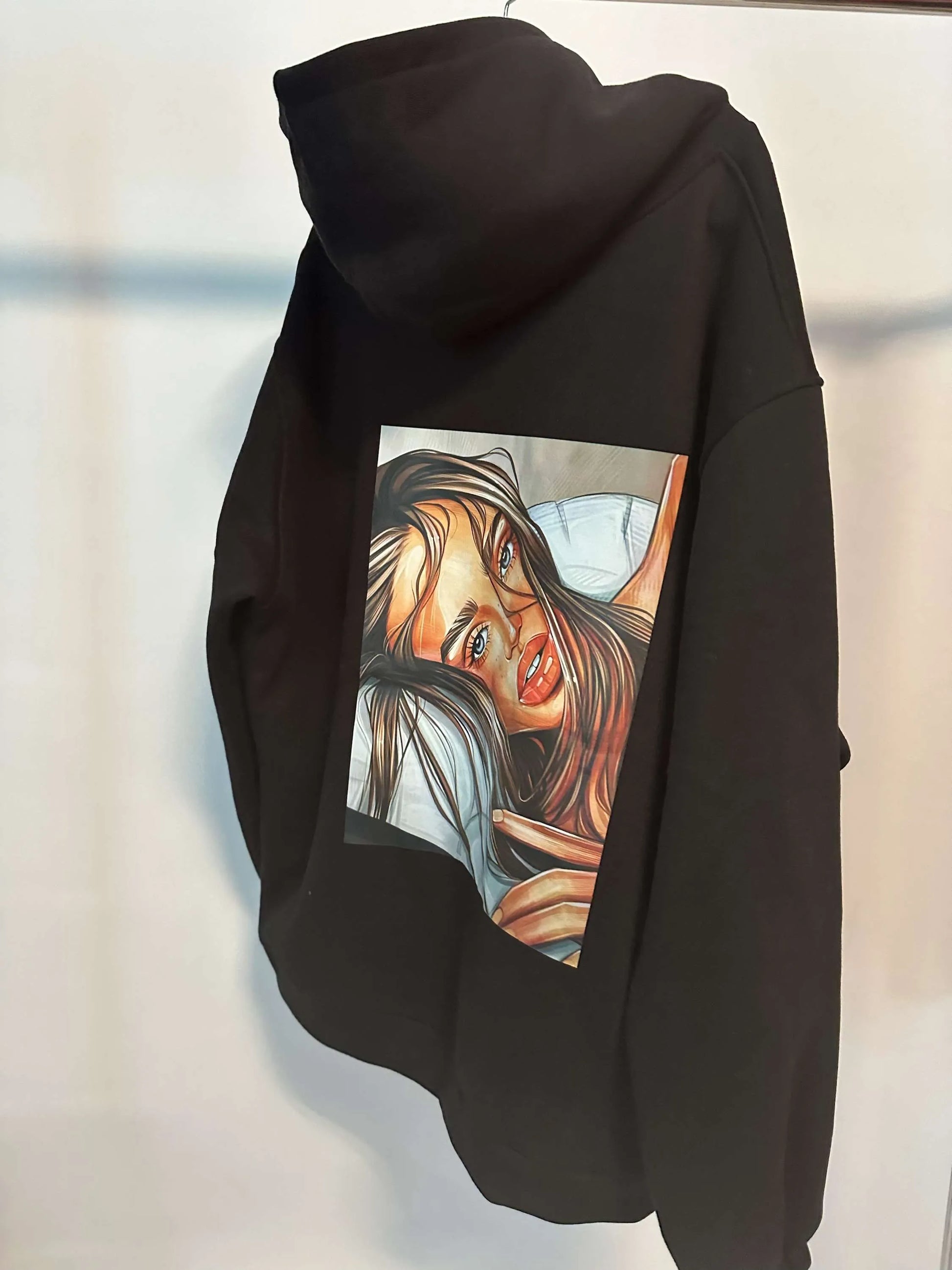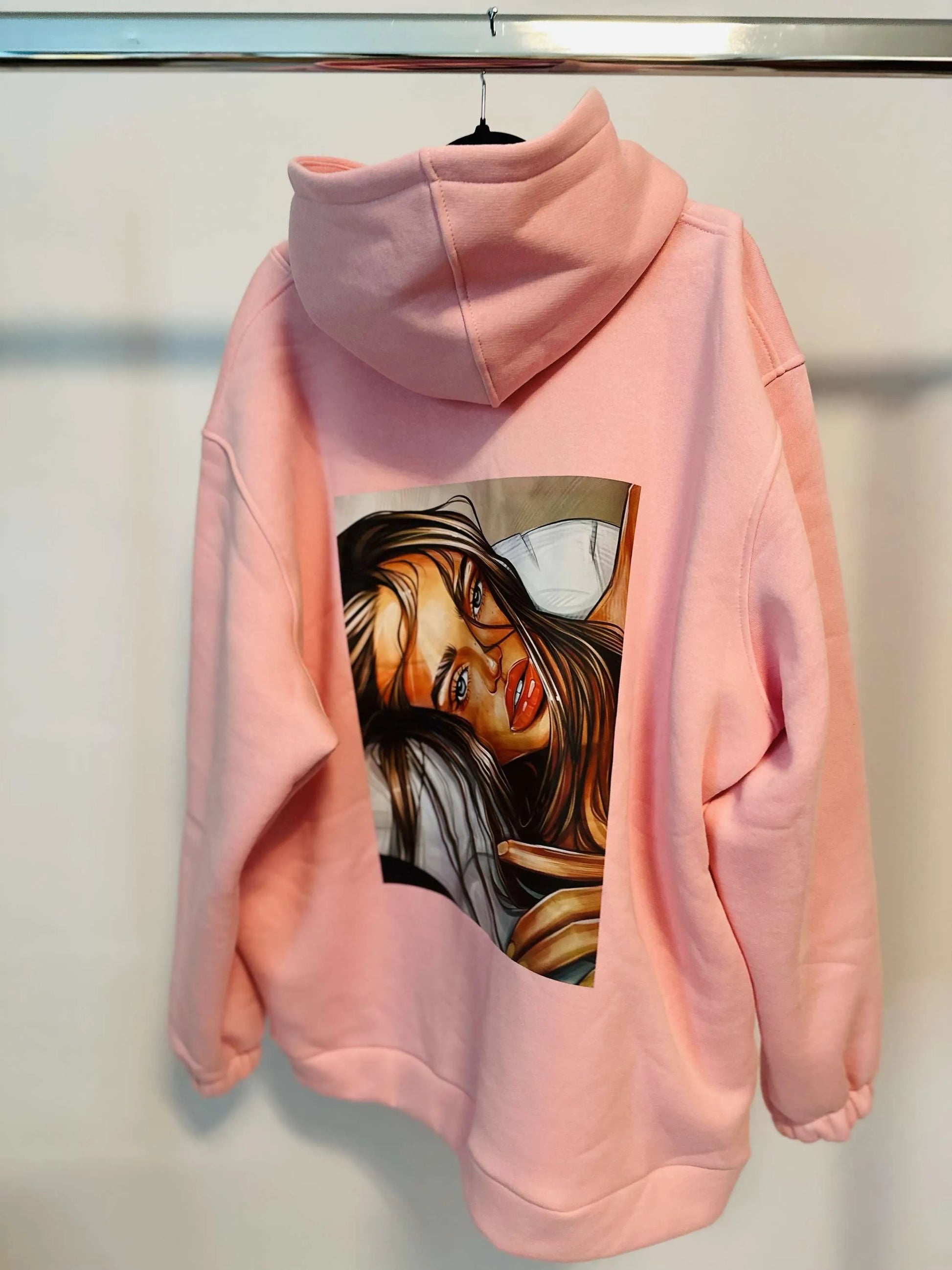 Lange Damen Sweatshirt mit Kapuze und moderner Motiv am Rücken.