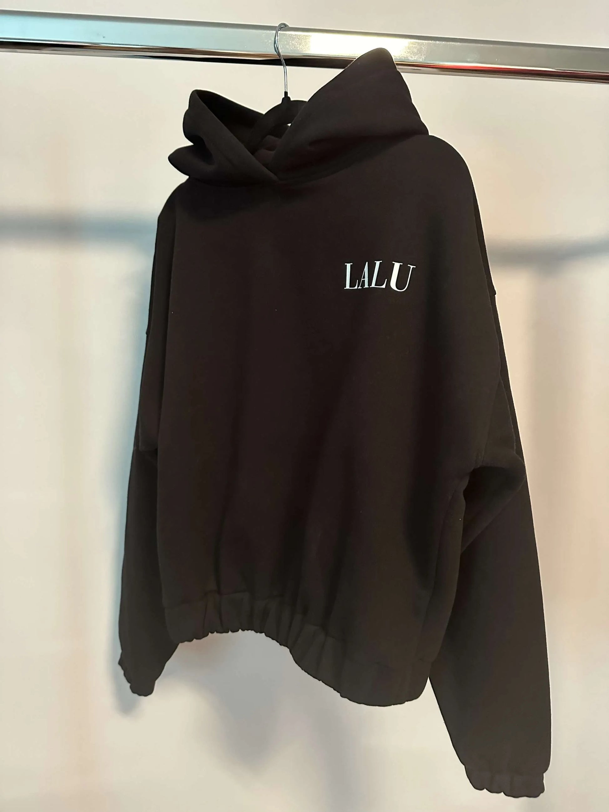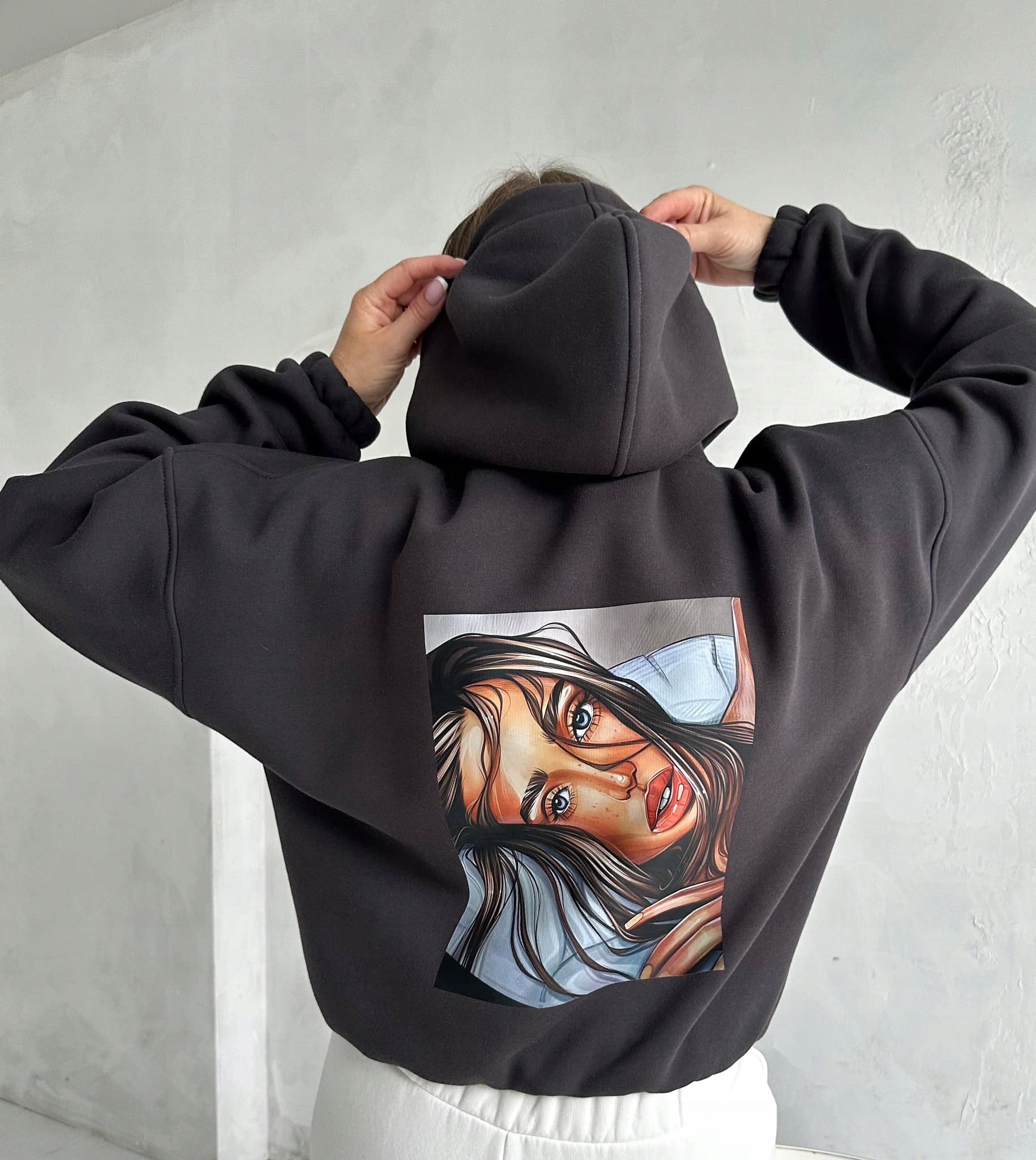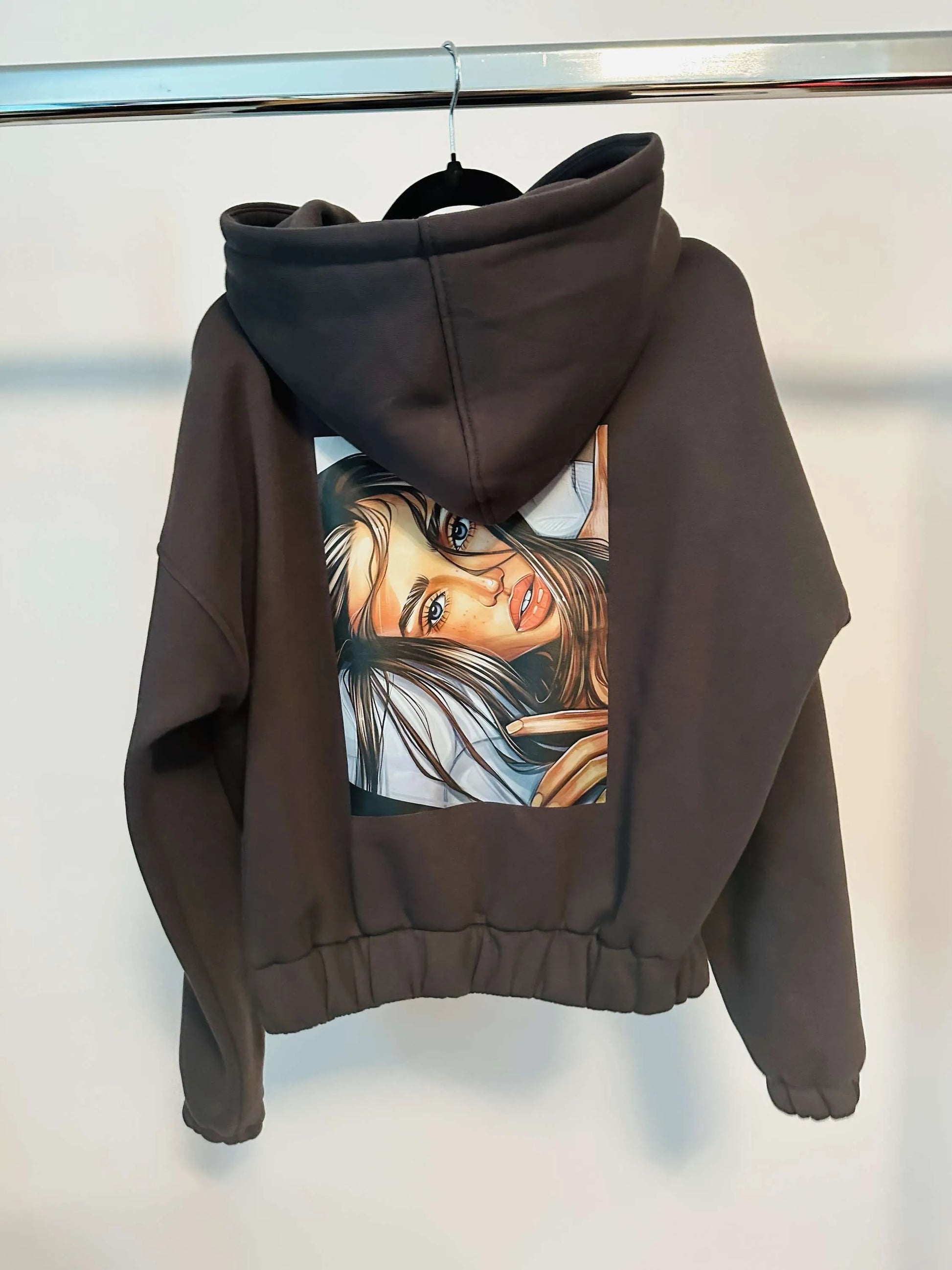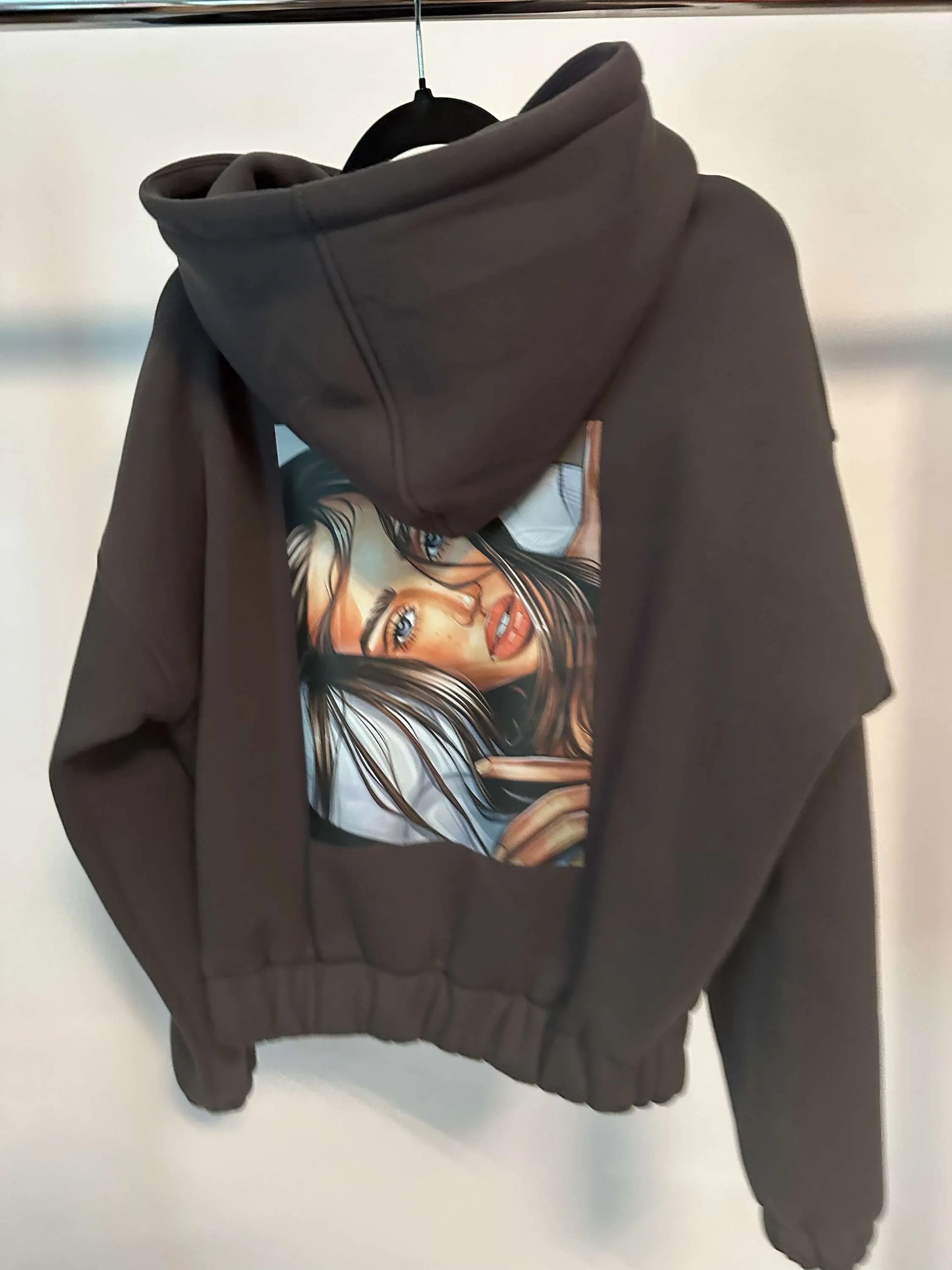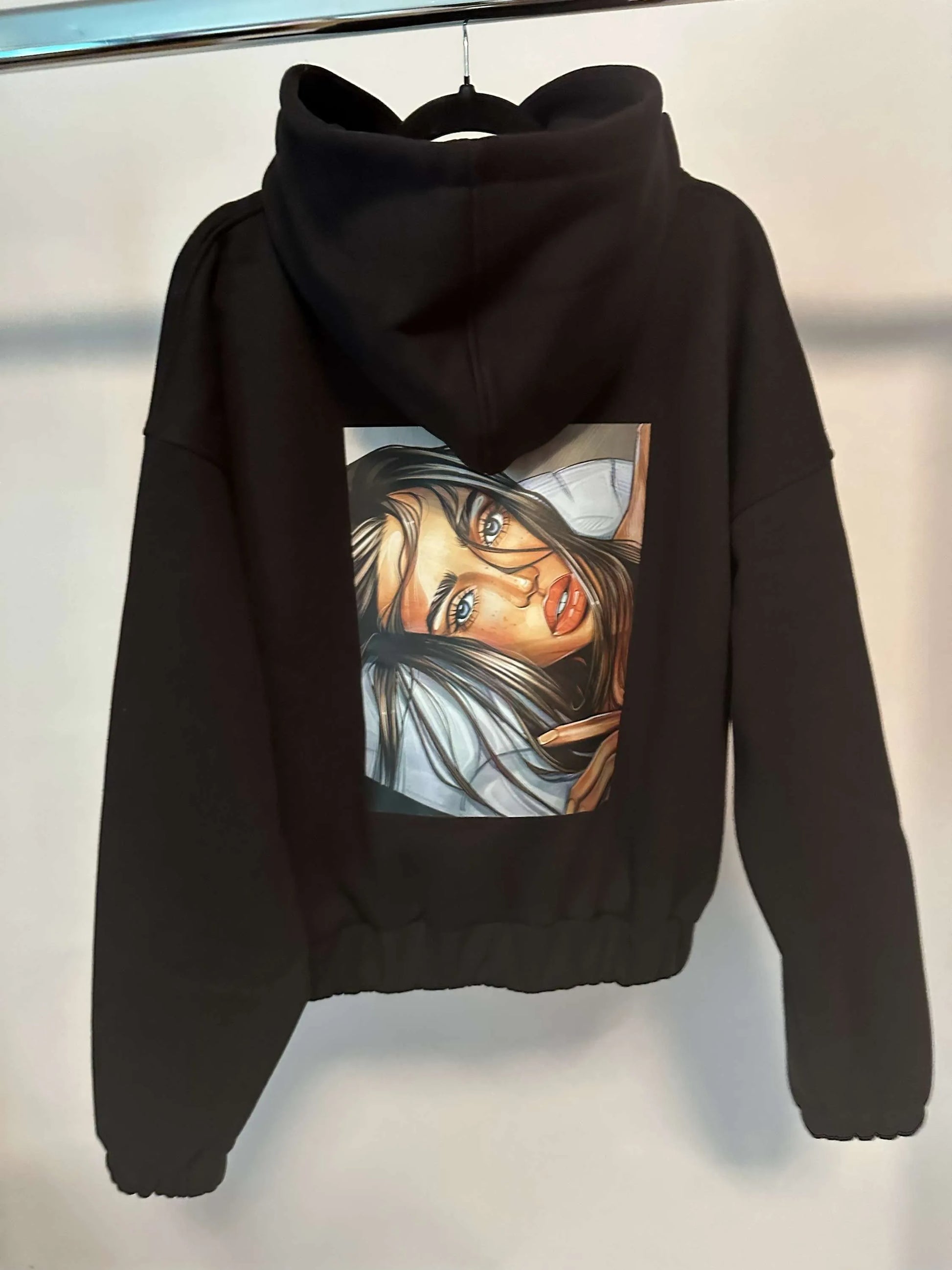 Sweatshirt mit Kapuze und moderner Motiv am Rücken.