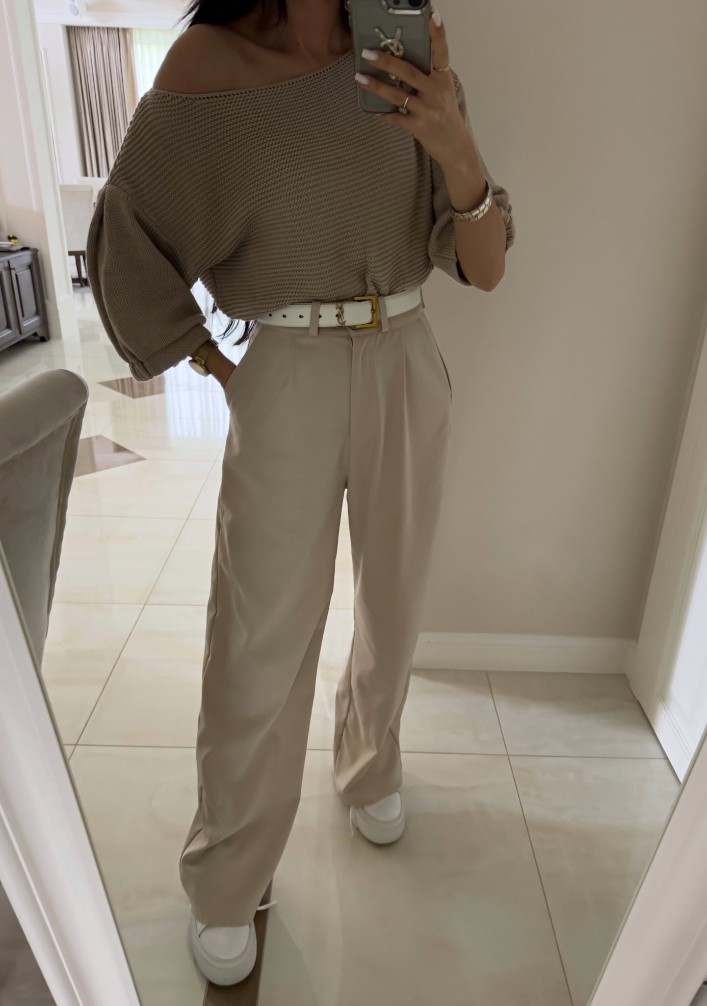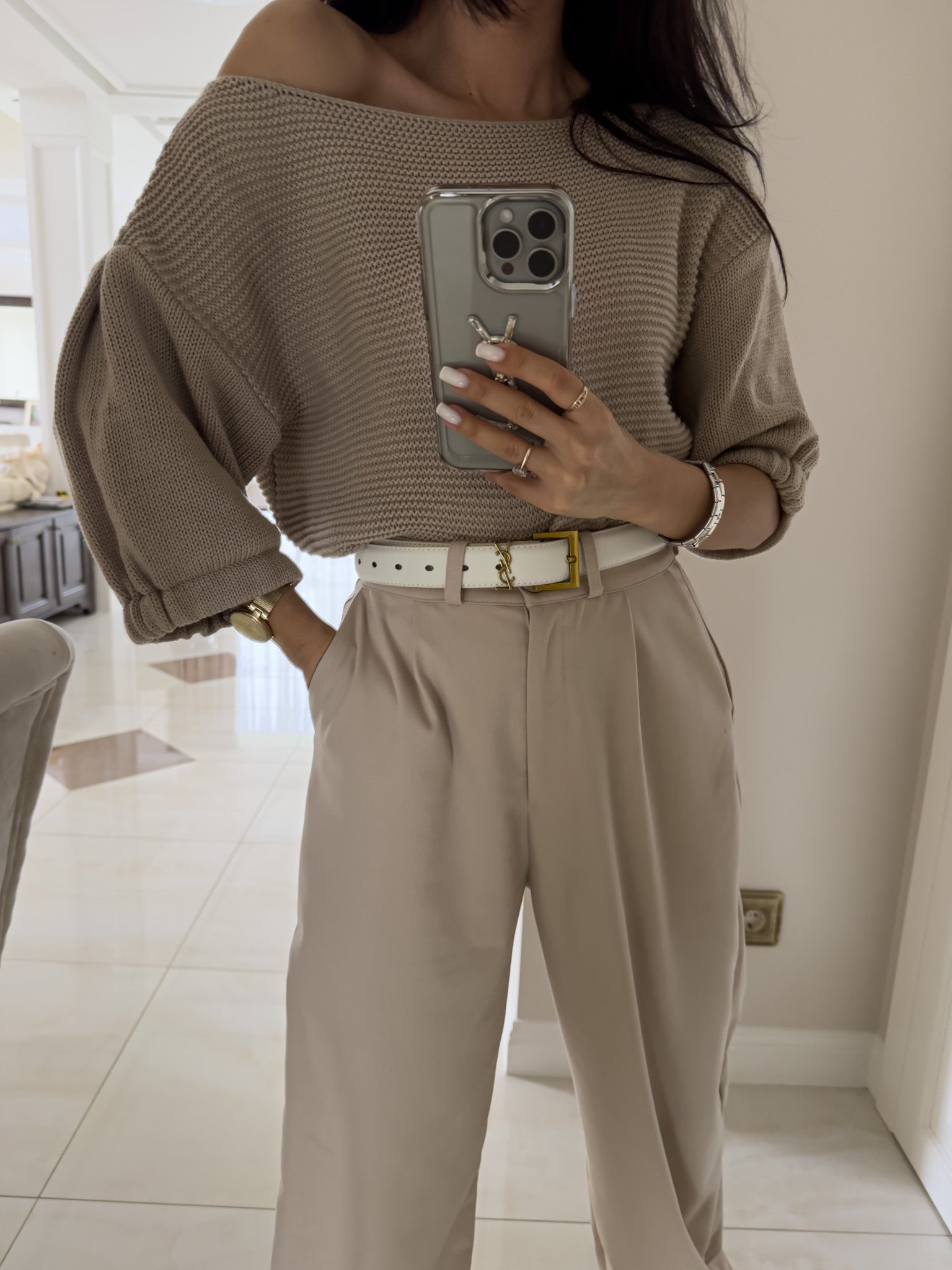 Lockerer, gestrickter Pullover mit 3/4 Ärmeln, leicht geschwollen, was dem Styling Licht verleiht. Breiter Ausschnitt, der auf eine Schulter fällt - verleiht dem Stil Weiblichkeit. Dies ist der perfekte Pullover für kältere Tage, der sowohl zu eleganten Hosen als auch zu