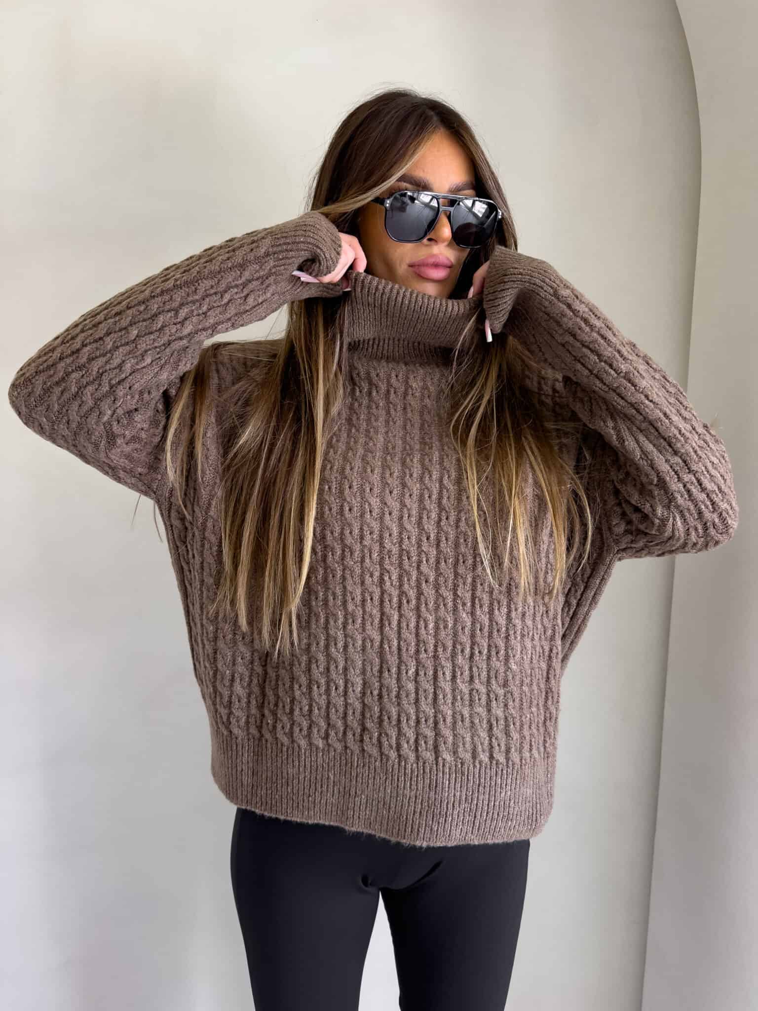 Rollkragenpullover, über dem Kopf angezogen, auf einem langen Ärmel mit einem interessanten Webart. Sehr warm.