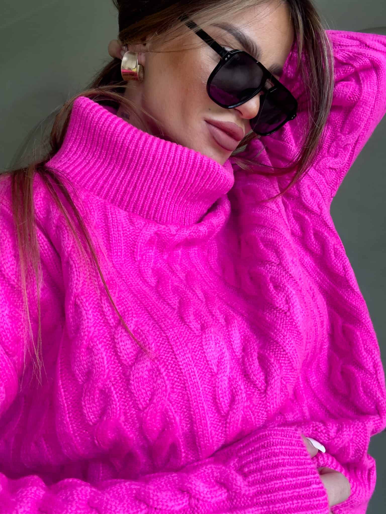 Rollkragenpullover, über dem Kopf angezogen, auf einem langen Ärmel mit einem interessanten Webart. Sehr warm.