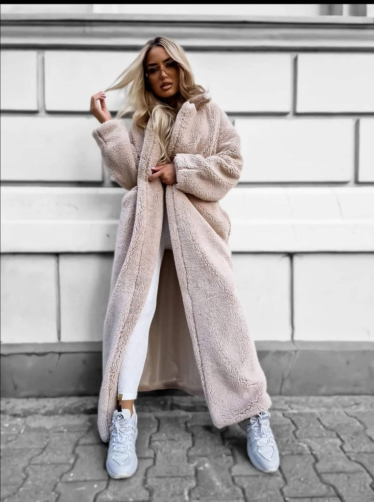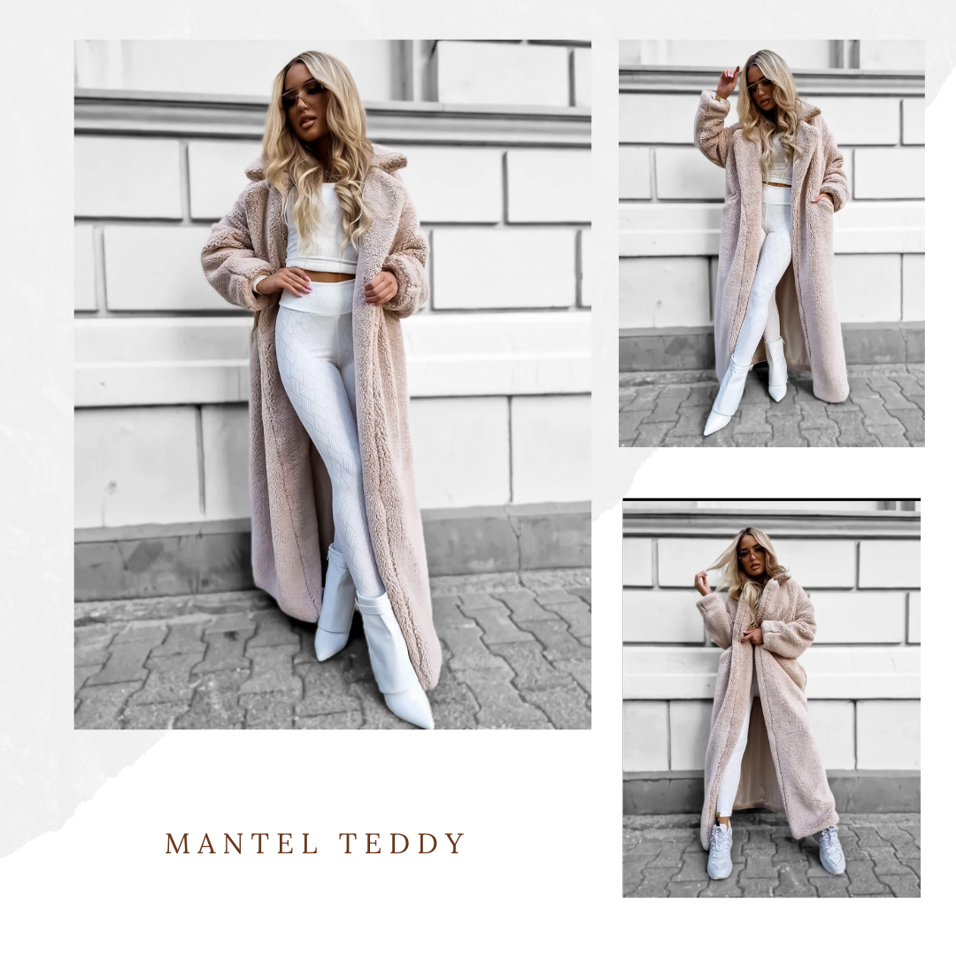 Warmer, angenehm anzufassender Mantel, perfekt für Herbst- und Wintertage. Übergroßes Modell, lockerer Schnitt, vorne mit goldenen Knöpfen geschlossen. Goldverzierungen auf der Rückseite und auf der Klappe verleihen ihm einen luxuriösen Charakter.