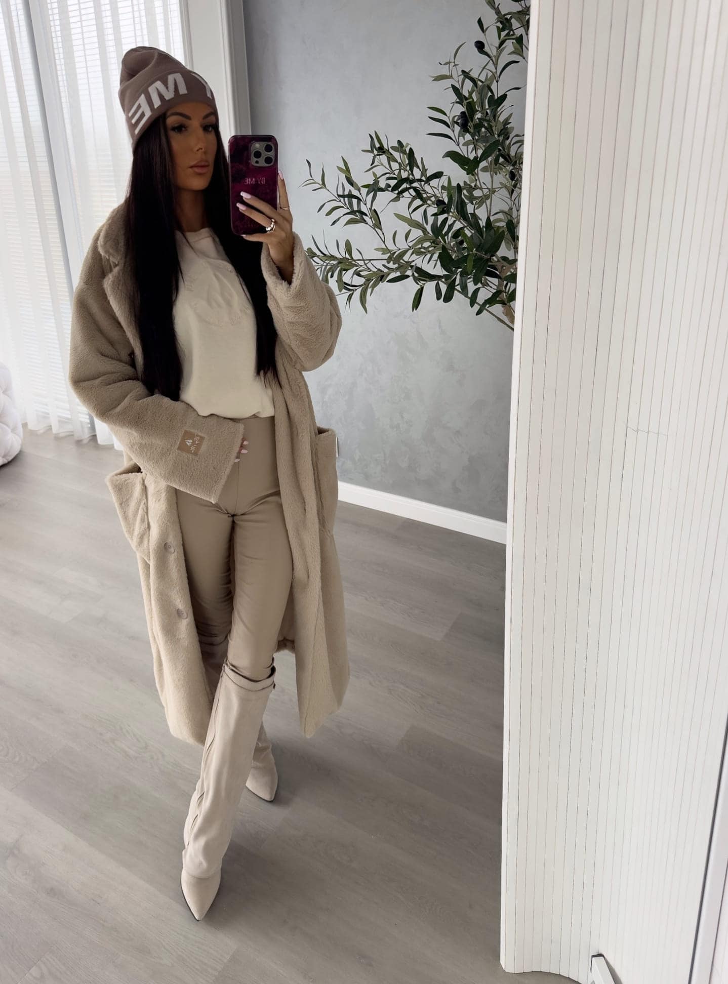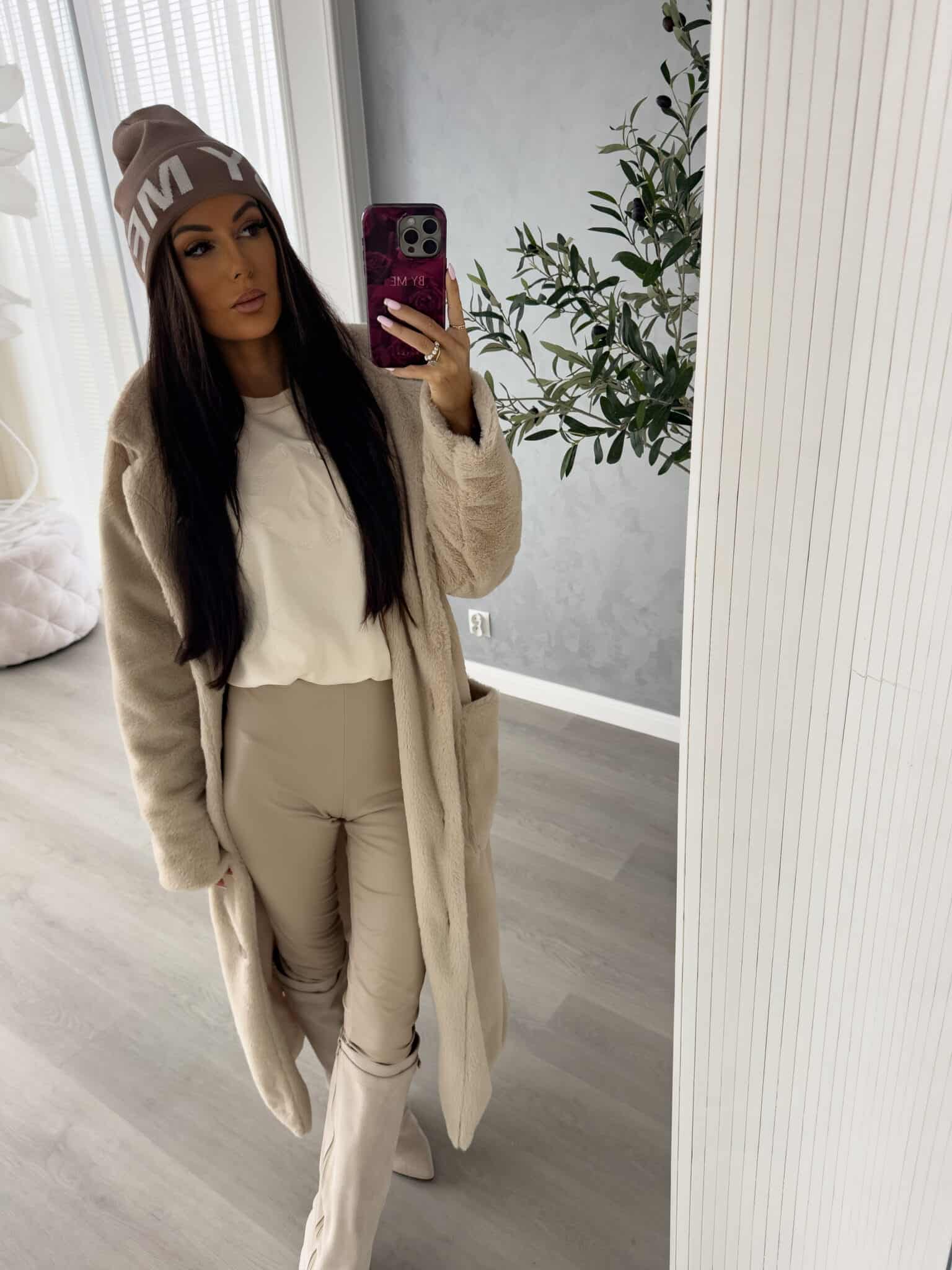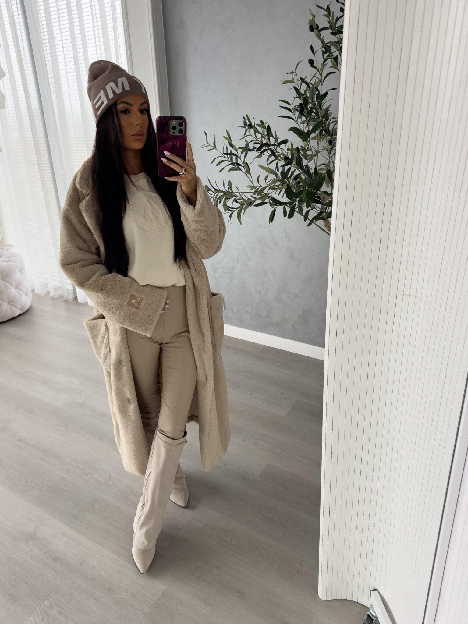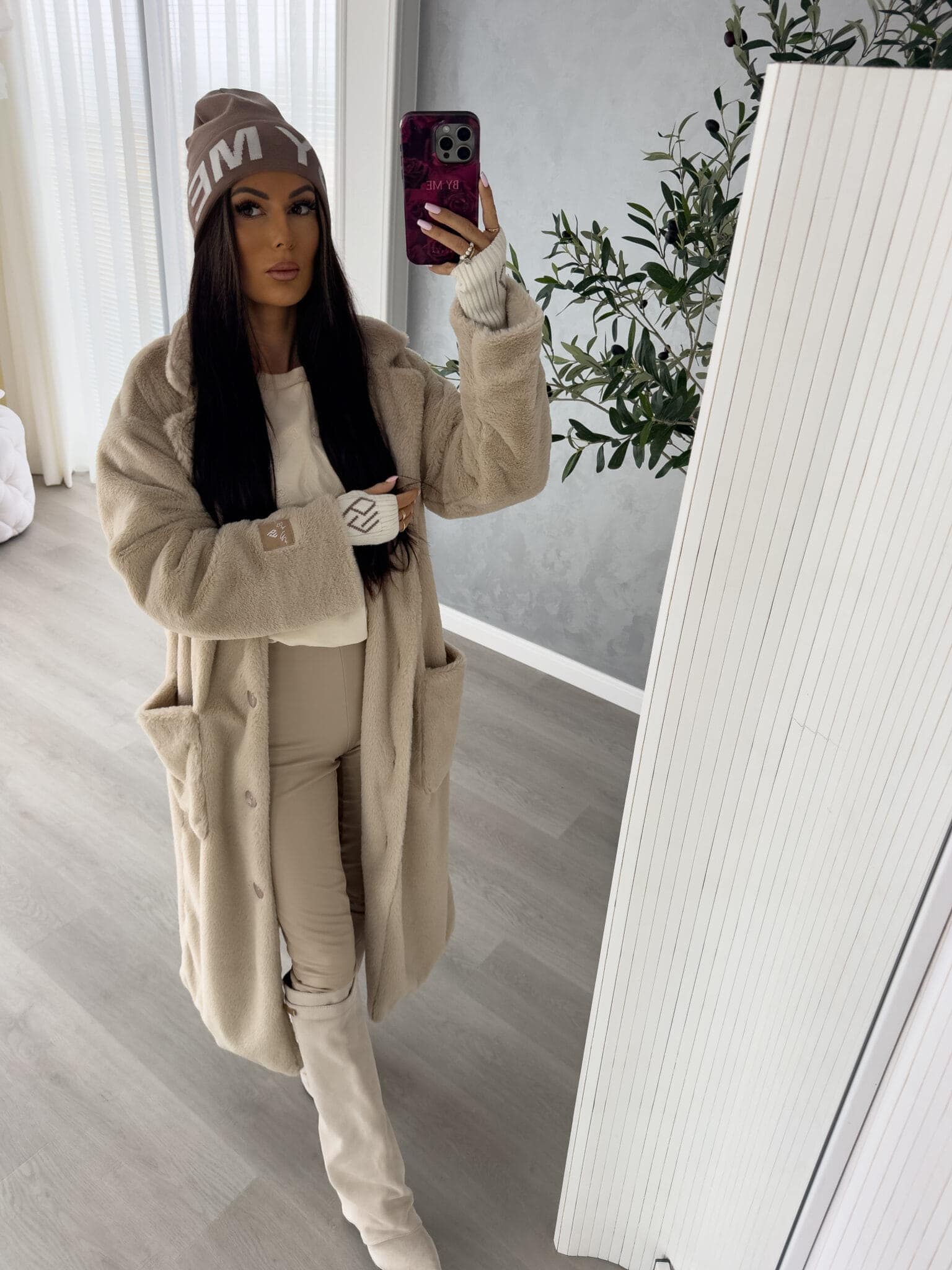 Lange Teddy- Mantel mit Zwei große Taschen vorne.
