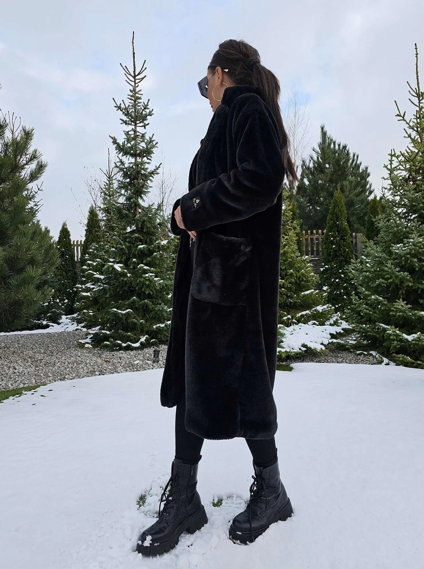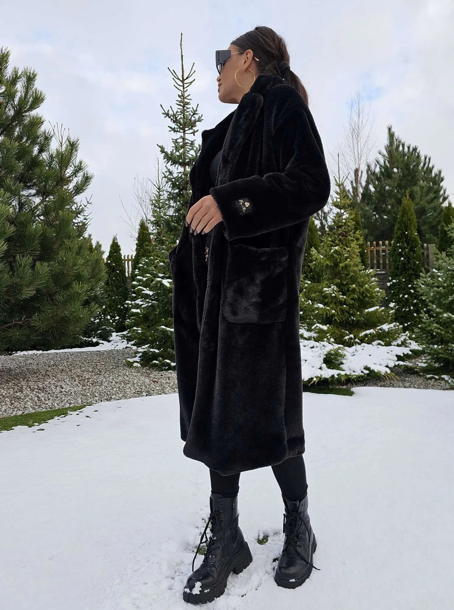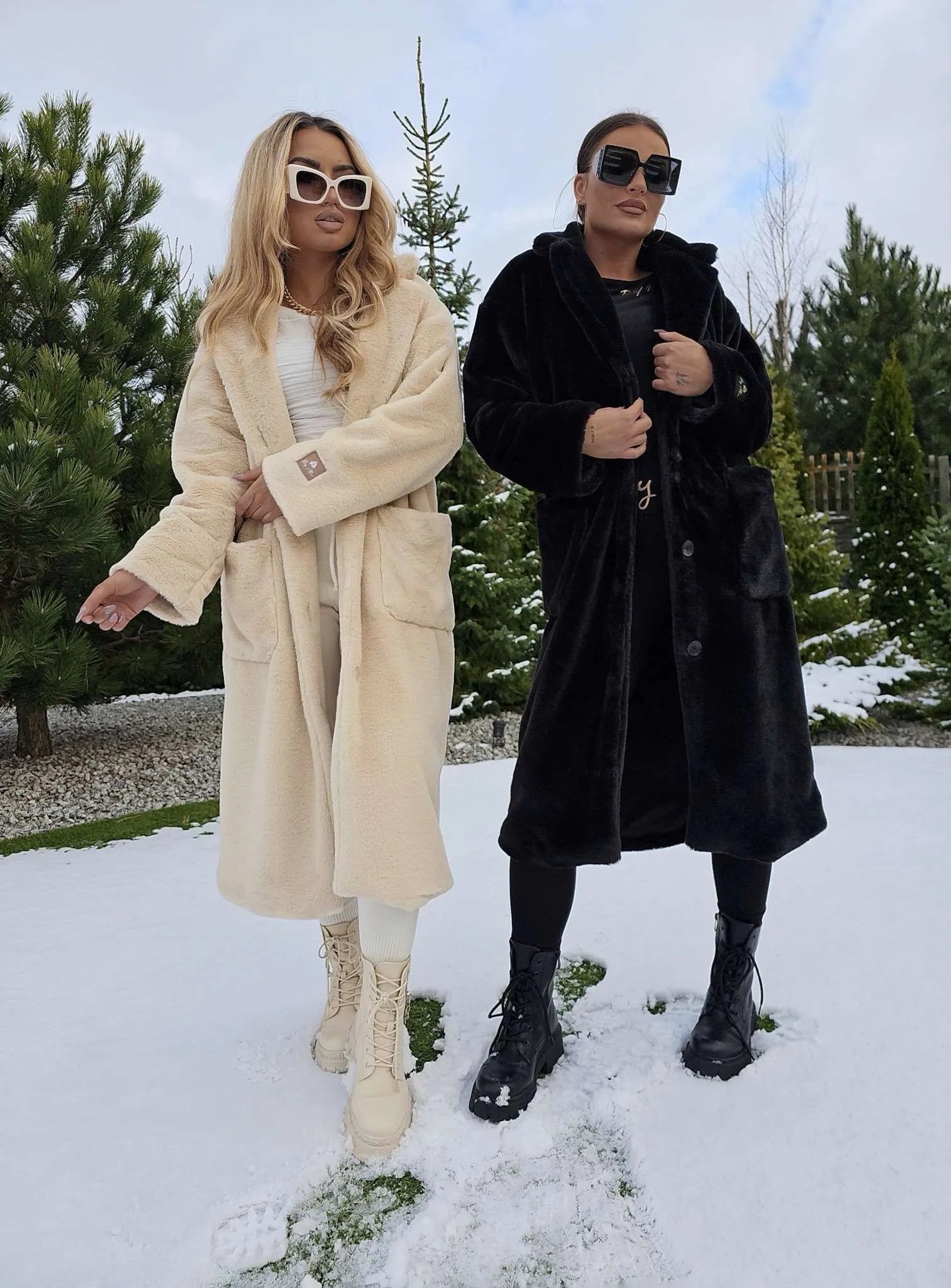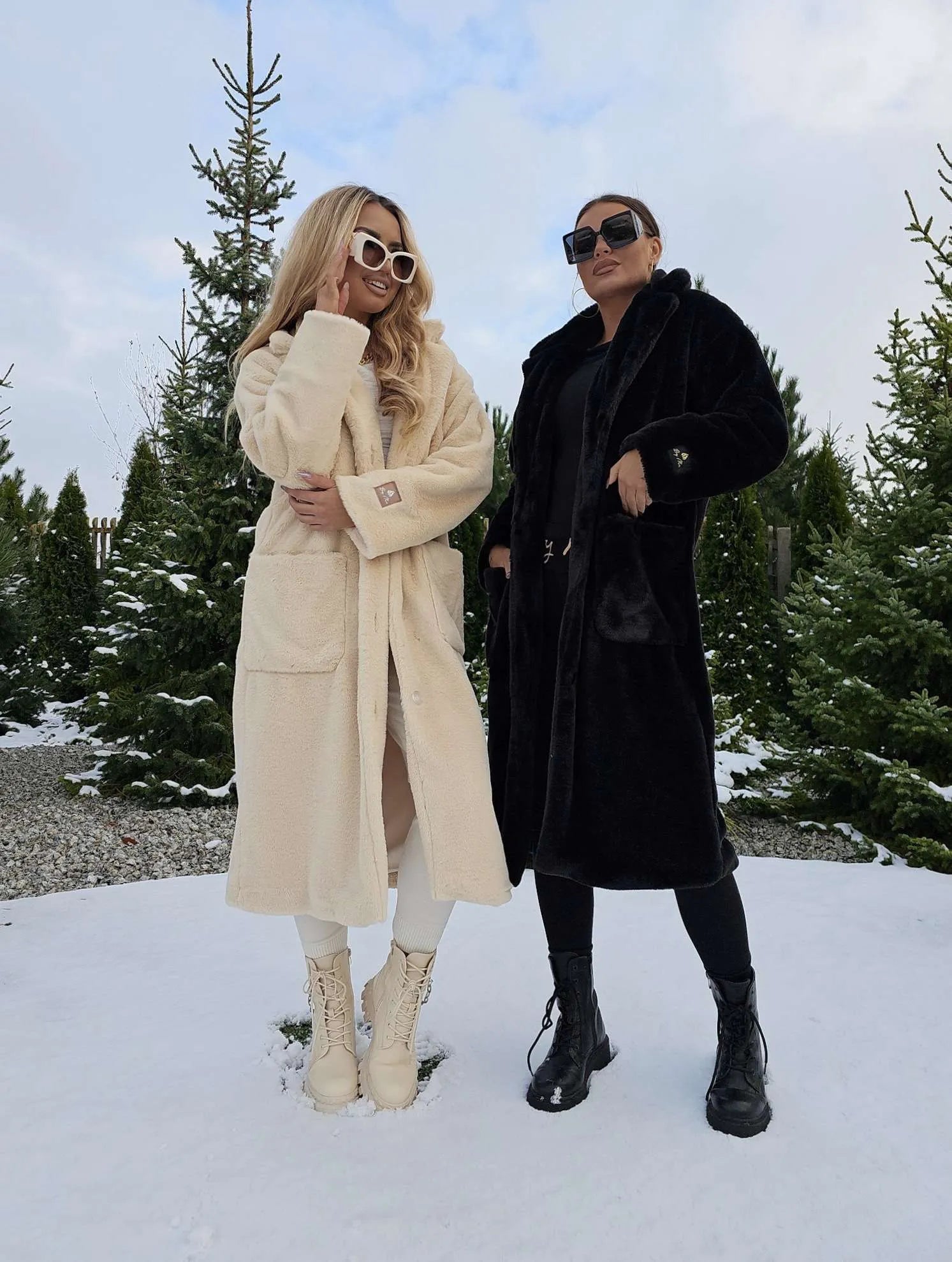 Lange Teddy- Mantel mit Zwei große Taschen vorne.