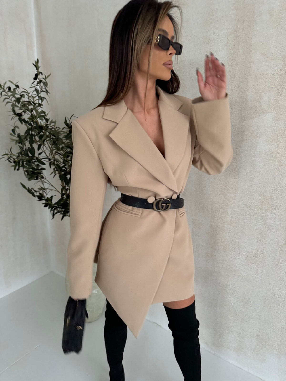 Ein elegantes Blazer- Kleid mit einem einzigartigen asymmetrischen Schnitt, der die Aufmerksamkeit auf sich zieht und dem Styling Charakter verleiht.