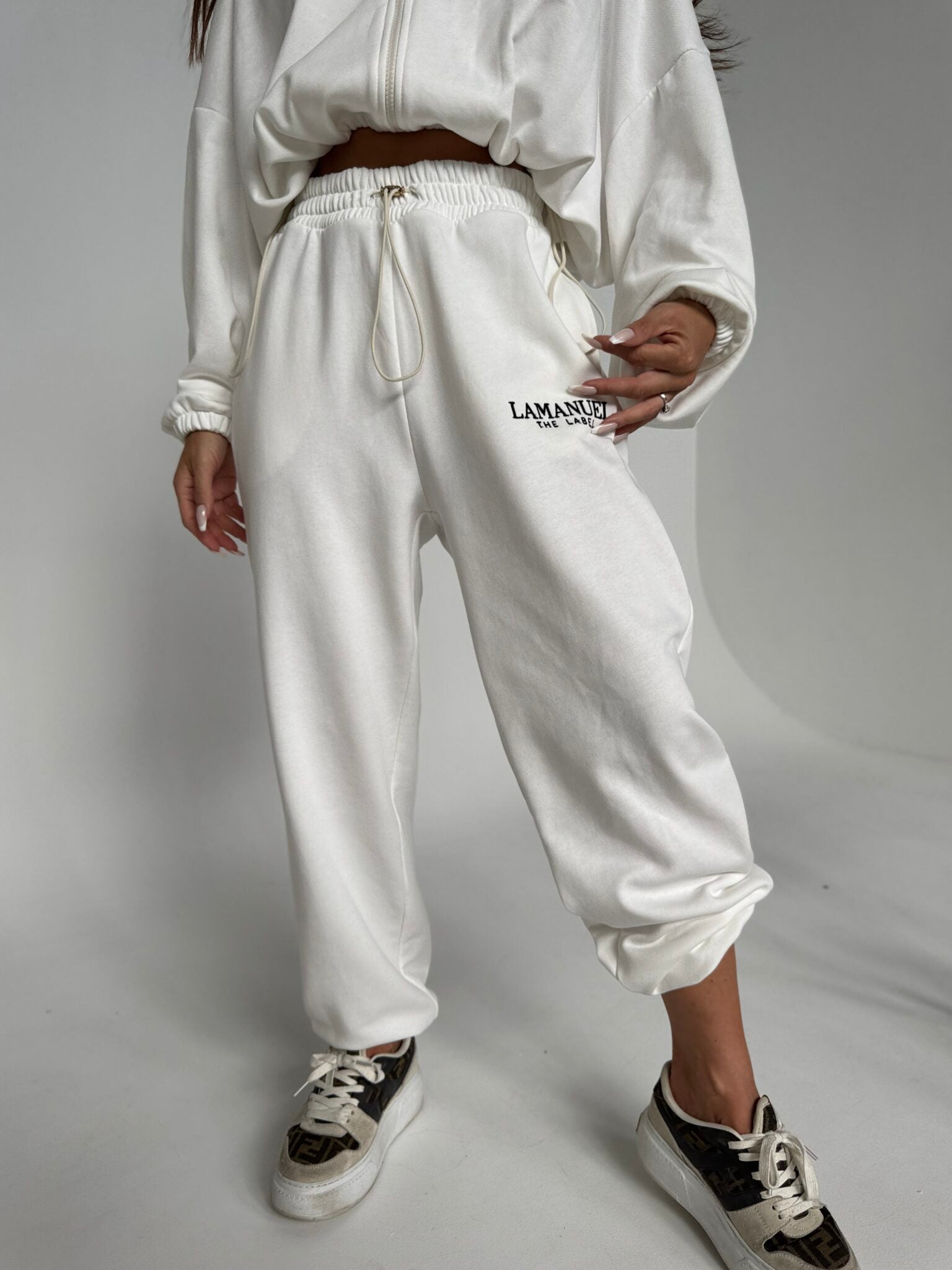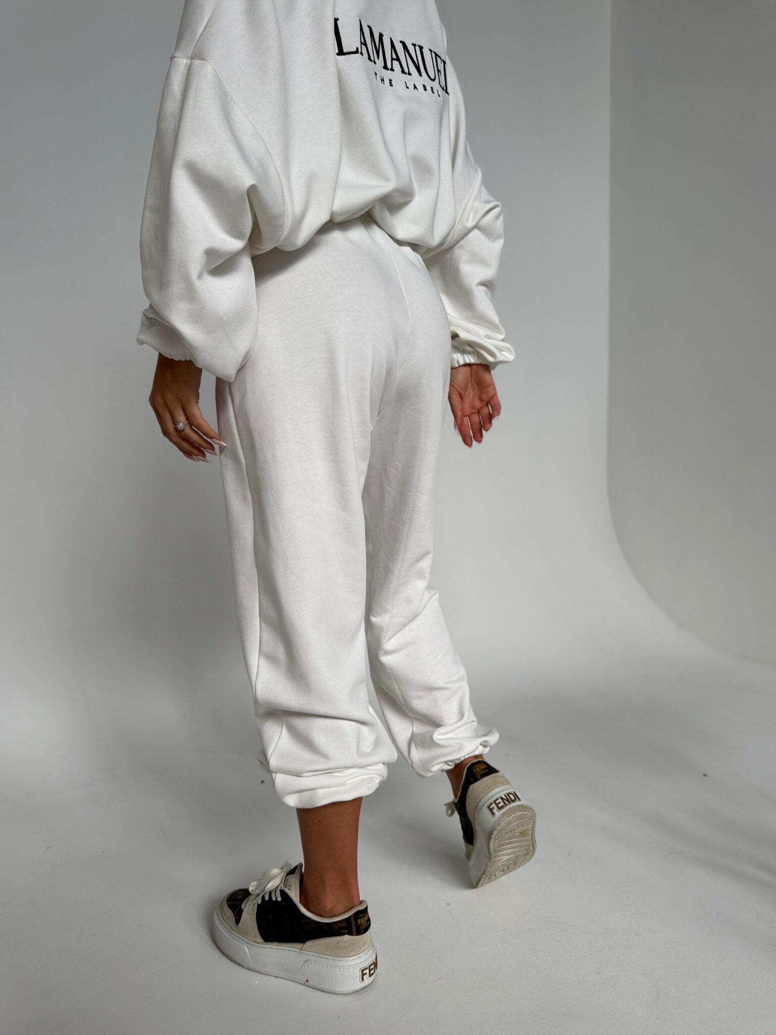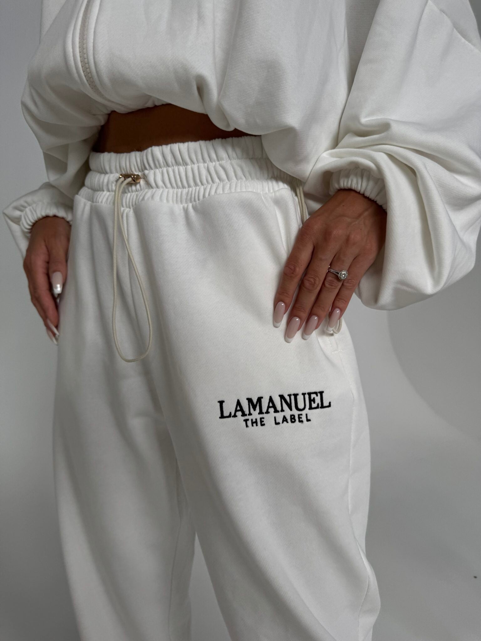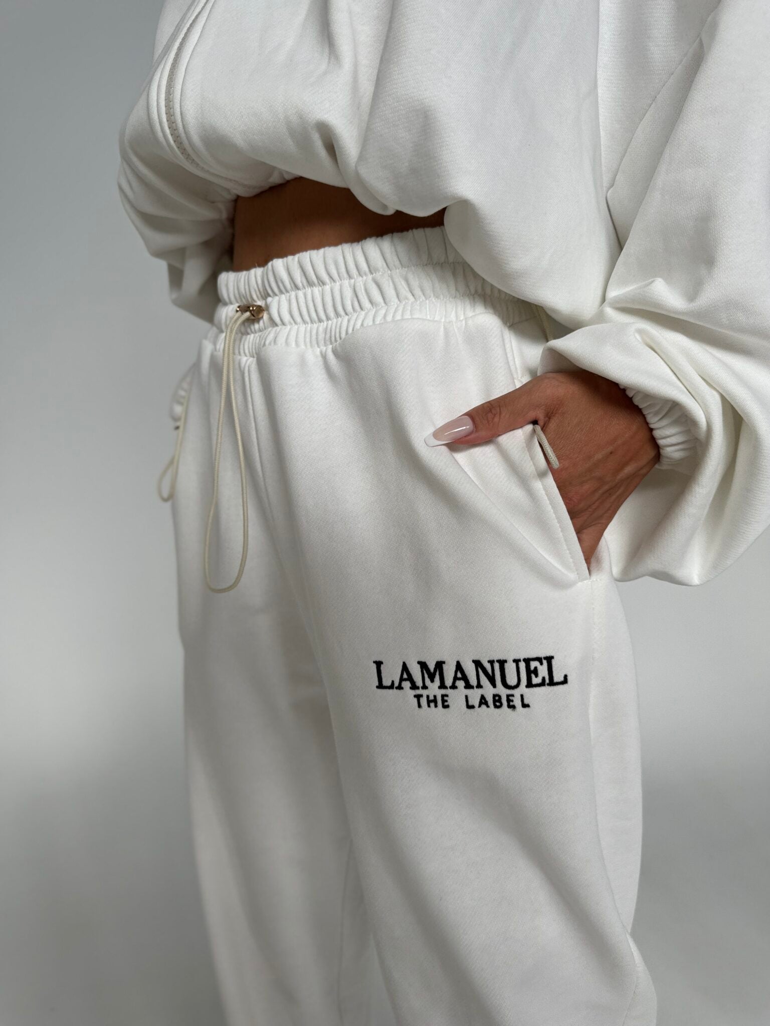 Breite Jogginghose, stilisiert wie Herrenhose mit hoher Taille und elastischem Bund an der Taille und einem zusätzlichen kleinen anzupassen. Ein breites, gerades Bein und ein bequemer Schnitt sorgen für Tragekomfort und Bewegungsfreiheit. Das LAMANUEL-Logo ist auf der Hüfte zu sehen und fügt sich nahtlos in das CLOUDY-Sweatshirt ein und schafft ein komplettes, modisches Set. Obwohl die Hose weit ist, passt sie perfekt ab Größe XS-L.