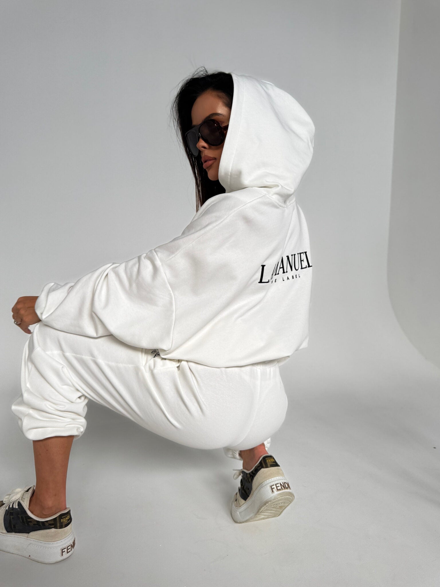 Ein locker sitzendes Sweatshirt mit Reißverschluss mit Kapuze und einem eingenähten Bund an der Unterseite, mit dem Sie die Weite anpassen und die Taille betonen können. Breite Ärmel, abgerundet mit einem zarten Gummiband. Auf Brust und Rücken befindet sich ein ausdrucksstarkes LAMANUEL-Logo, das den ganzen Charakter verleiht. Das Modell besteht aus weichem, angenehmem Strick, ideal für den Alltag und Reisen. Kombinieren Sie sie mit CLOUDY-Hosen, um das Styling als Ganzes zu erhalten. Das Sweatshirt passt von Größe XS bis XL.