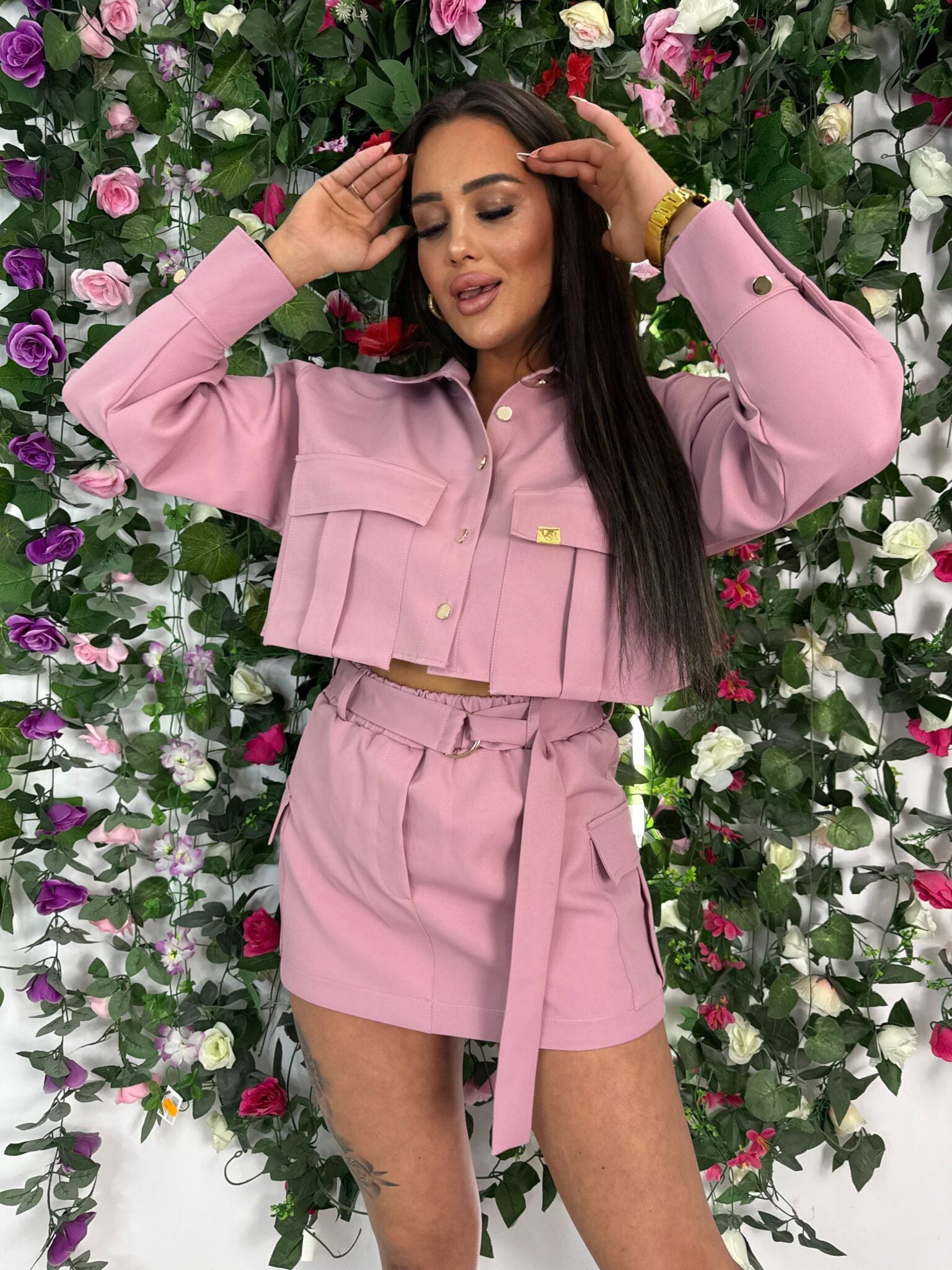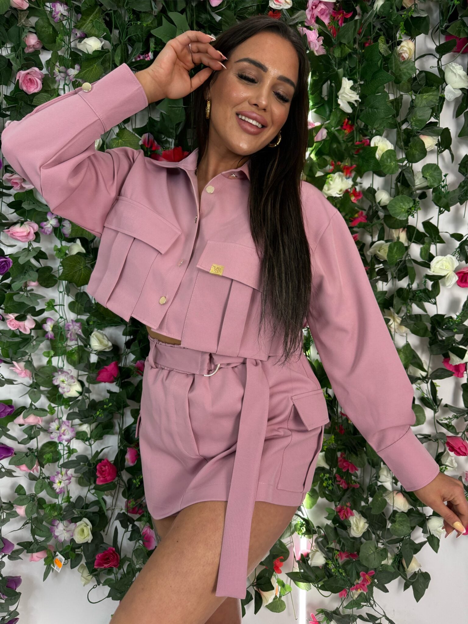 Must- Have der Kollektion – das Set DOLLY ist ein Vorschlag, der modernen Cargo-Stil mit einem femininen Akzent kombiniert und so ein einzigartiges Set für jeden Anlass schafft. Die perfekte Wahl für Frauen, die Wert auf Komfort, Funktionalität und einen modischen Look legen. Dieses Set kombiniert Rock-Shorts mit einem kurze Jacke und schafft so ein elegantes und dennoch sportliches Outfit.