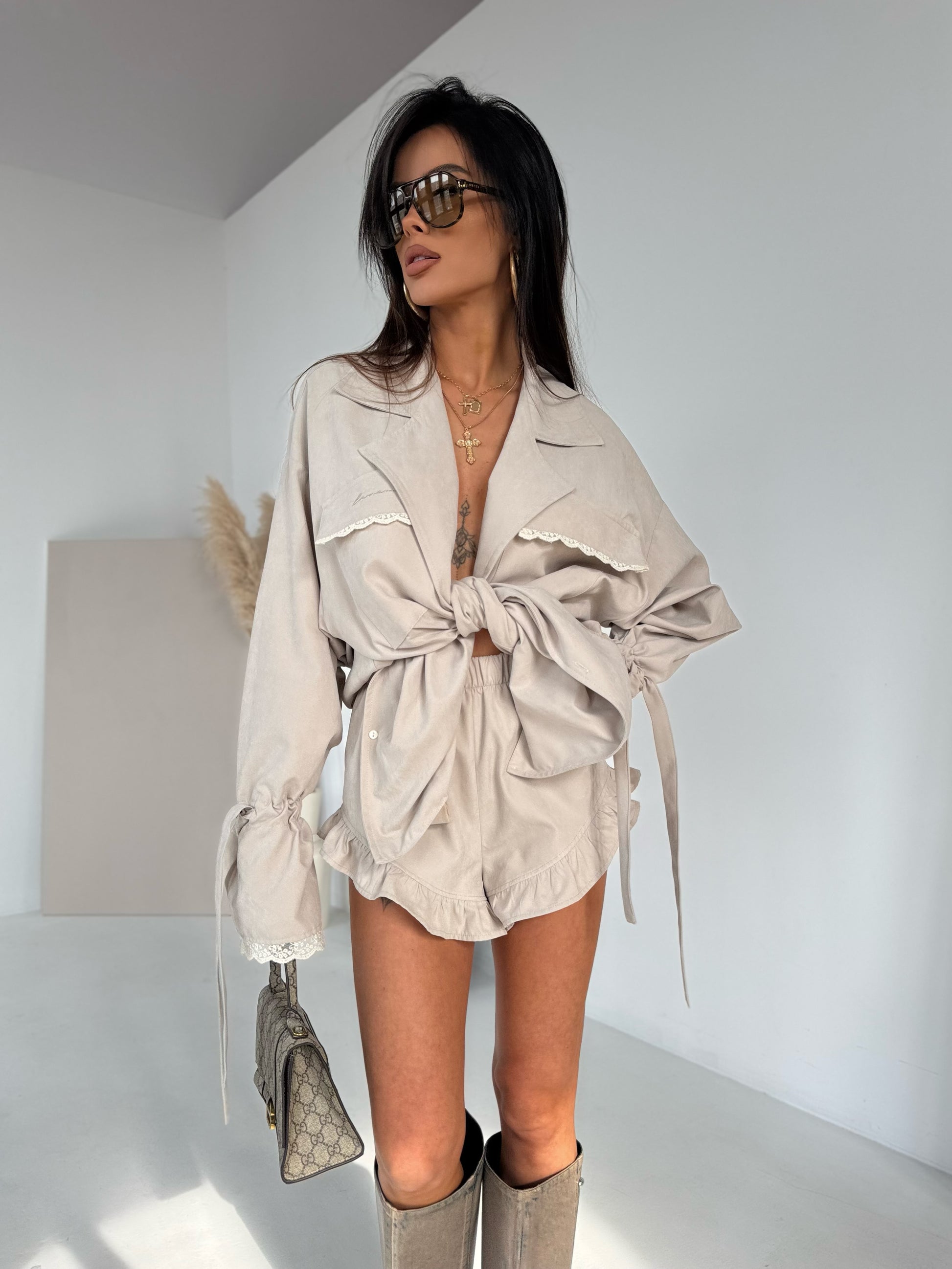 Ein Damenset, das die perfekte Kombination aus Leichtigkeit und dezenter Eleganz ist! Ein Maxishirt mit zartem Spitzenbesatz wirkt äußerst feminin – Sie können es locker, mit einem Gürtel in der Taille gebunden oder aufgeknöpft über einem Top und Jeans tragen. In Kombination mit gerüschten Shorts entsteht ein stimmiger Look, der sowohl für Sommerausflüge als auch für eher lässige Anlässe perfekt ist. Dank des universellen Schnitts können Sie mit Schichten spielen und das Set an Ihren Stil anpassen.
