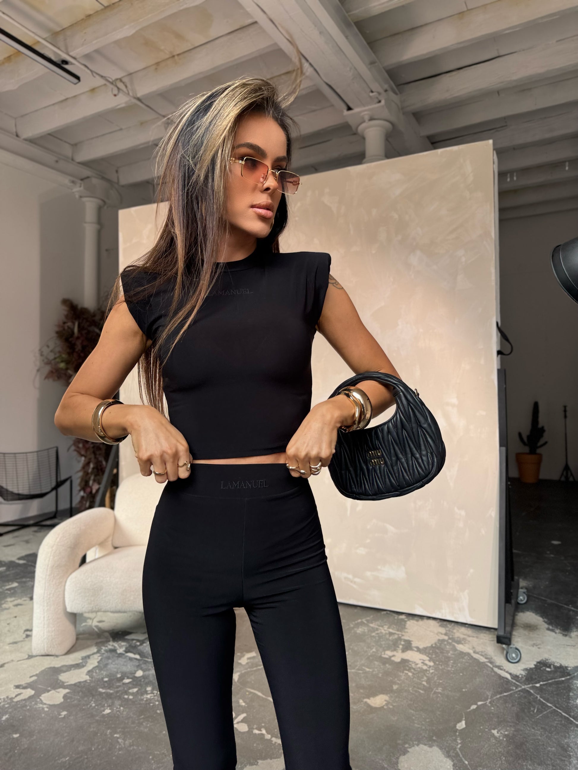Ein modernes SUNSET LAMANUEL-Set, das minimalistisches Design mit kühnen Charakter kombiniert. Ein tailliertes Oberteil mit Schulterpolstern und hoch taillierten Leggings bildet die perfekte Kombination, die die Figur modelliert und für einen spektakulären Look sorgt.