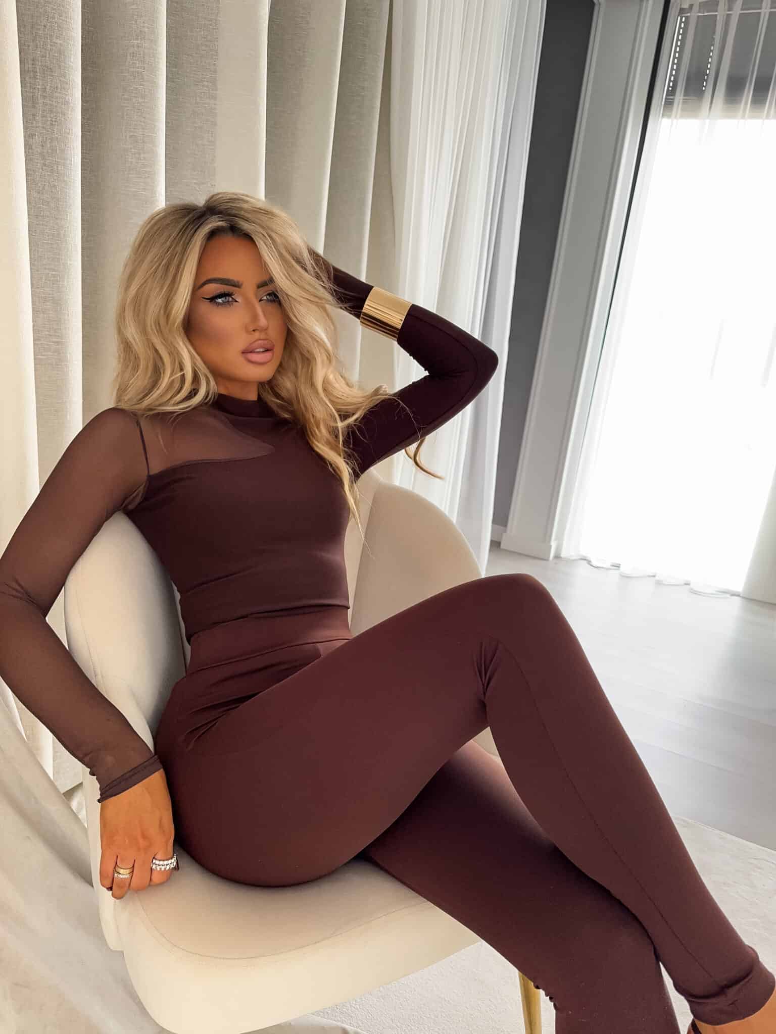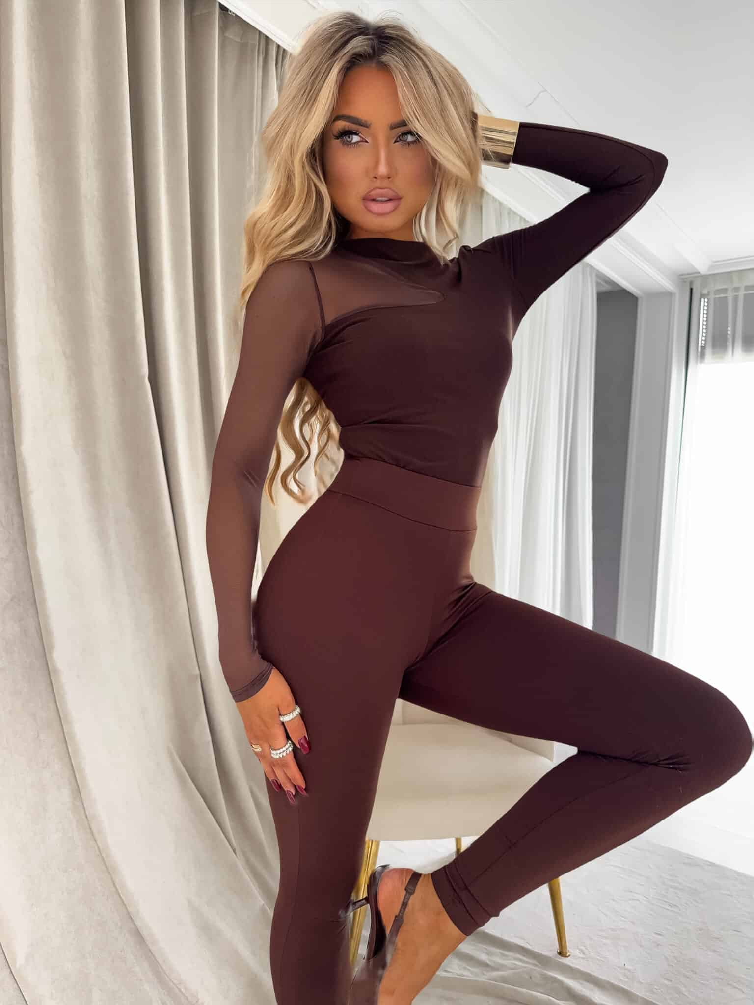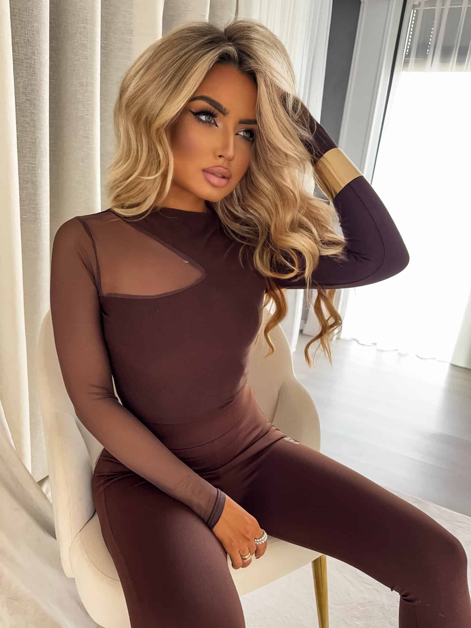Sein asymmetrischer Einsatz aus transparentem Mesh, subtil an der Schulter und am Ausschnitt platziert, verleiht ihm einen modernen und sinnlichen Charakter.
