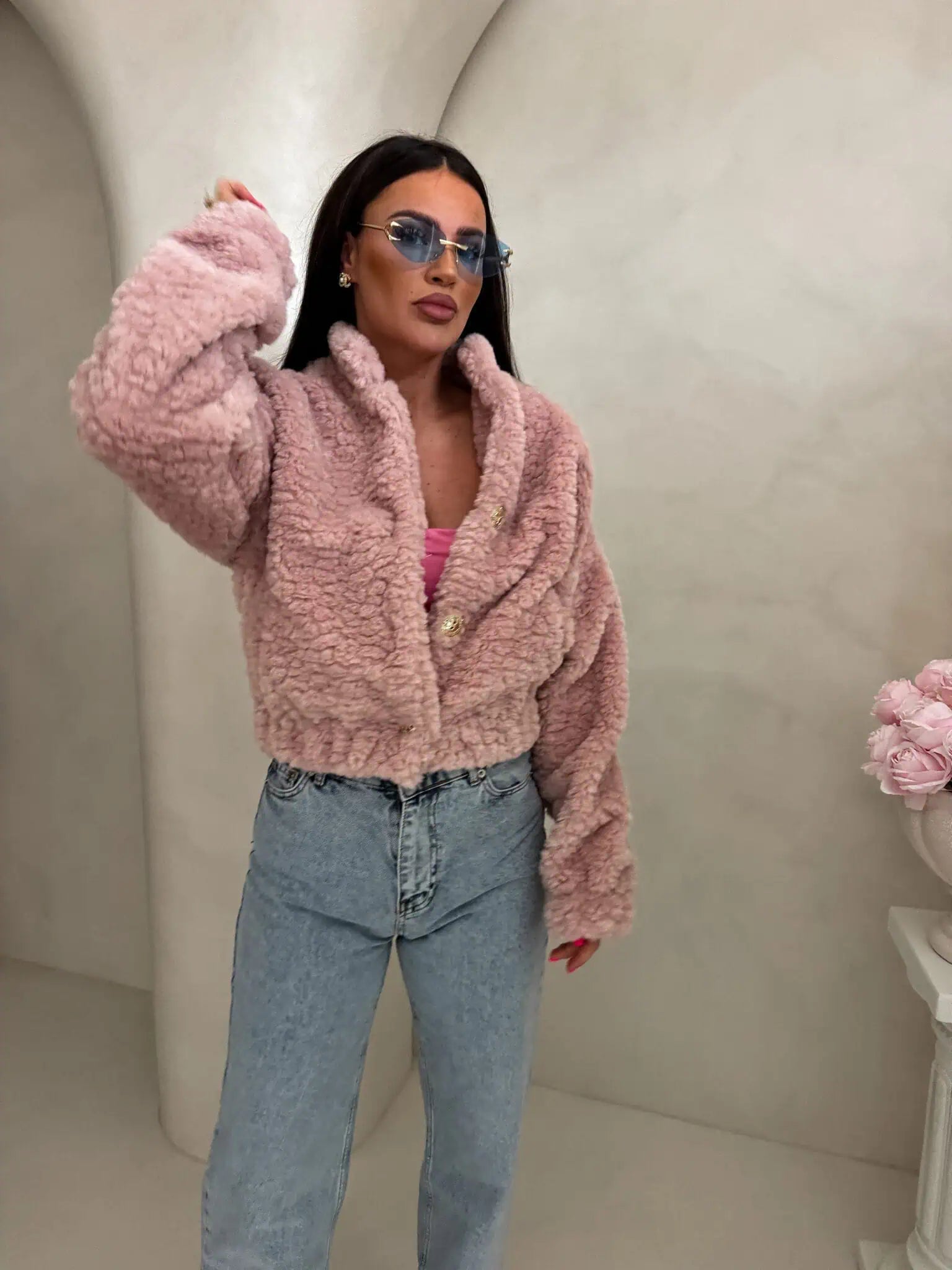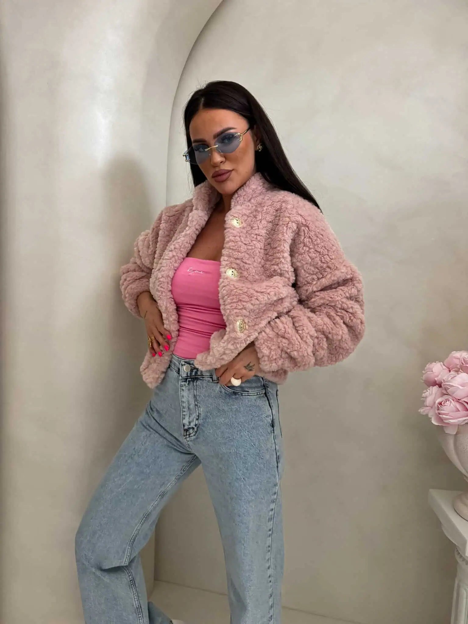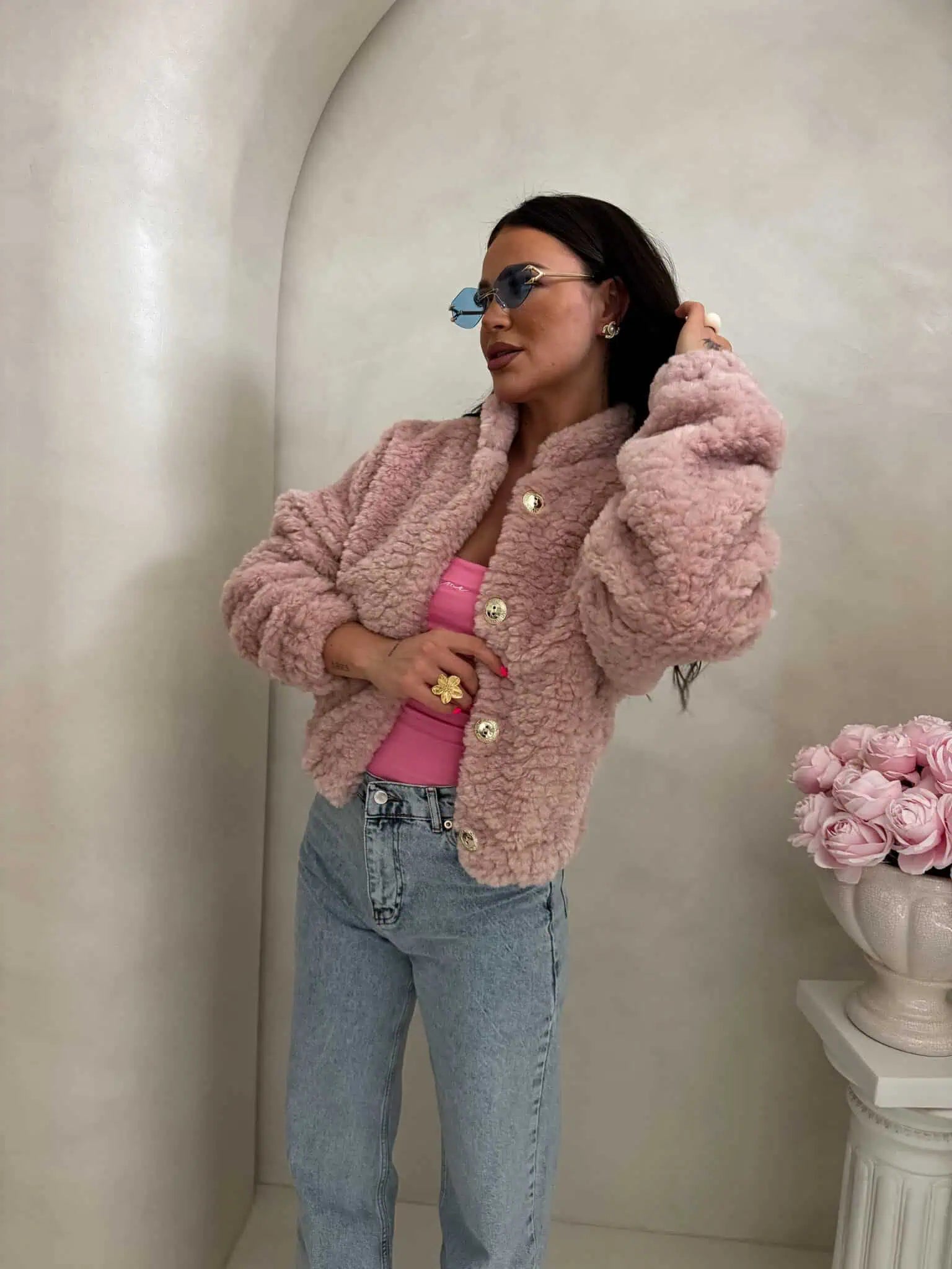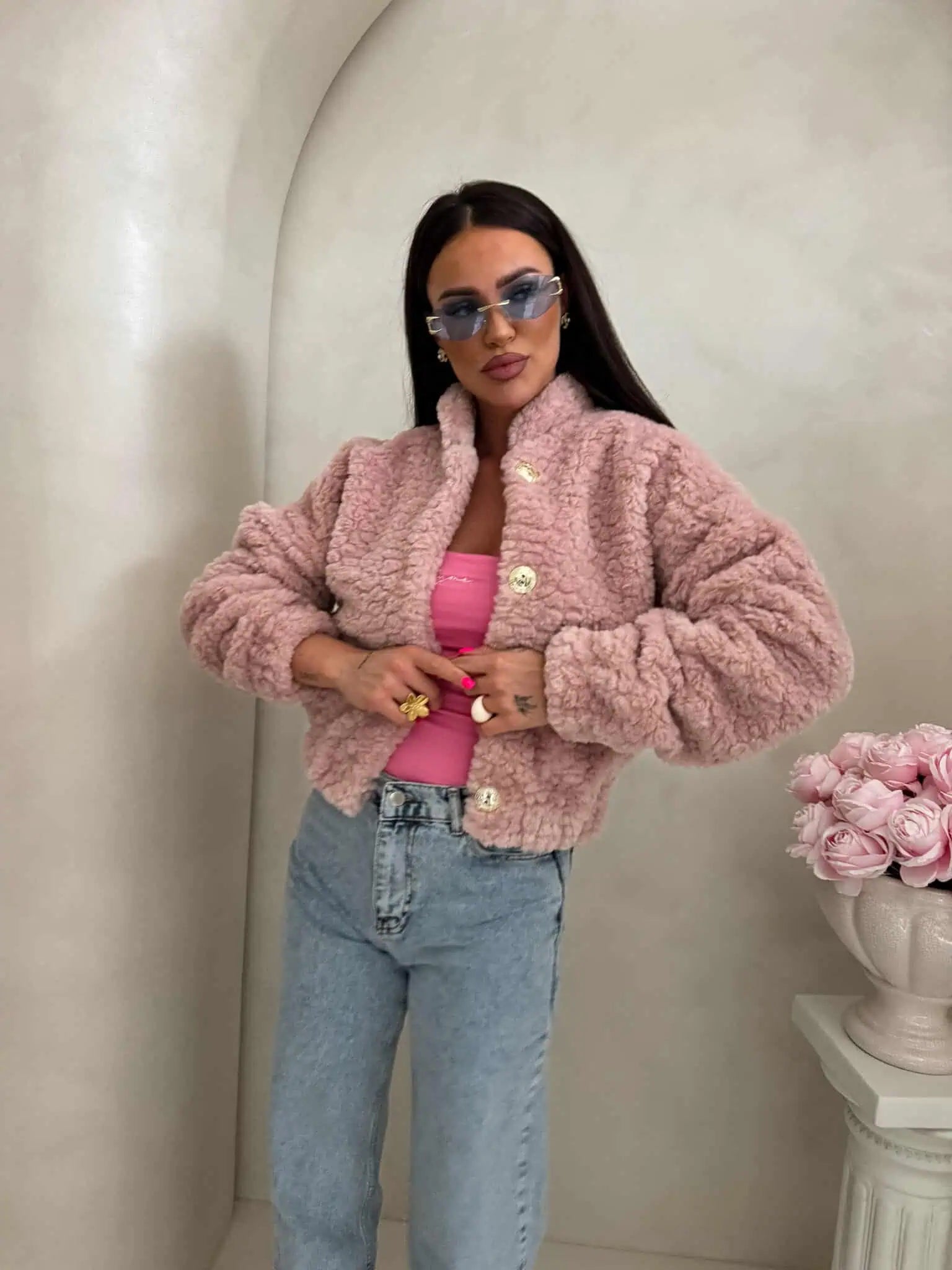 Bomberjacke mit einem einfachen, etwas übergroßen Schnitt, ohne Kapuze. Modell mit goldenen, dekorativen Knöpfen befestigt. Lange Ärmel mit lockerer Verarbeitung sorgen für Freiheit und Tragekomfort. Taillenlang, hat praktische Taschen.