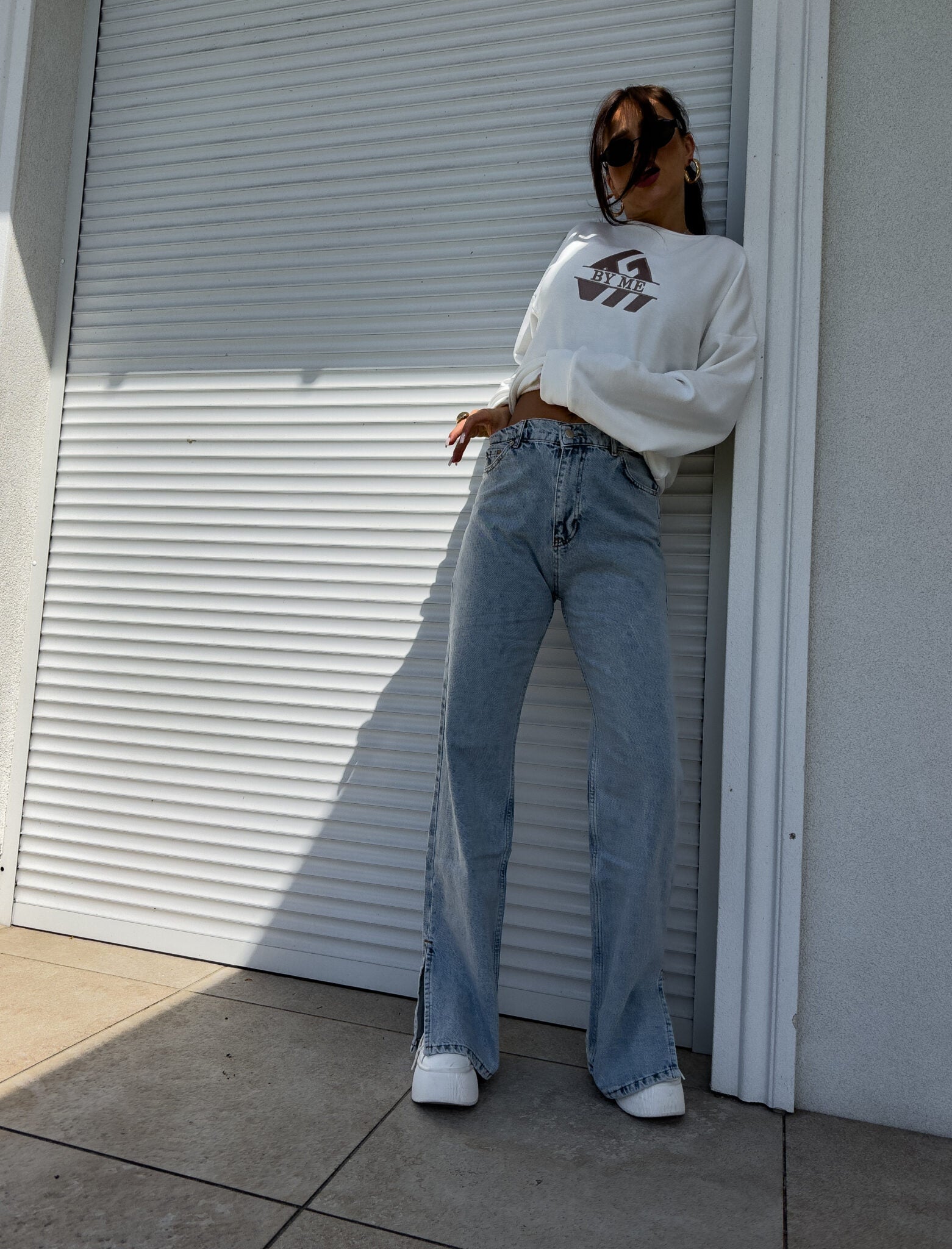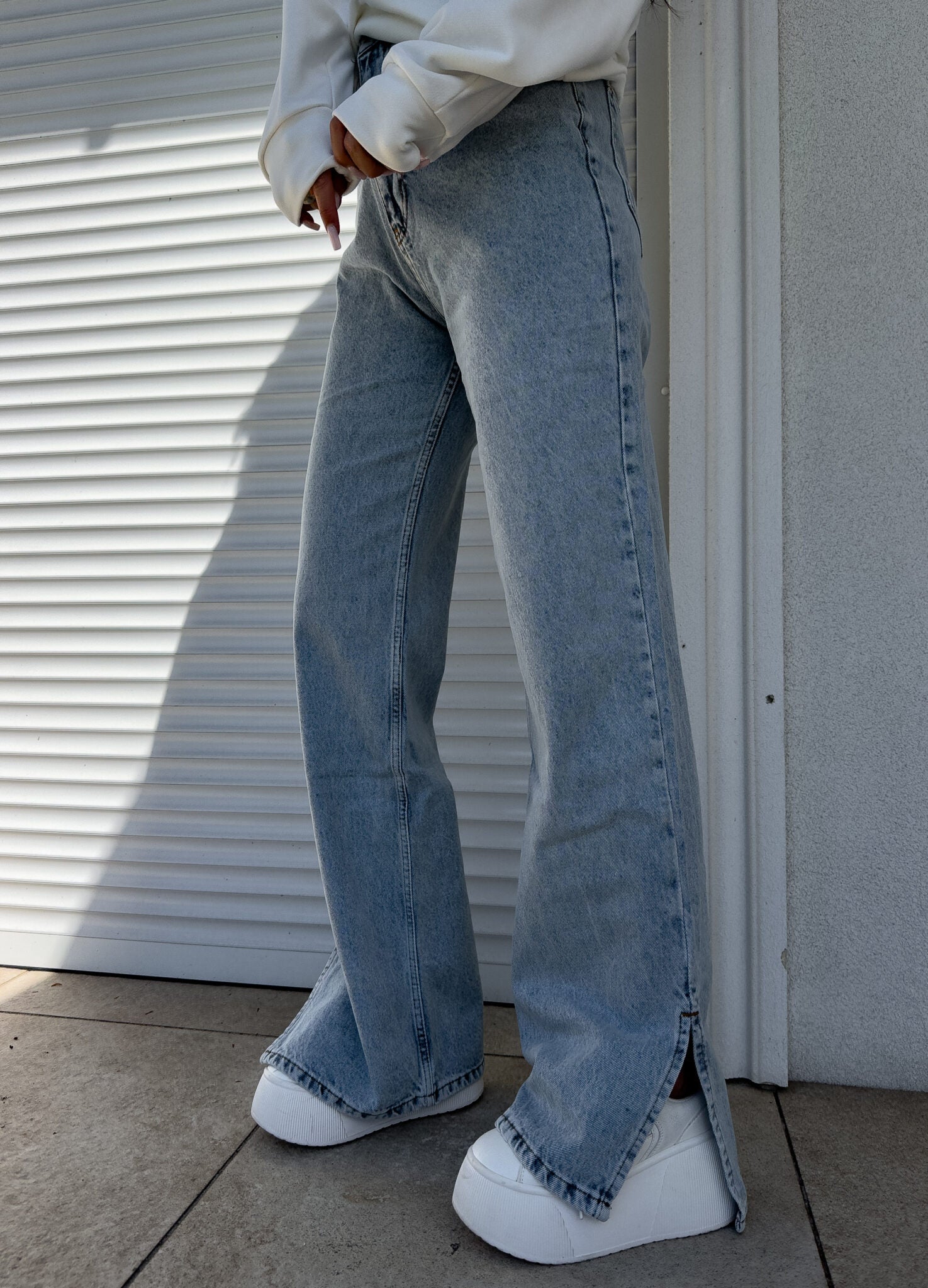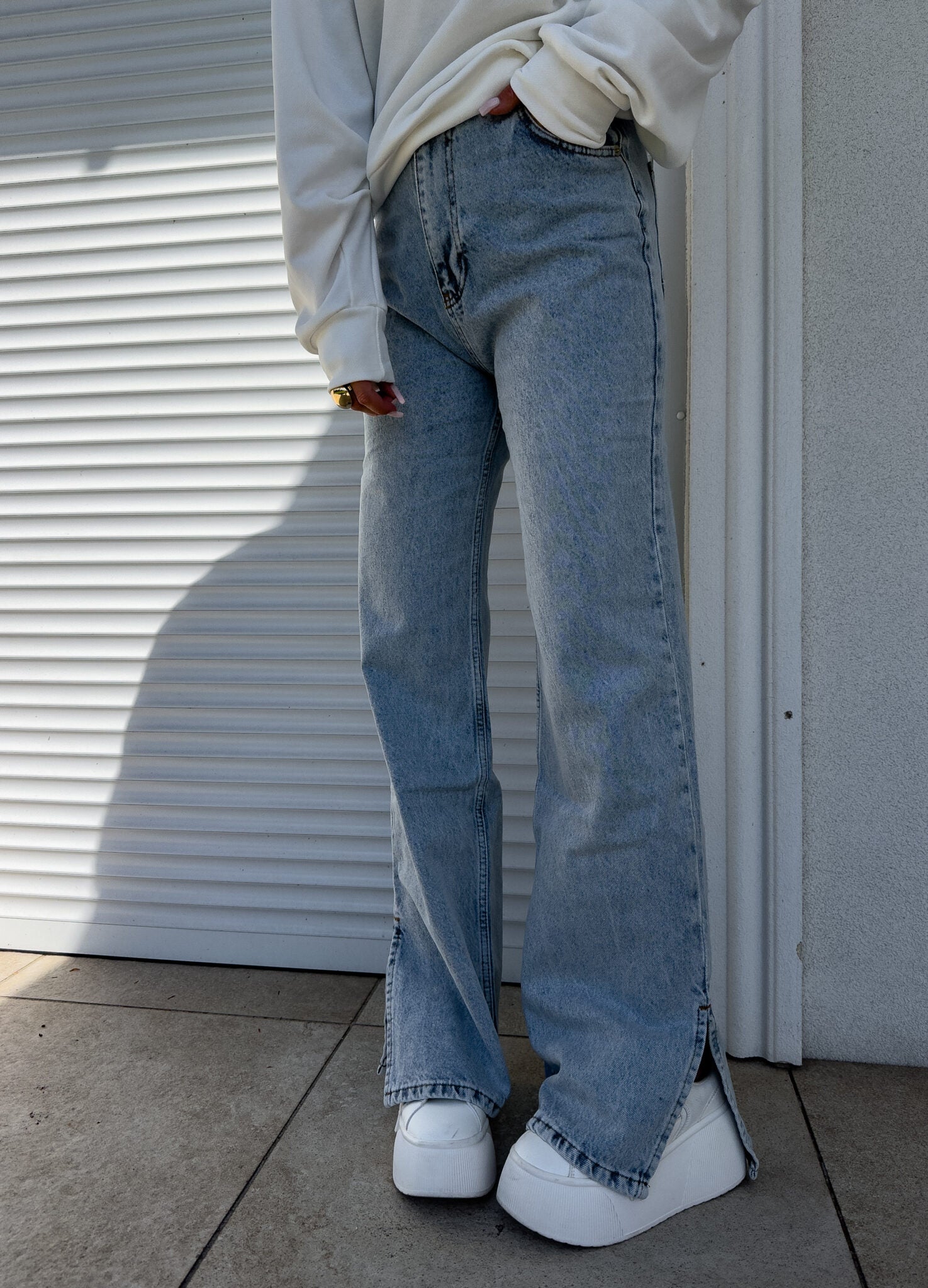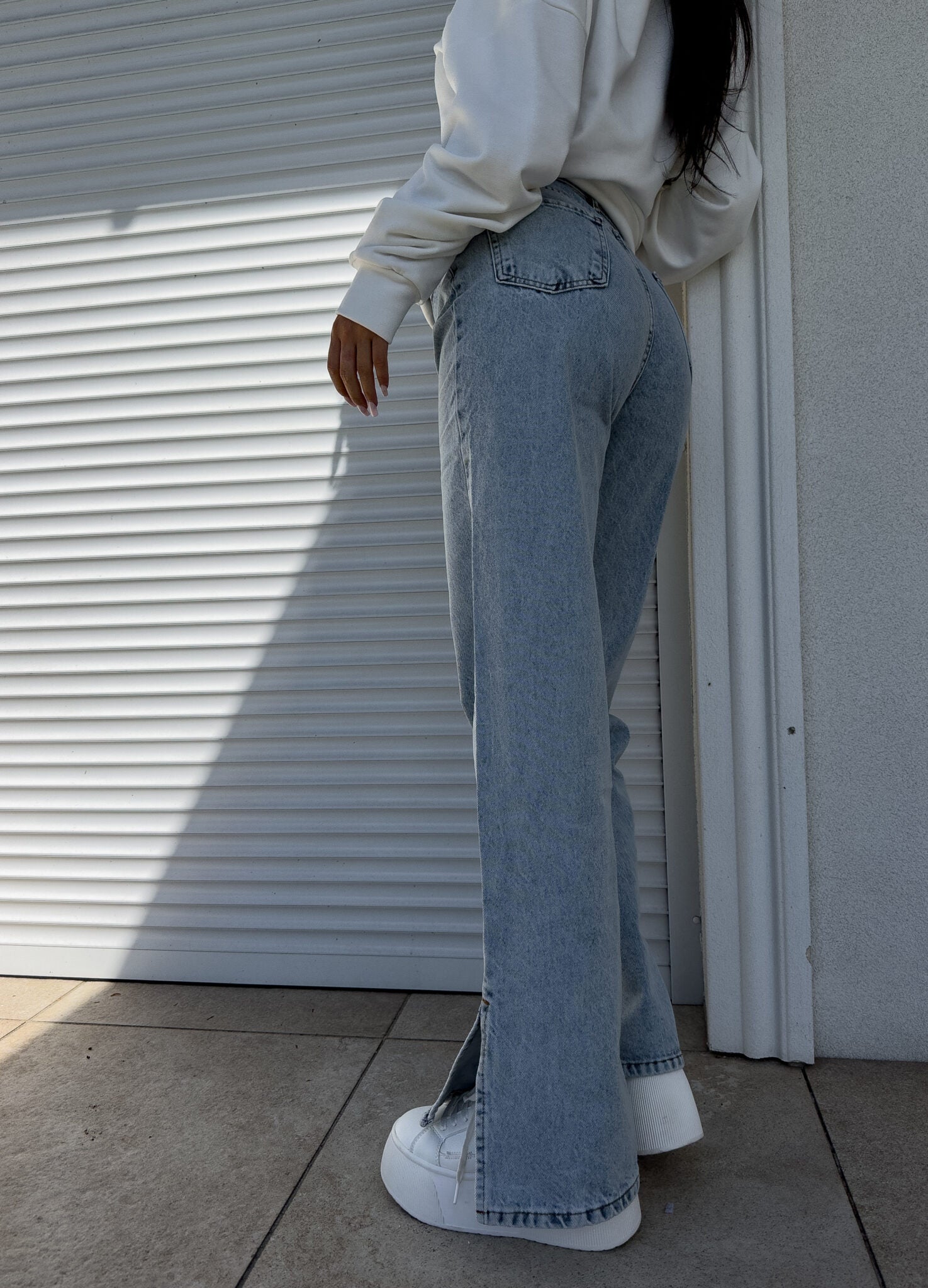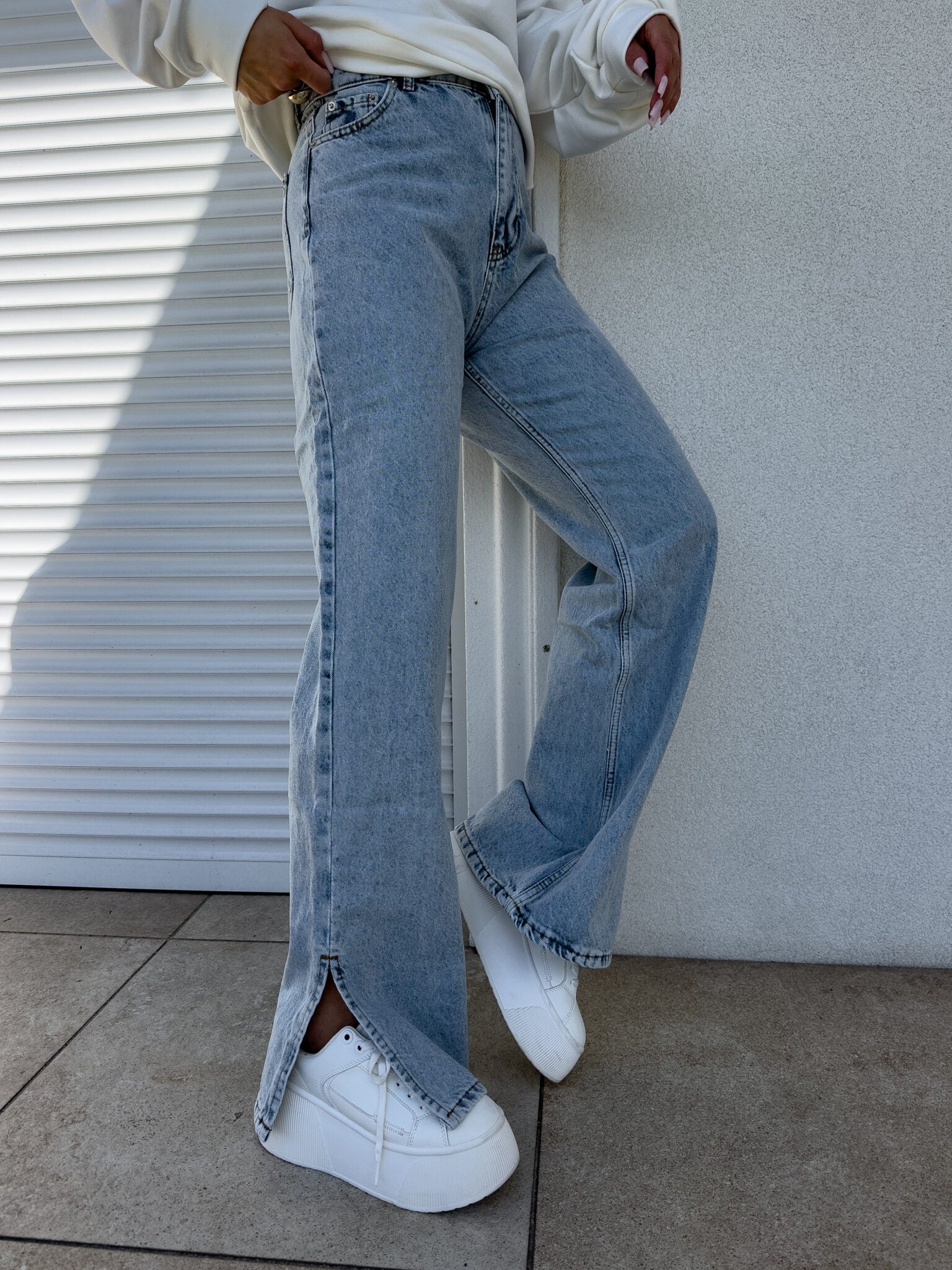 Mom Fit Jeans wird für viele Outfits funktionieren. Sie sind mit einem Knopf befestigt und haben Bäge und Taschen auf der Vorder- und Rückseite. Die Beine mit einem stilvollen Schnitt verleihen ihnen einen modernen Charakter und sehen sowohl mit Turnschuhen als auch mit Stiefeln gut aus.