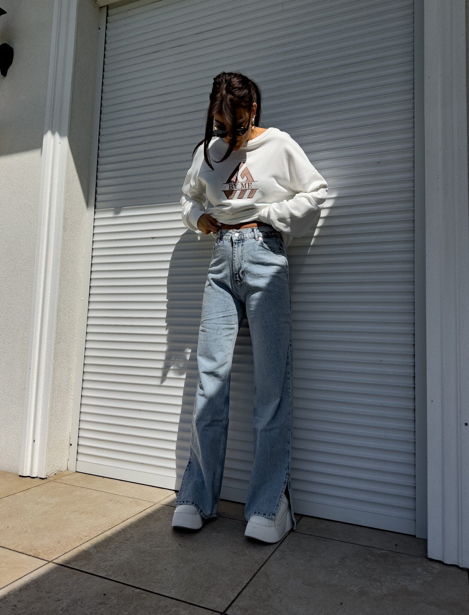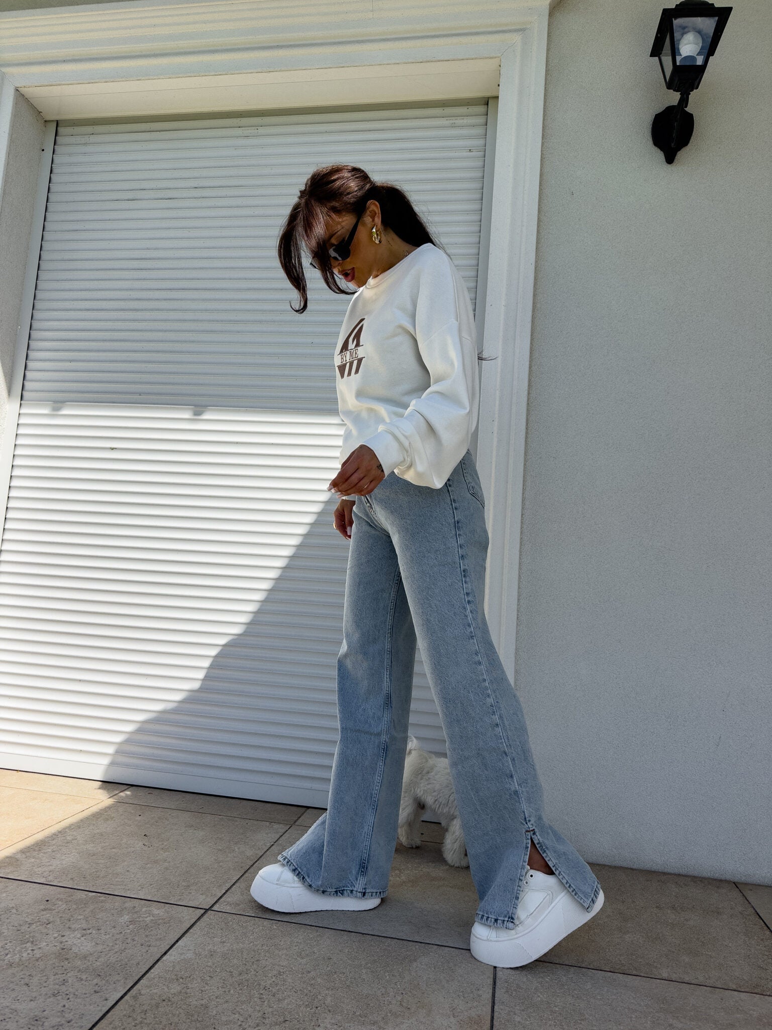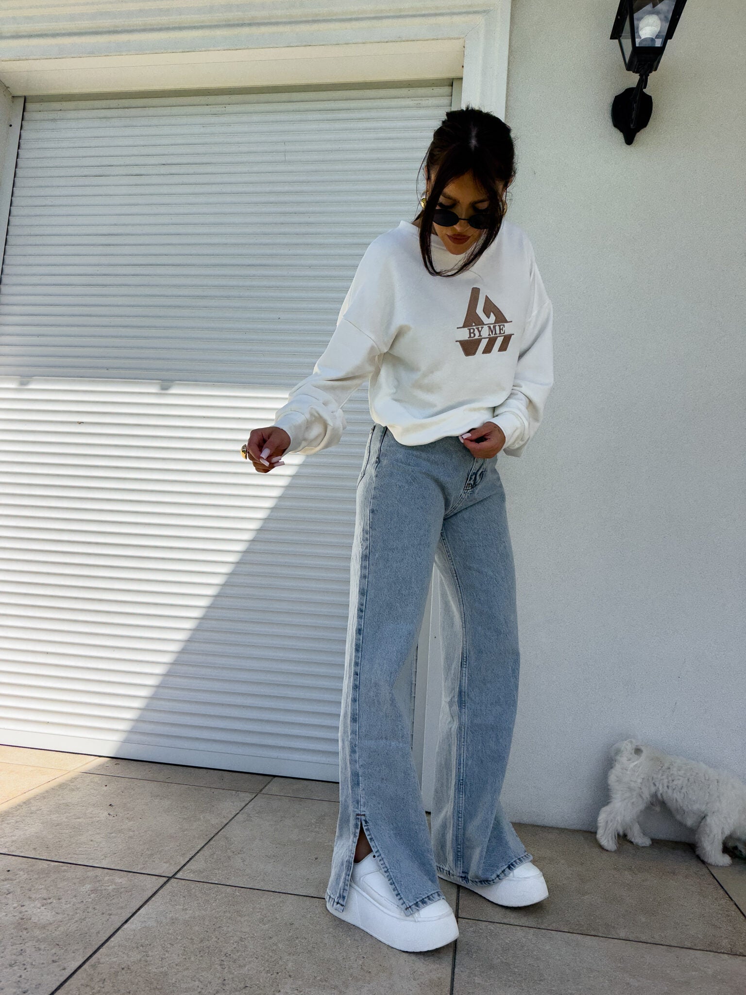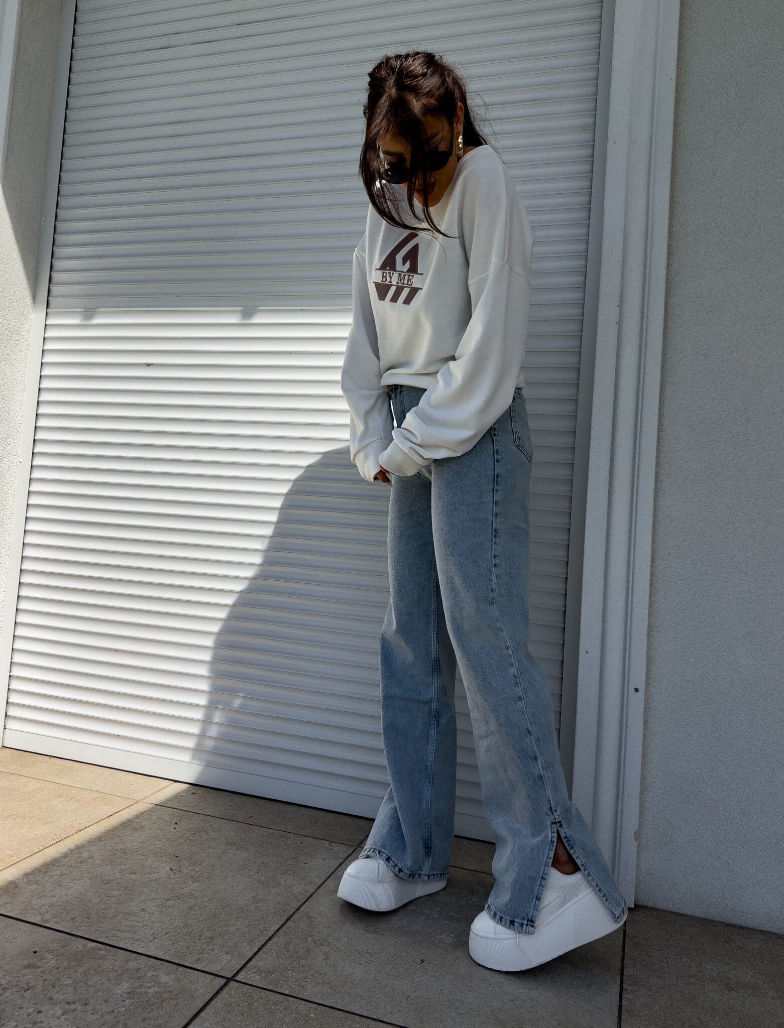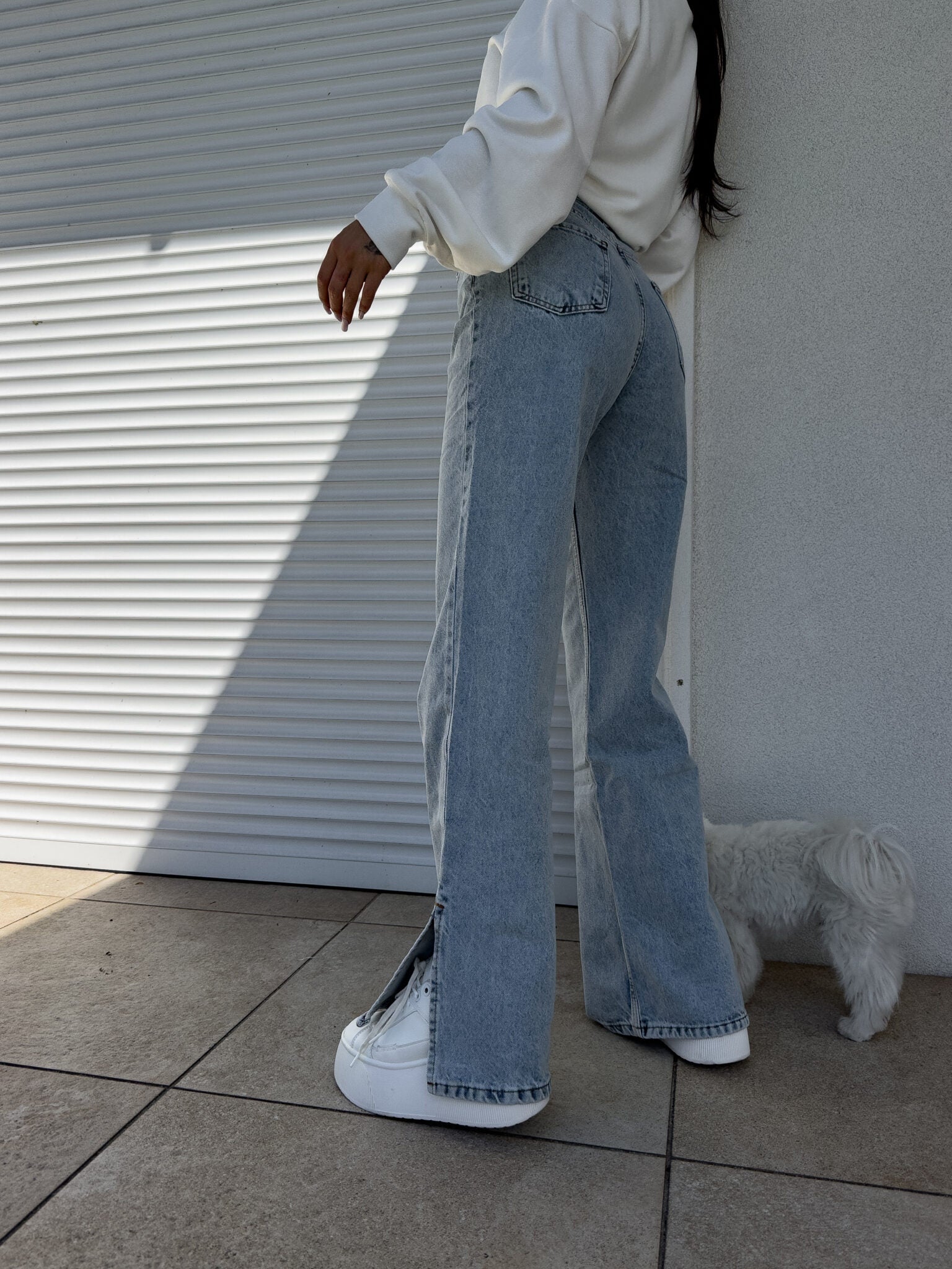 Mom Fit Jeans wird für viele Outfits funktionieren. Sie sind mit einem Knopf befestigt und haben Bäge und Taschen auf der Vorder- und Rückseite. Die Beine mit einem stilvollen Schnitt verleihen ihnen einen modernen Charakter und sehen sowohl mit Turnschuhen als auch mit Stiefeln gut aus.