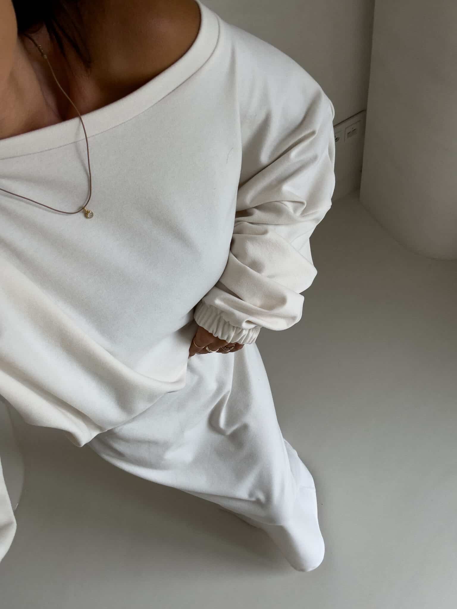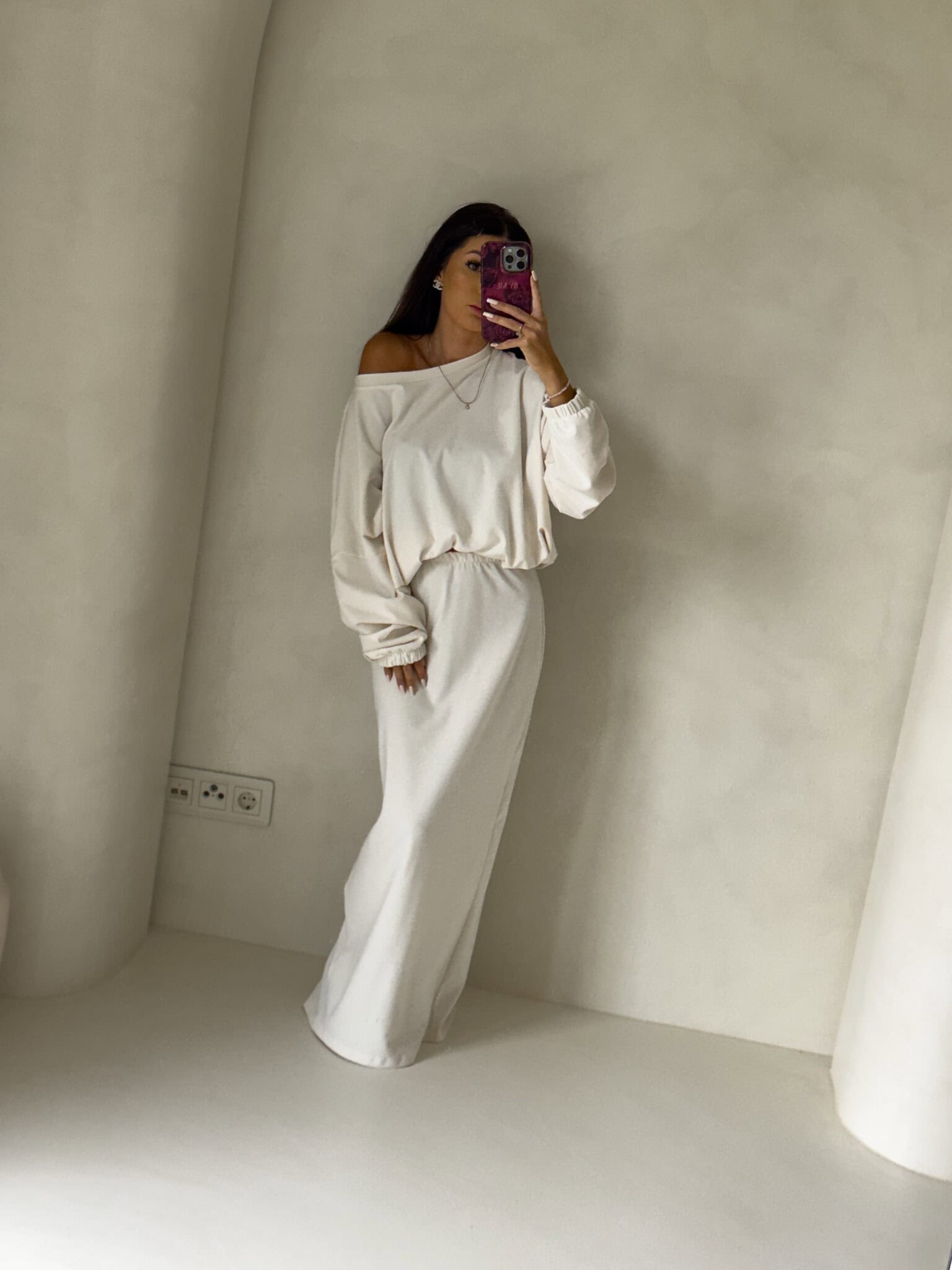 Das perfekte Set für jeden Tag und besondere Anlässe! Es besteht aus einem lockeren Sweatshirt mit geradem Schnitt mit langen Ärmeln, die mit einem zarten Gummiband versehen sind, und einem klassischen Maxirock mit einem spektakulären Schlitz auf der Rückseite.