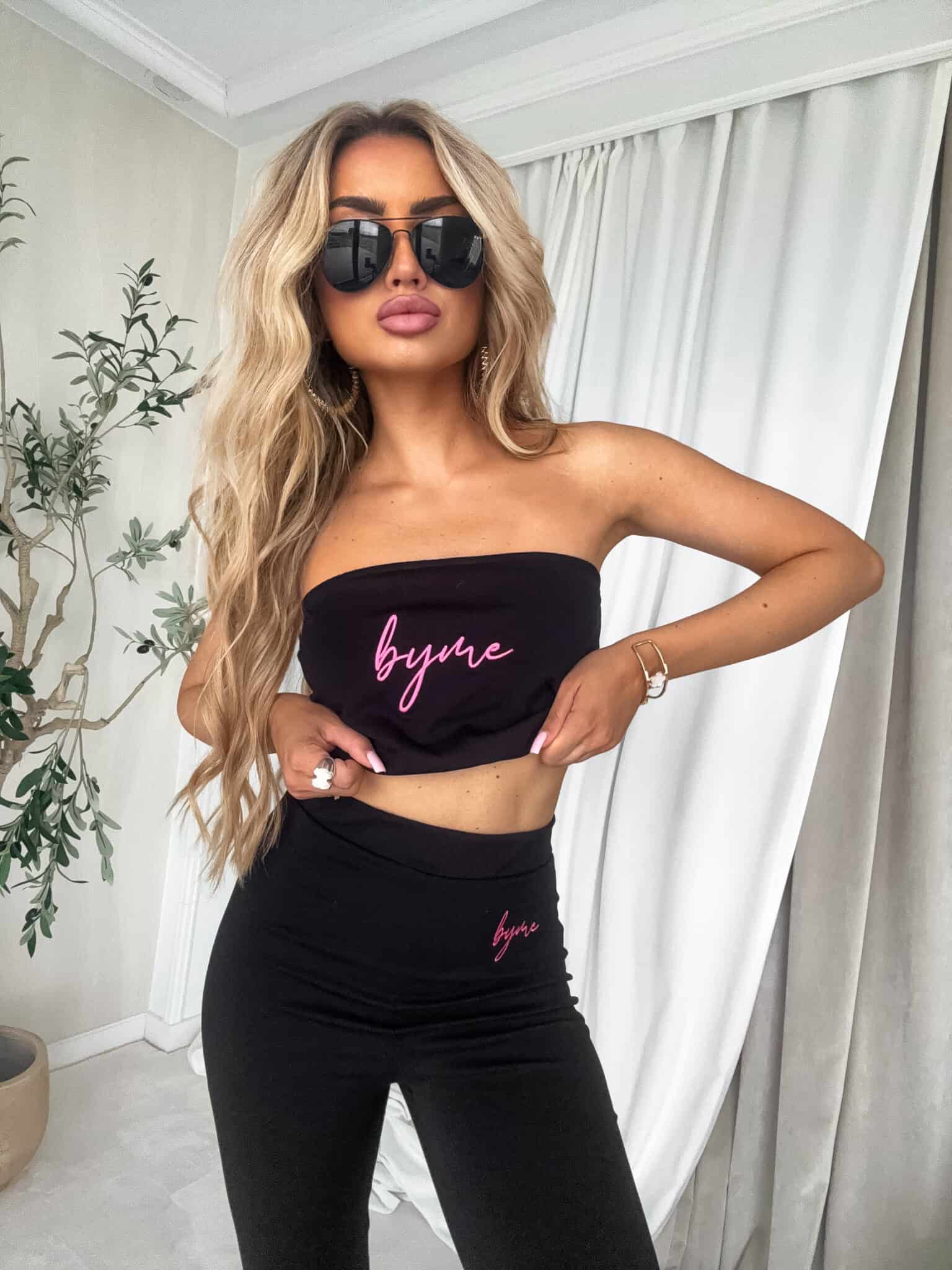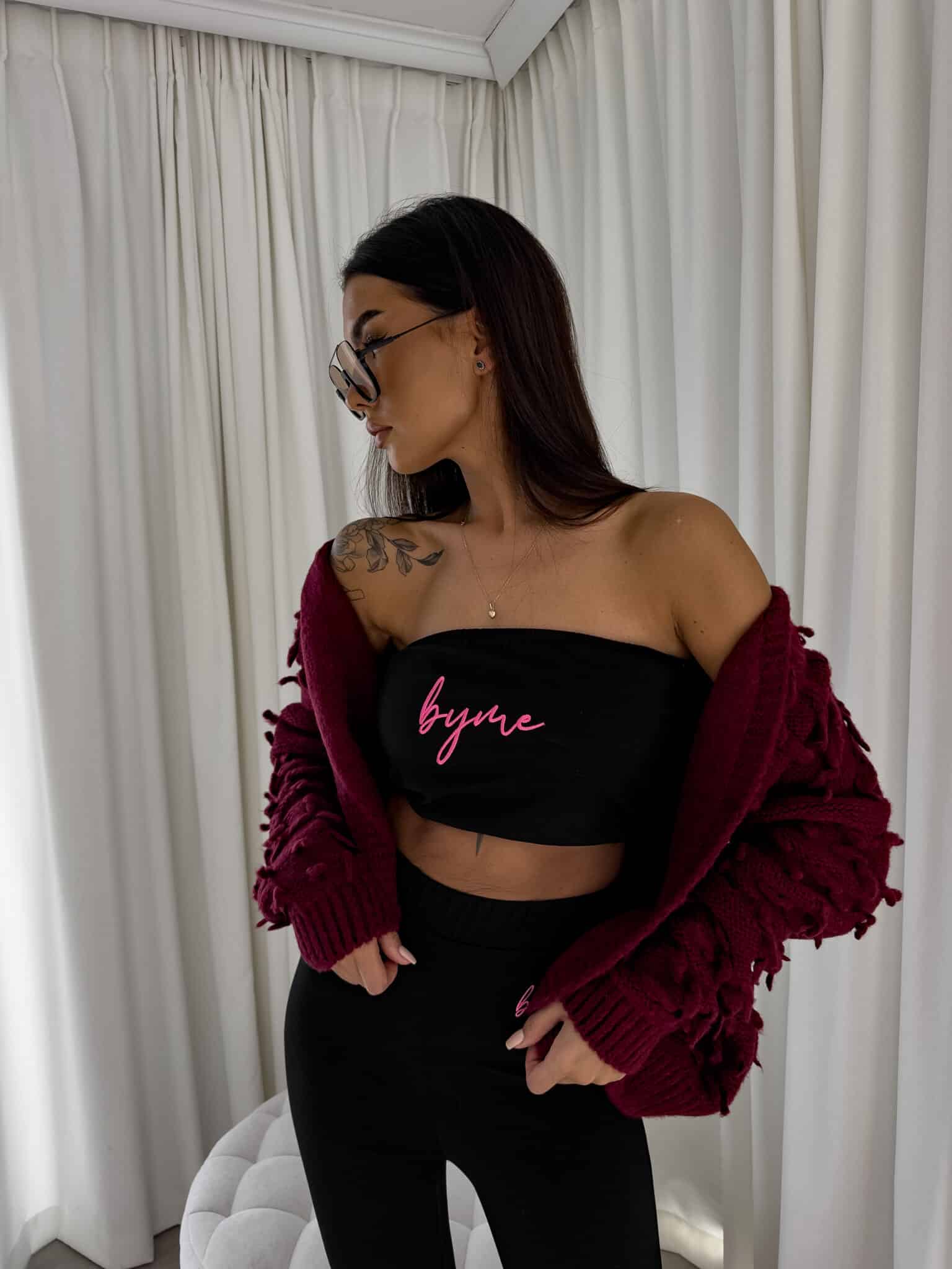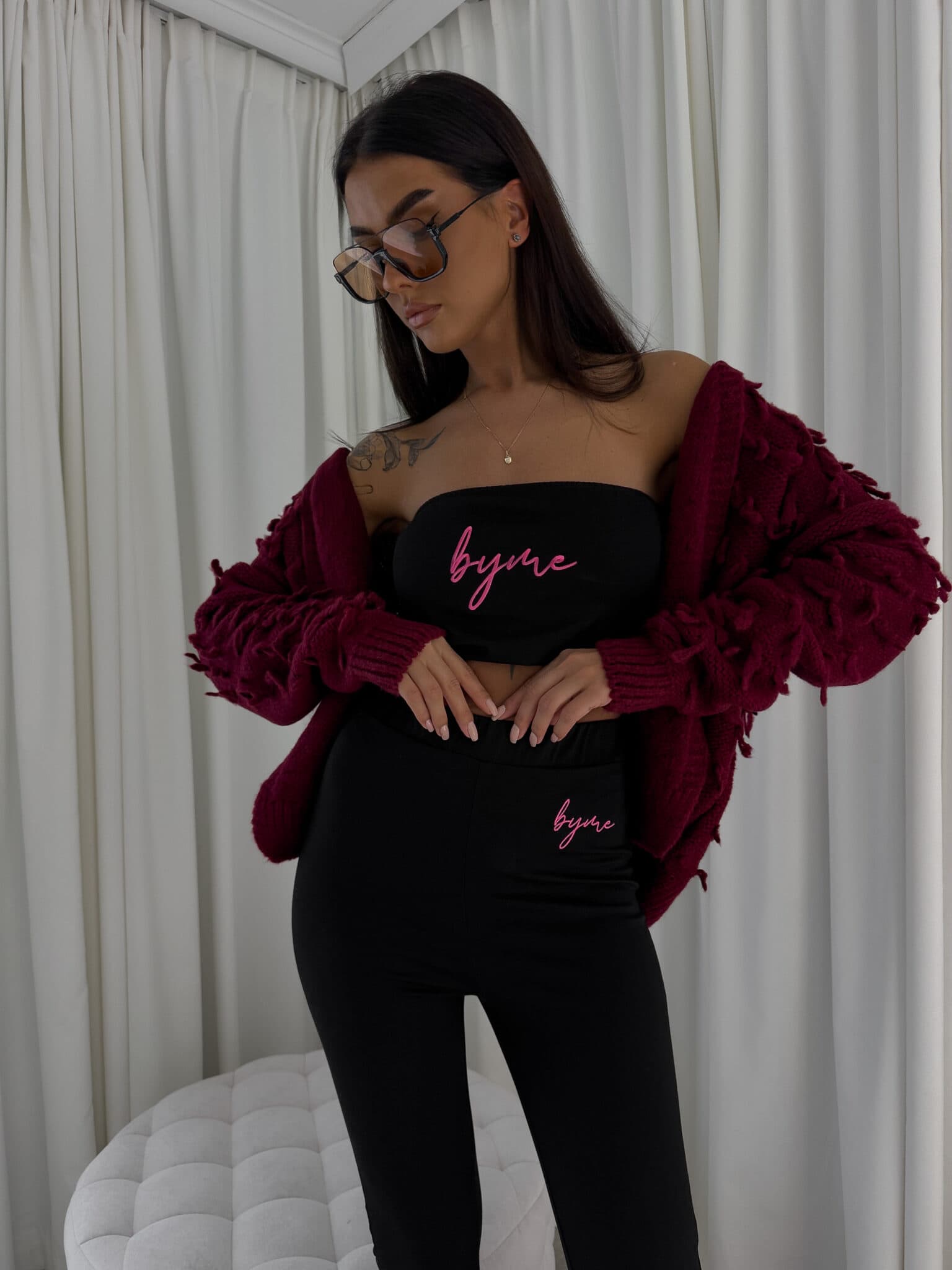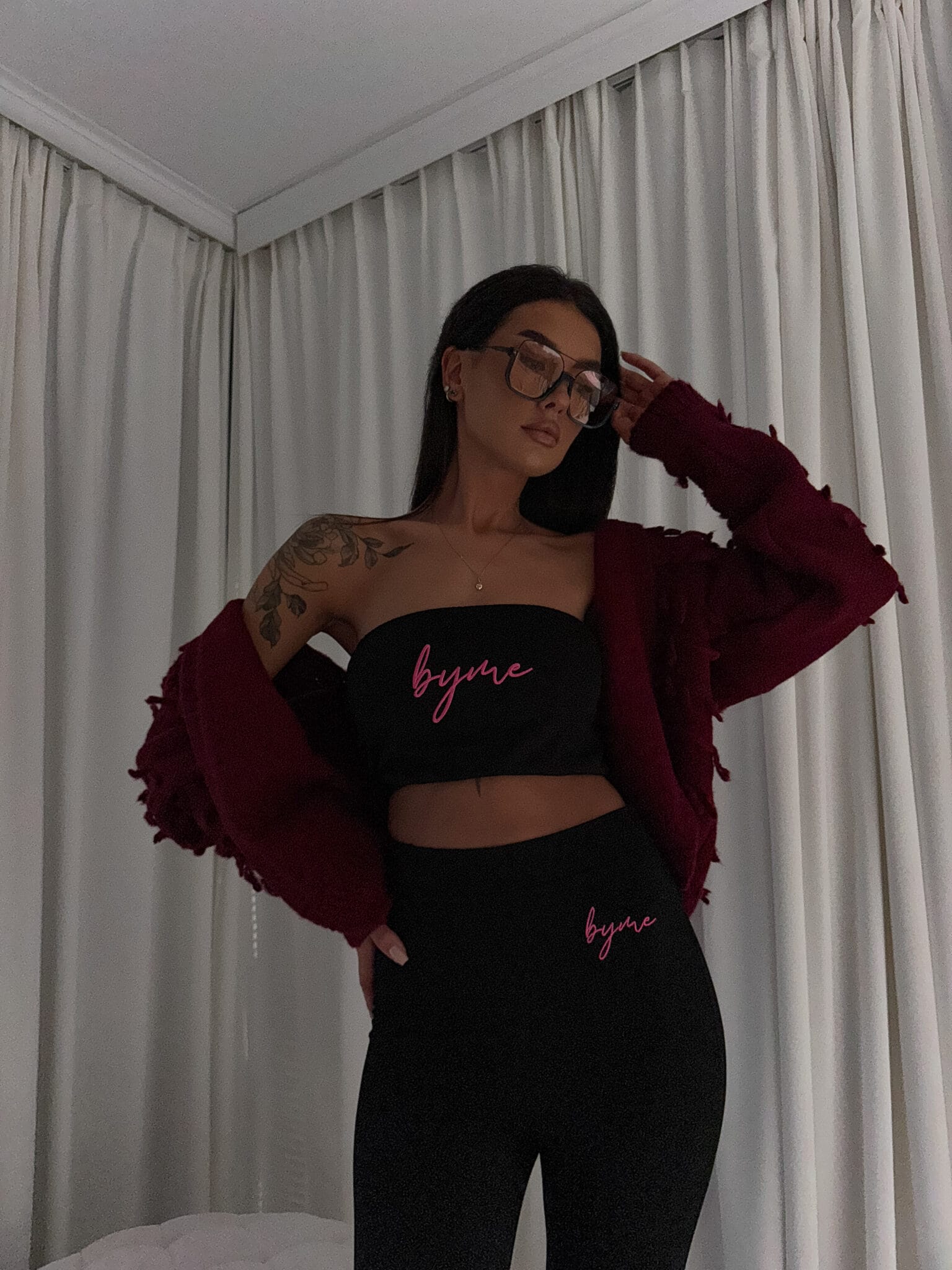 Ein stilvolles Set bestehend aus zwei Elementen - einem Oberteil und einer Hose. Top in Form eines Stirnbands mit Logo in der Mitte, ohne Träger, aus elastischem, körperanliegendem Material, betont perfekt die oberen Teile der Figur. Hosen mit hoher Taille - ein kleines Logo an der Seite und ein elastisches Band an der Taille, verlängern die Beine schön und betonen die Taille. Das Ganze sorgt für Tragekomfort und den Effekt des Abnehmens der Silhouette.