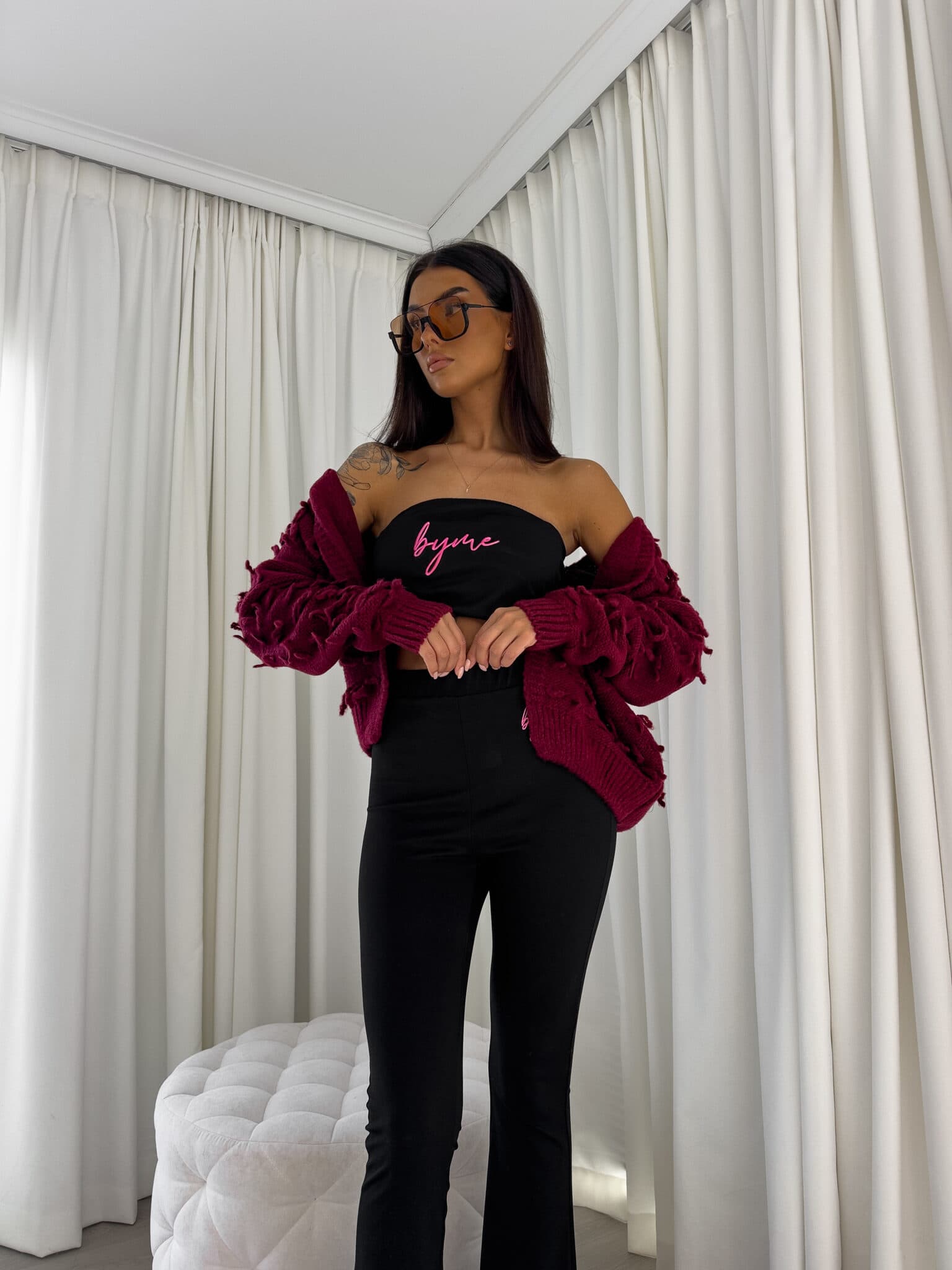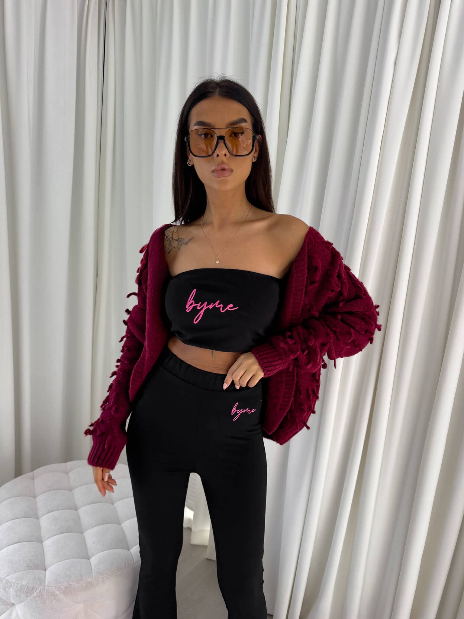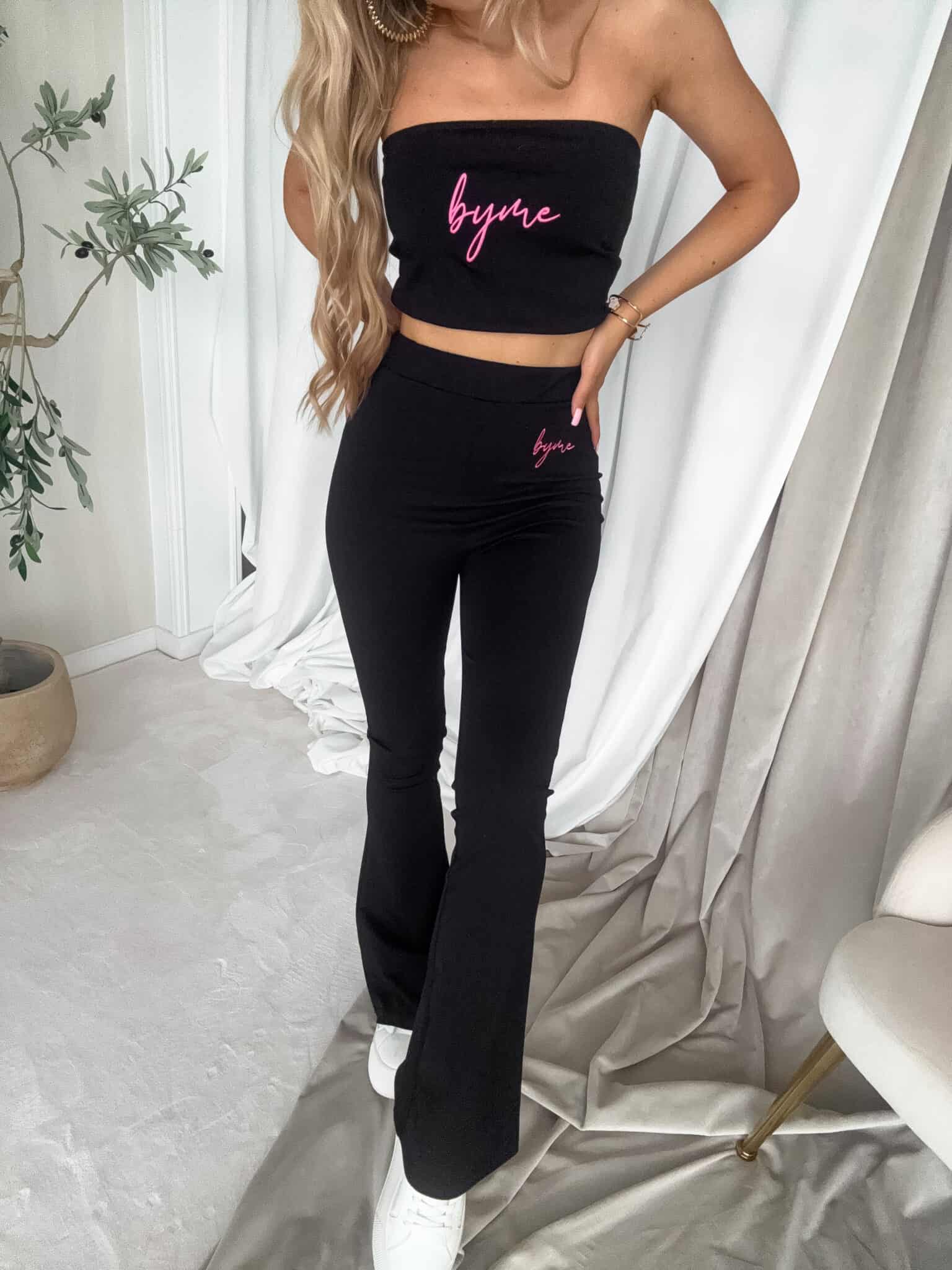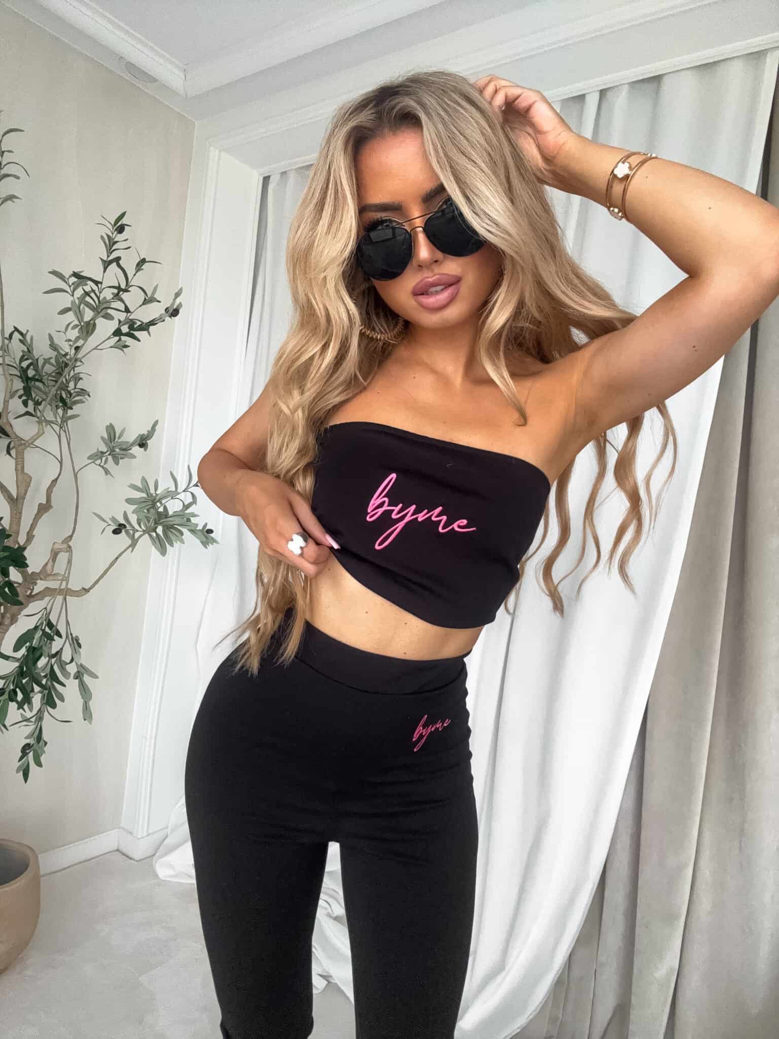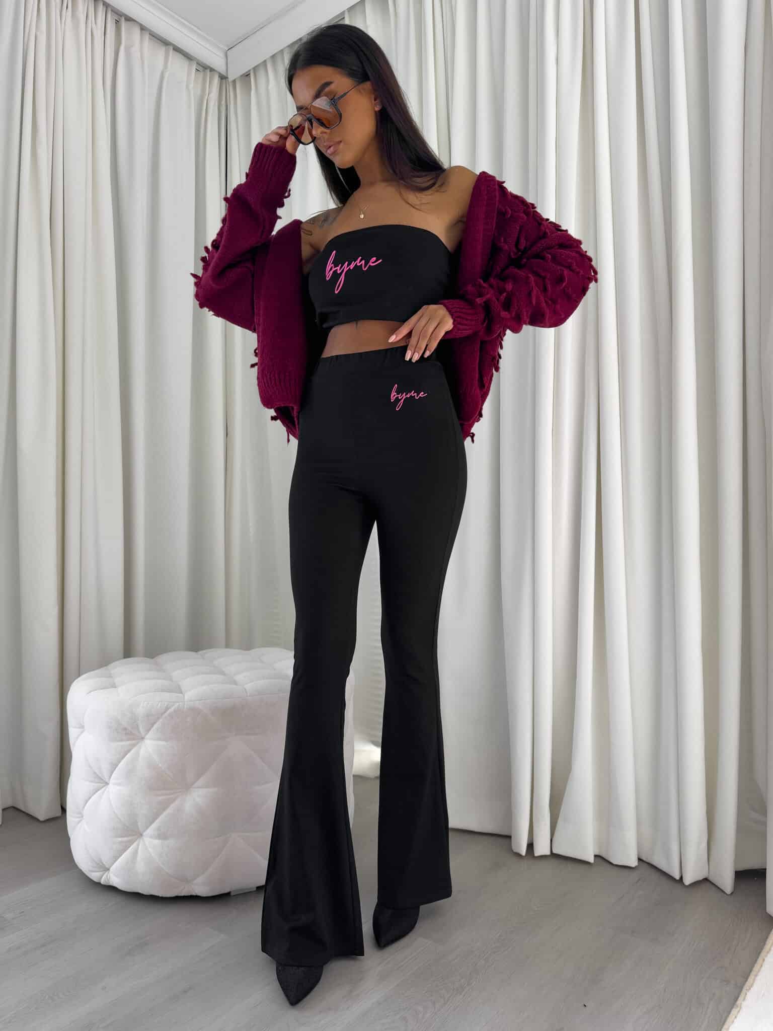 Ein stilvolles Set bestehend aus zwei Elementen - einem Oberteil und einer Hose. Top in Form eines Stirnbands mit Logo in der Mitte, ohne Träger, aus elastischem, körperanliegendem Material, betont perfekt die oberen Teile der Figur. Hosen mit hoher Taille - ein kleines Logo an der Seite und ein elastisches Band an der Taille, verlängern die Beine schön und betonen die Taille. Das Ganze sorgt für Tragekomfort und den Effekt des Abnehmens der Silhouette.