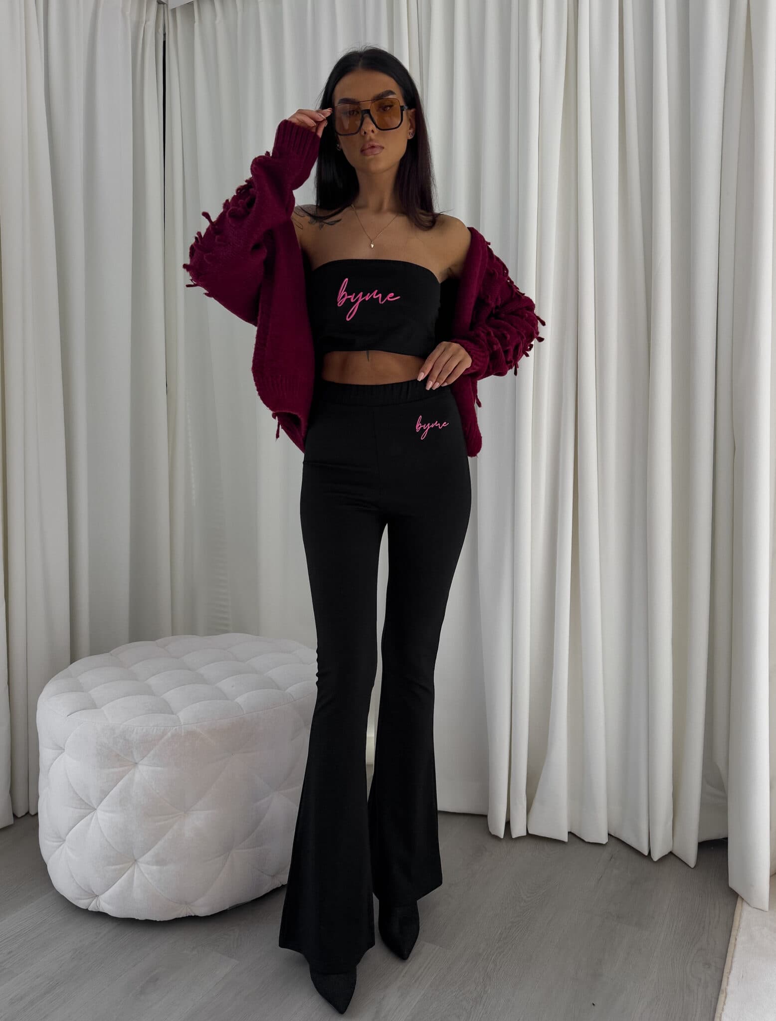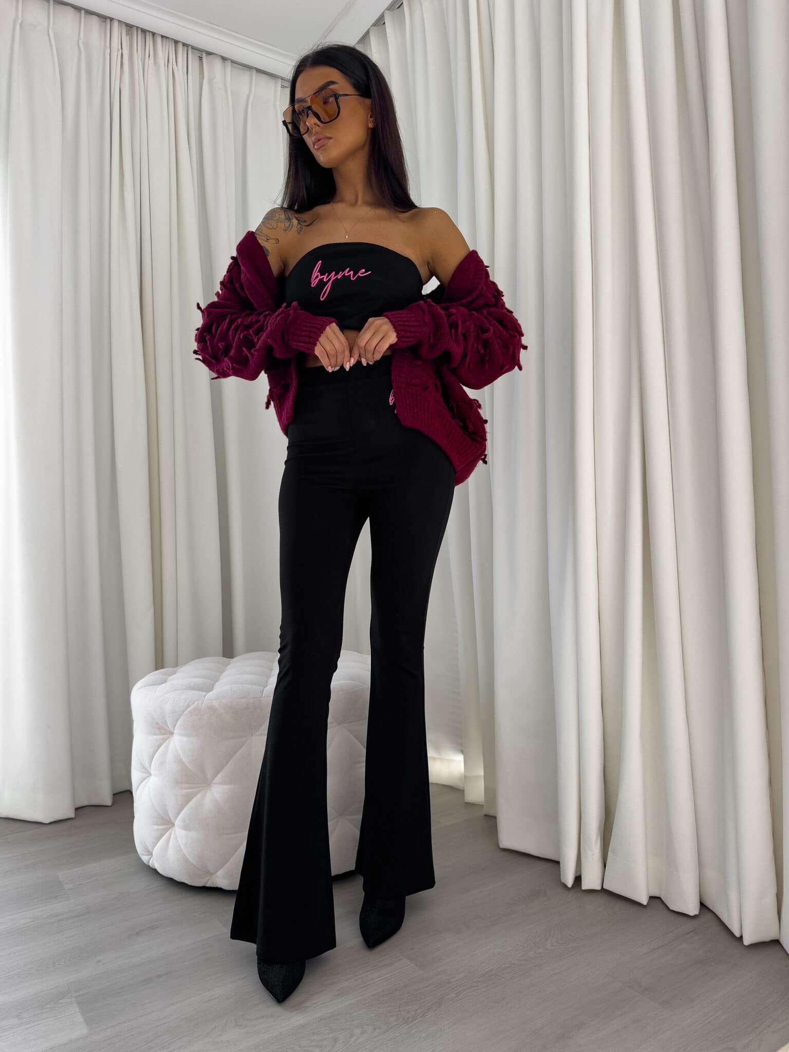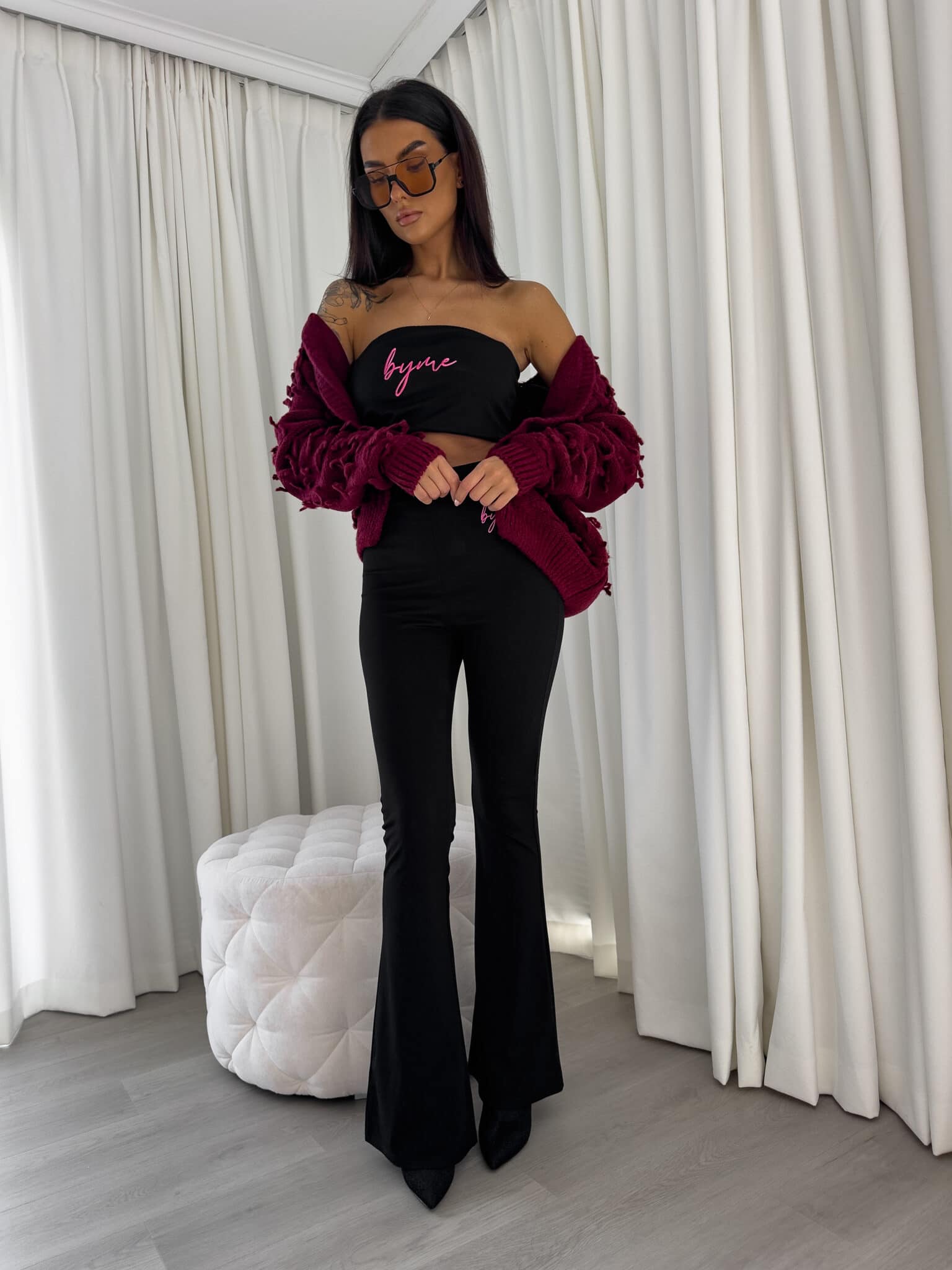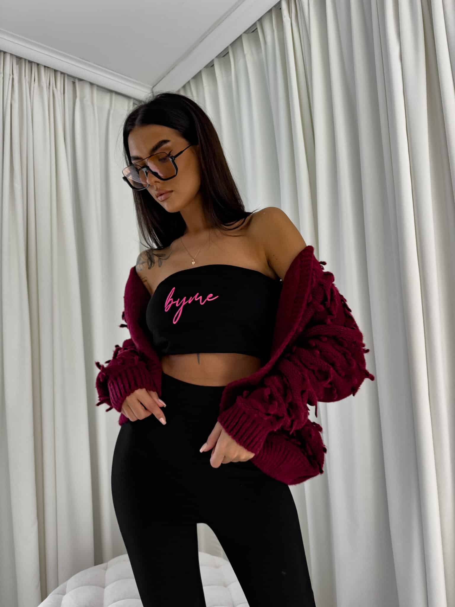 Ein stilvolles Set bestehend aus zwei Elementen - einem Oberteil und einer Hose. Top in Form eines Stirnbands mit Logo in der Mitte, ohne Träger, aus elastischem, körperanliegendem Material, betont perfekt die oberen Teile der Figur. Hosen mit hoher Taille - ein kleines Logo an der Seite und ein elastisches Band an der Taille, verlängern die Beine schön und betonen die Taille. Das Ganze sorgt für Tragekomfort und den Effekt des Abnehmens der Silhouette.