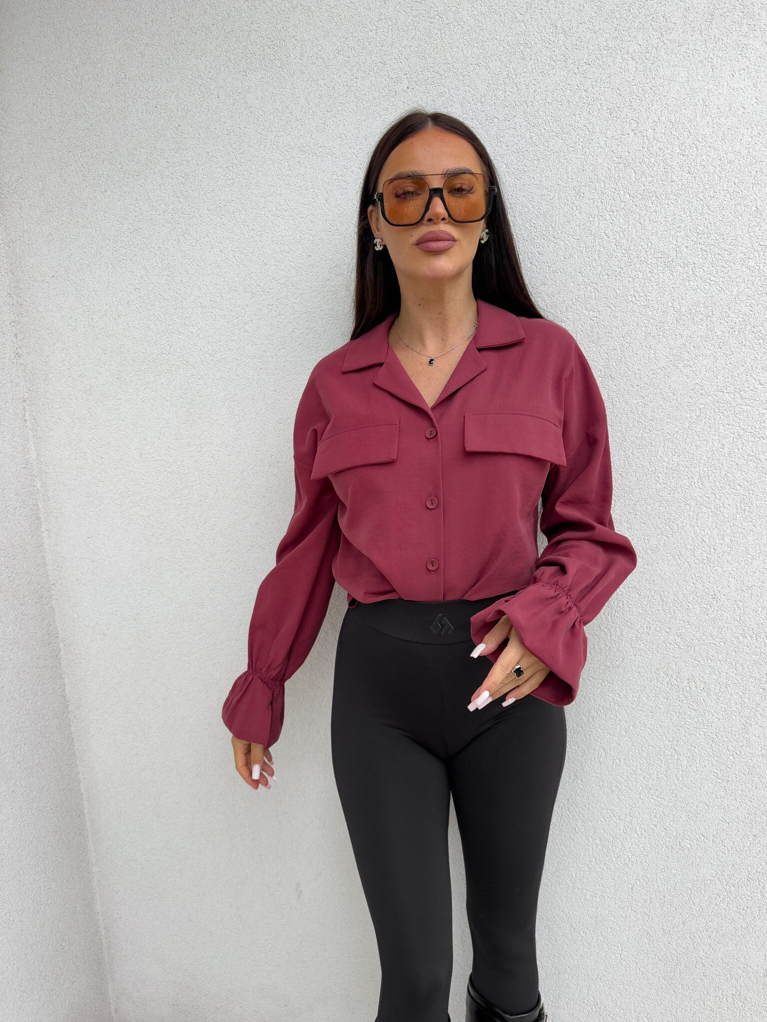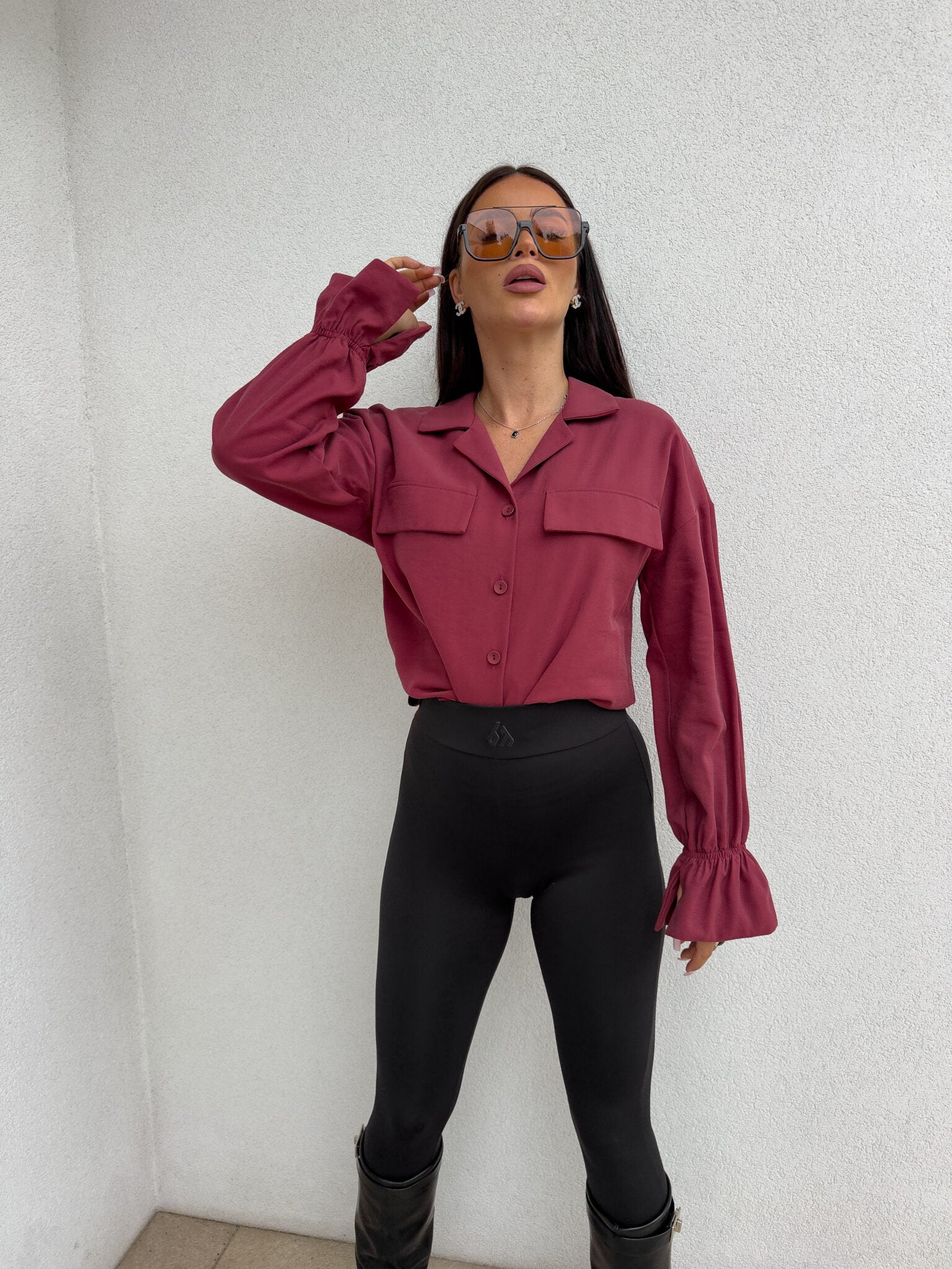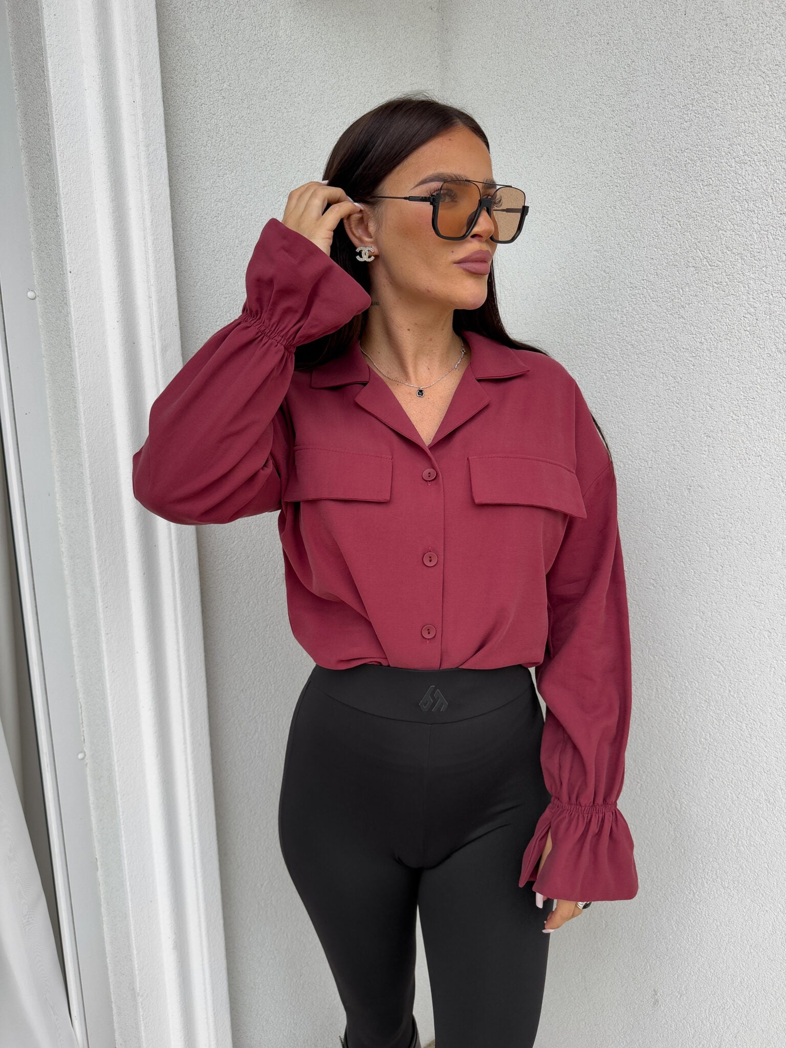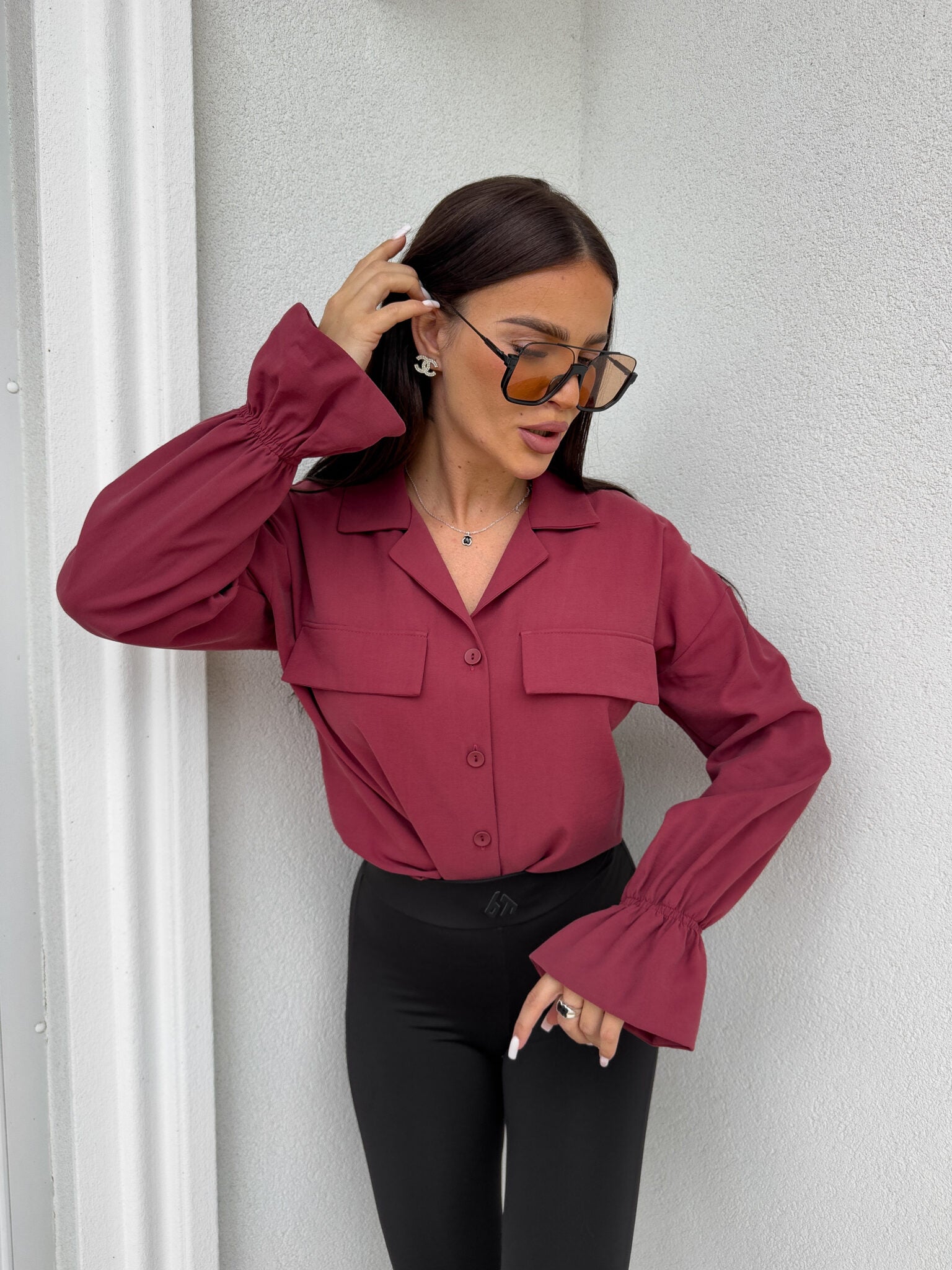 Stilvolles Hemd mit lässigem Oversize-Schnitt, befestigt mit Knöpfen. Der klassische, umklappbare Kragen verleiht die ganze Eleganz, zwei symmetrische Taschen mit Klappen auf Brusthöhe. Lange Ärmel mit breiten Bündchen mit dekorativen Rüschen.