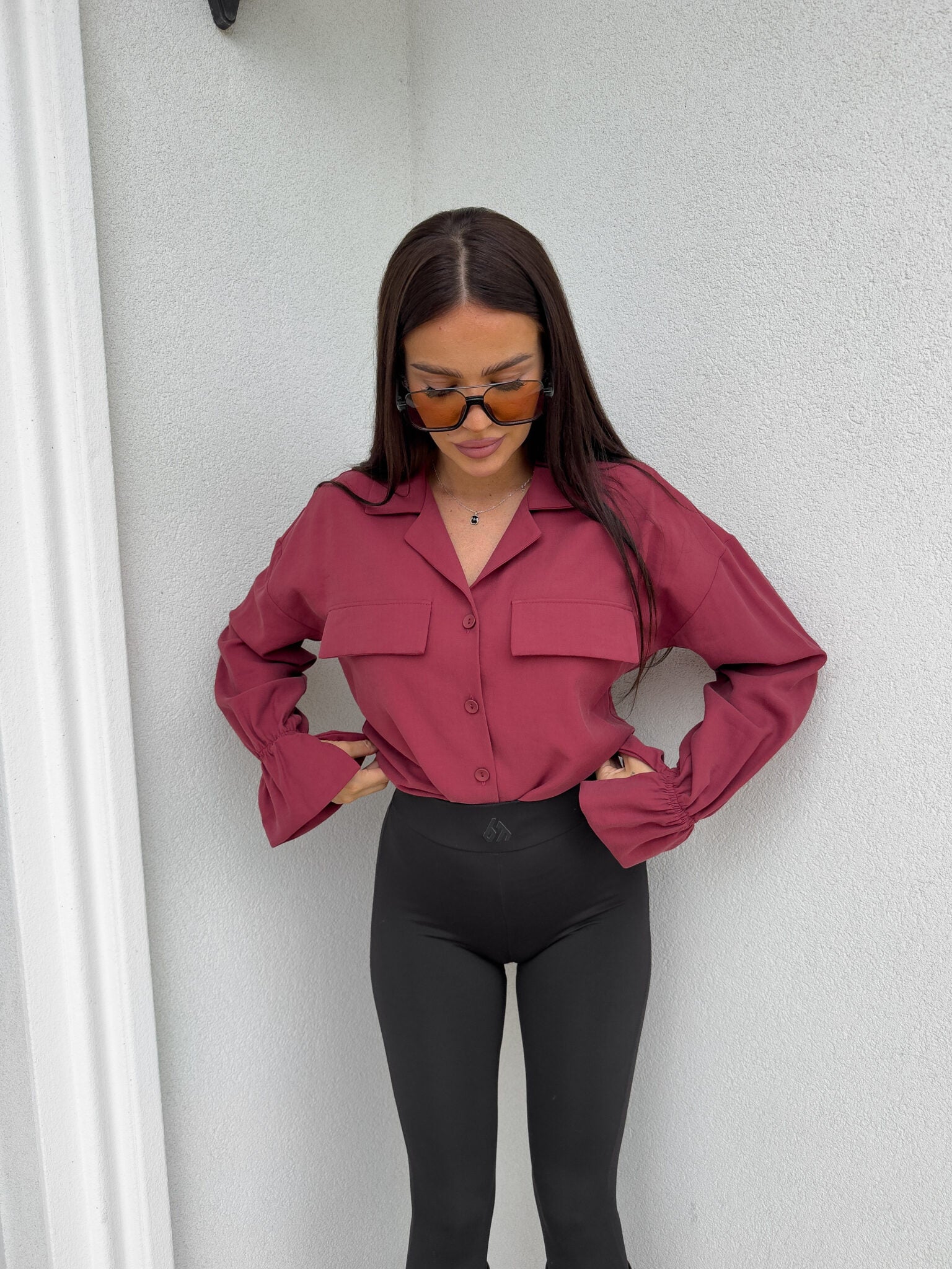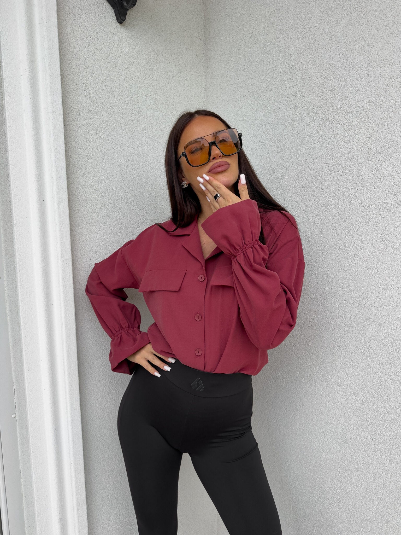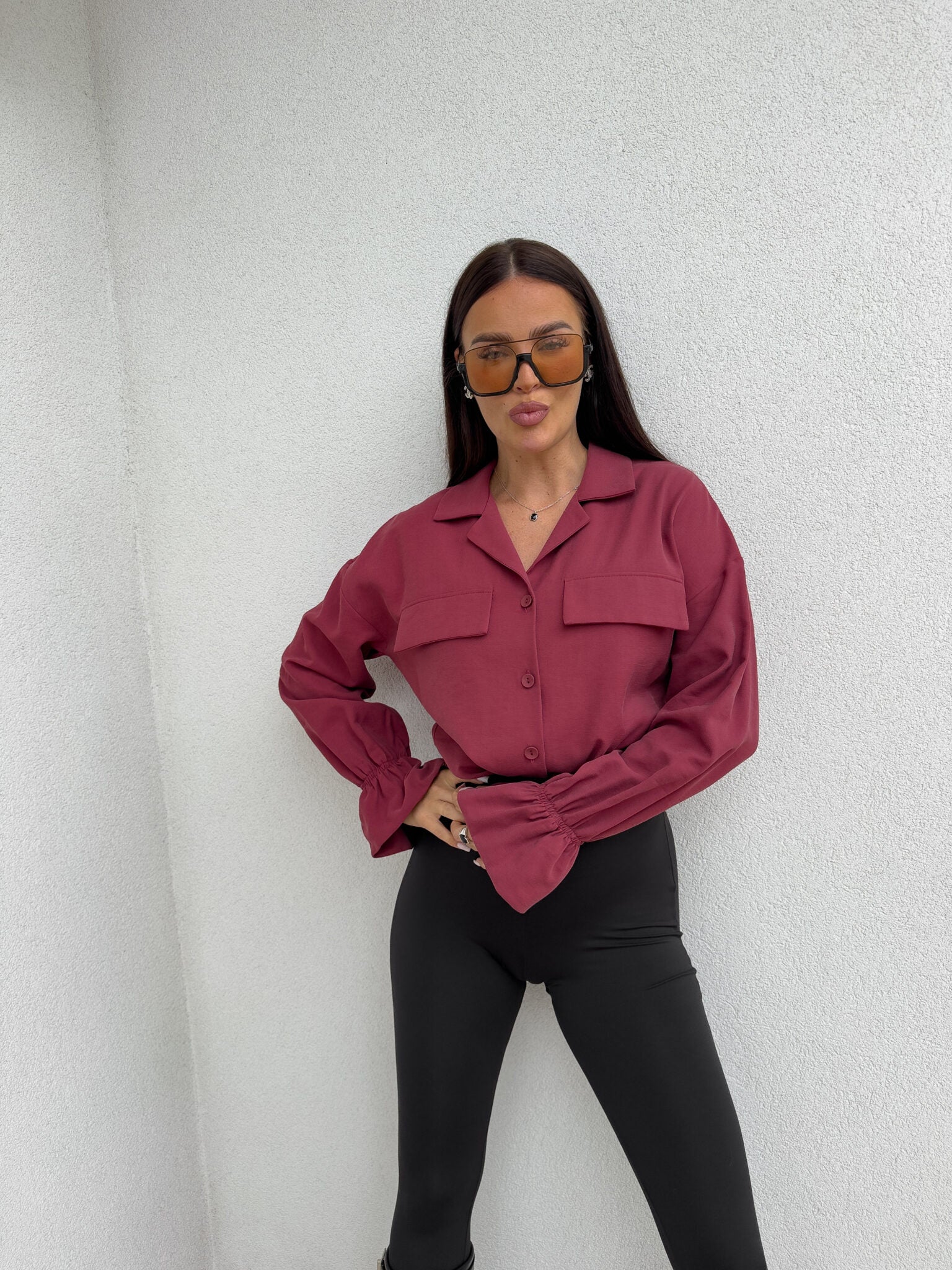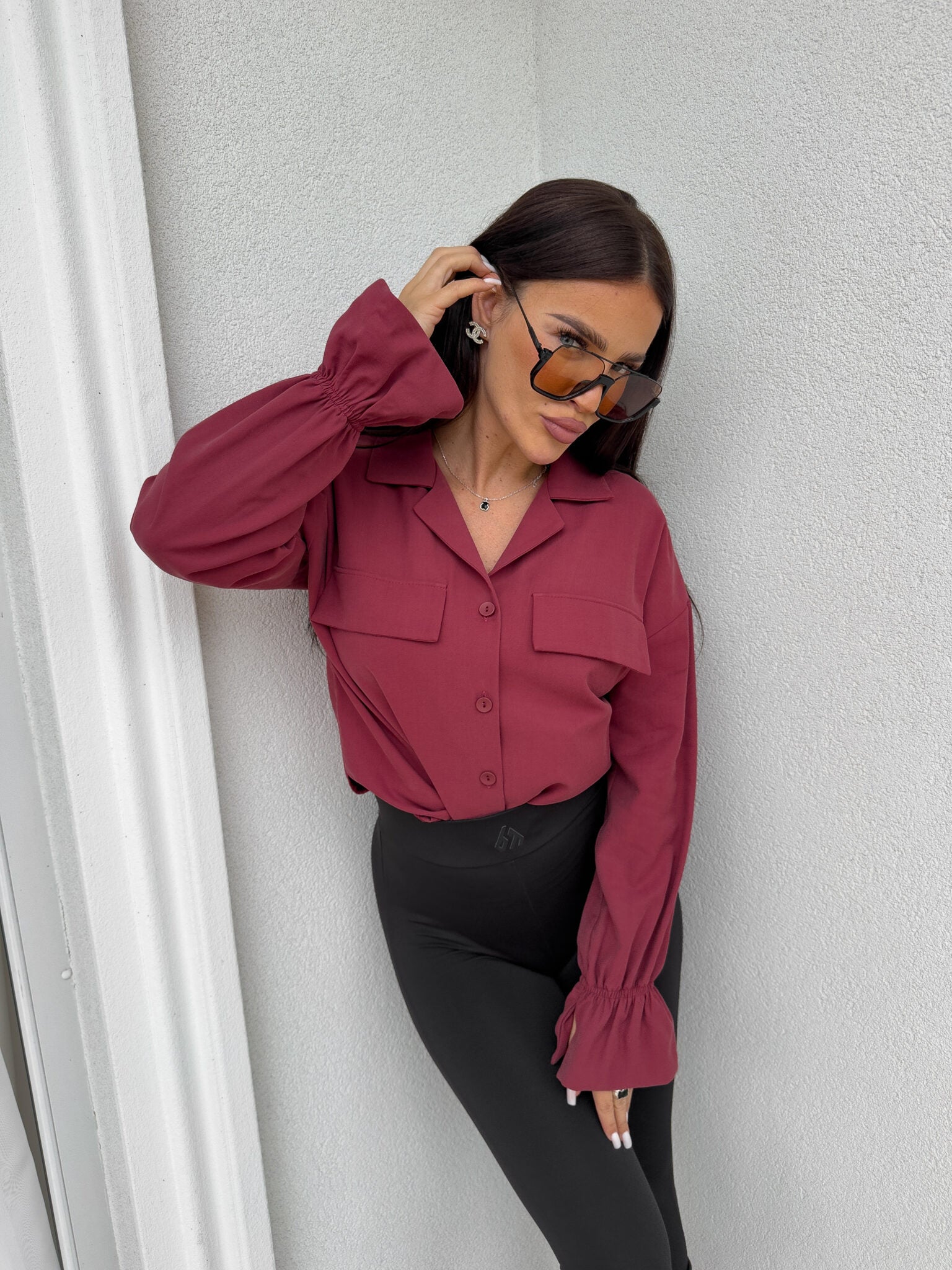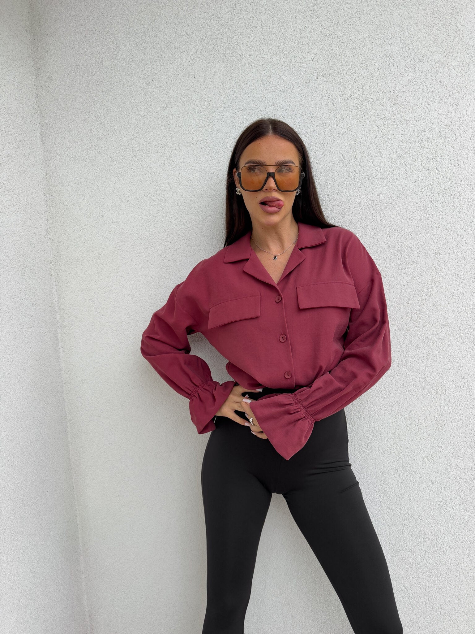 Stilvolles Hemd mit lässigem Oversize-Schnitt, befestigt mit Knöpfen. Der klassische, umklappbare Kragen verleiht die ganze Eleganz, zwei symmetrische Taschen mit Klappen auf Brusthöhe. Lange Ärmel mit breiten Bündchen mit dekorativen Rüschen.