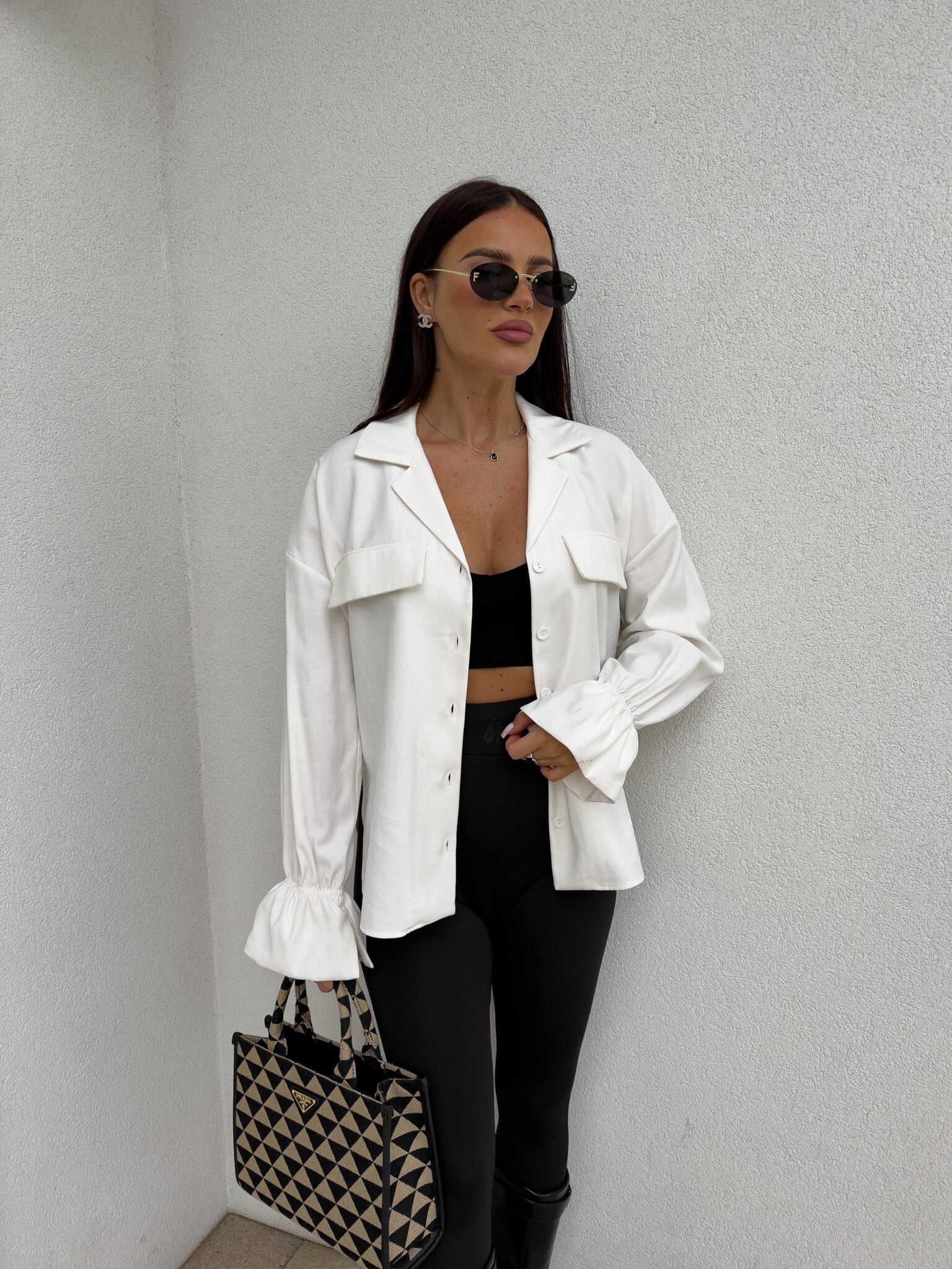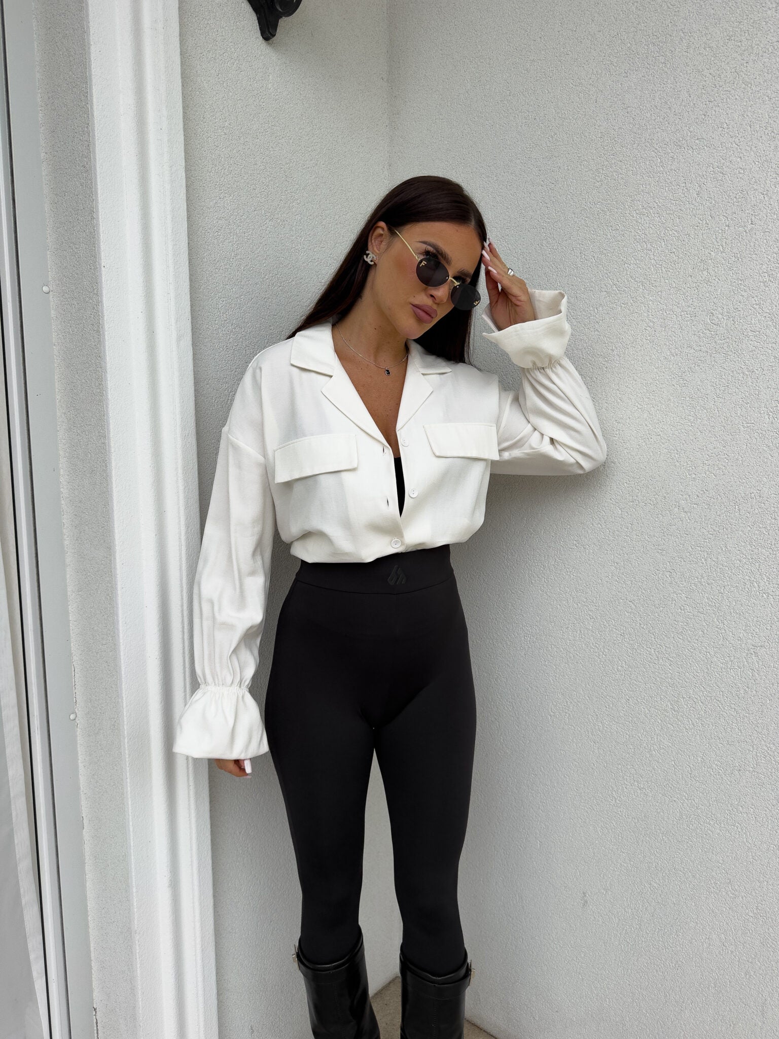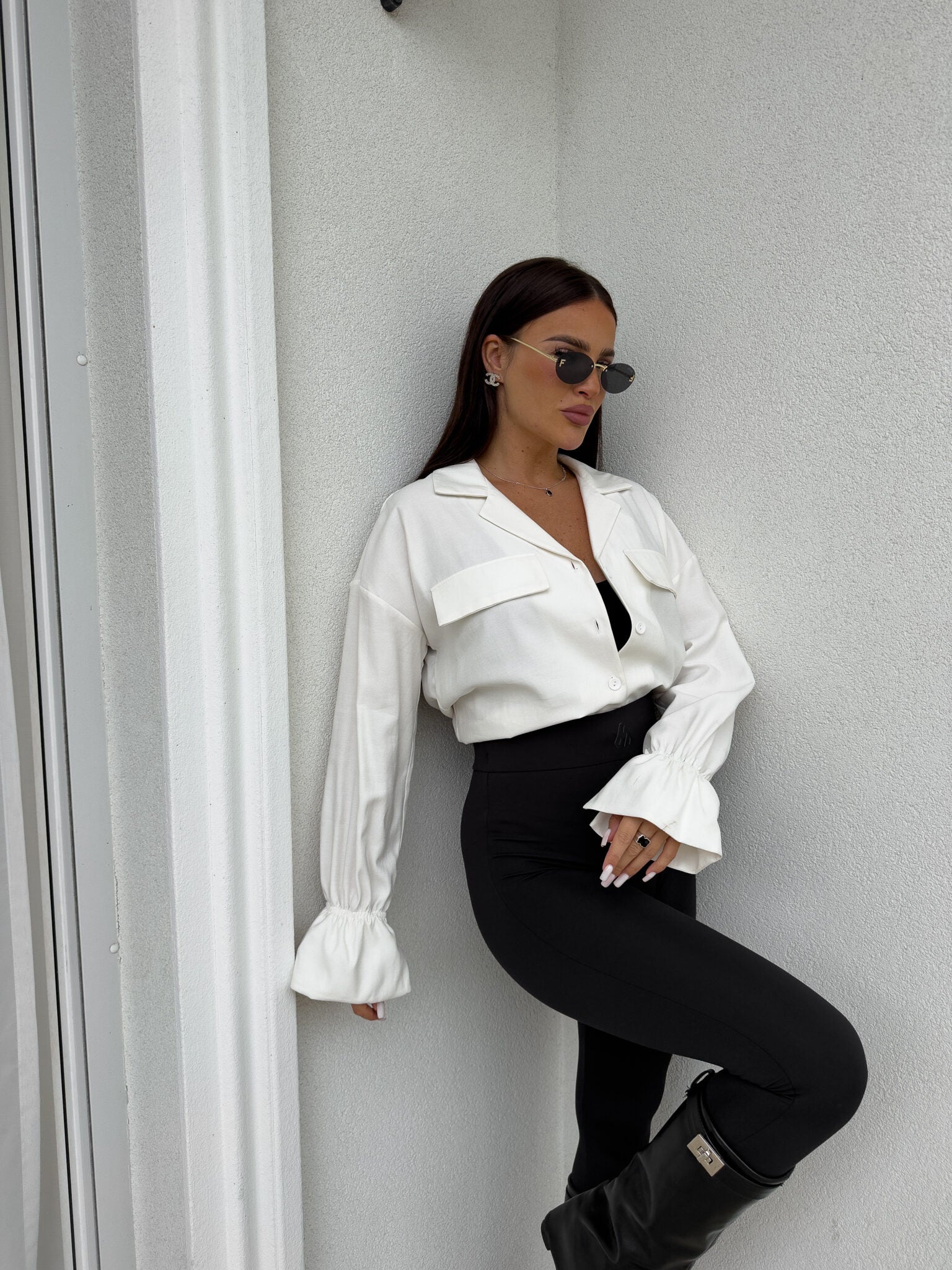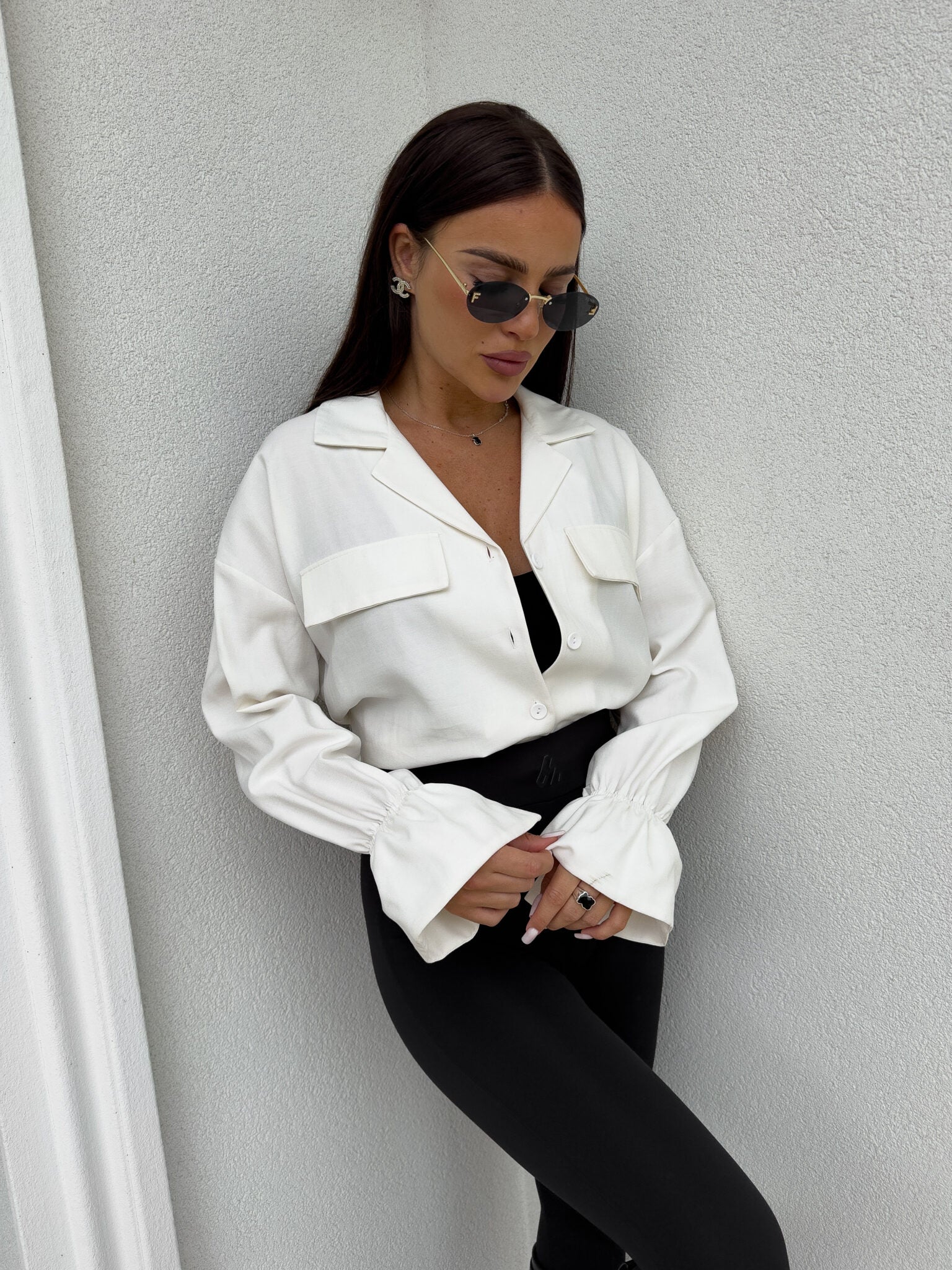 Stilvolles Hemd mit lässigem Oversize-Schnitt, befestigt mit Knöpfen. Der klassische, umklappbare Kragen verleiht die ganze Eleganz, zwei symmetrische Taschen mit Klappen auf Brusthöhe. Lange Ärmel mit breiten Bündchen mit dekorativen Rüschen.