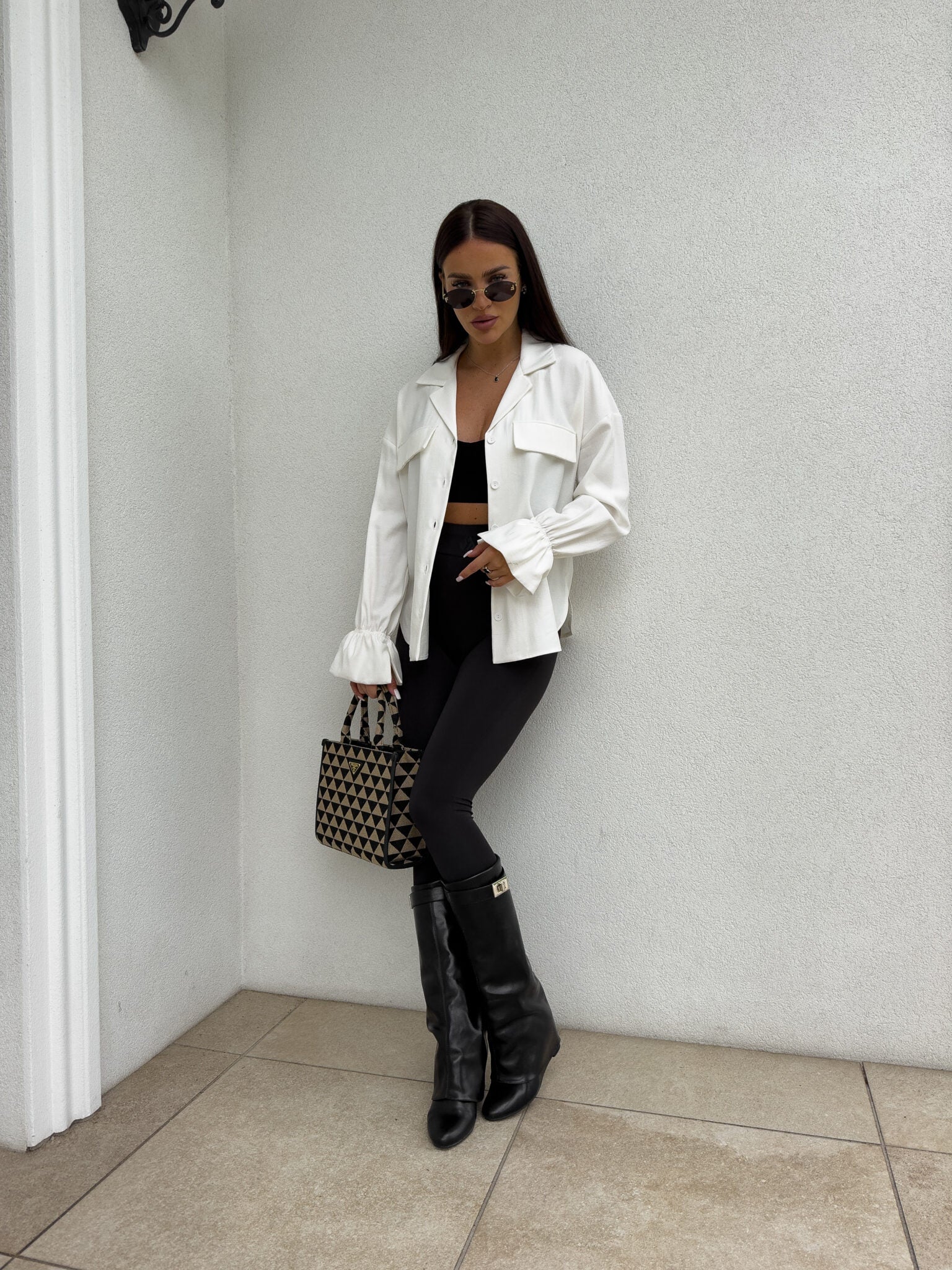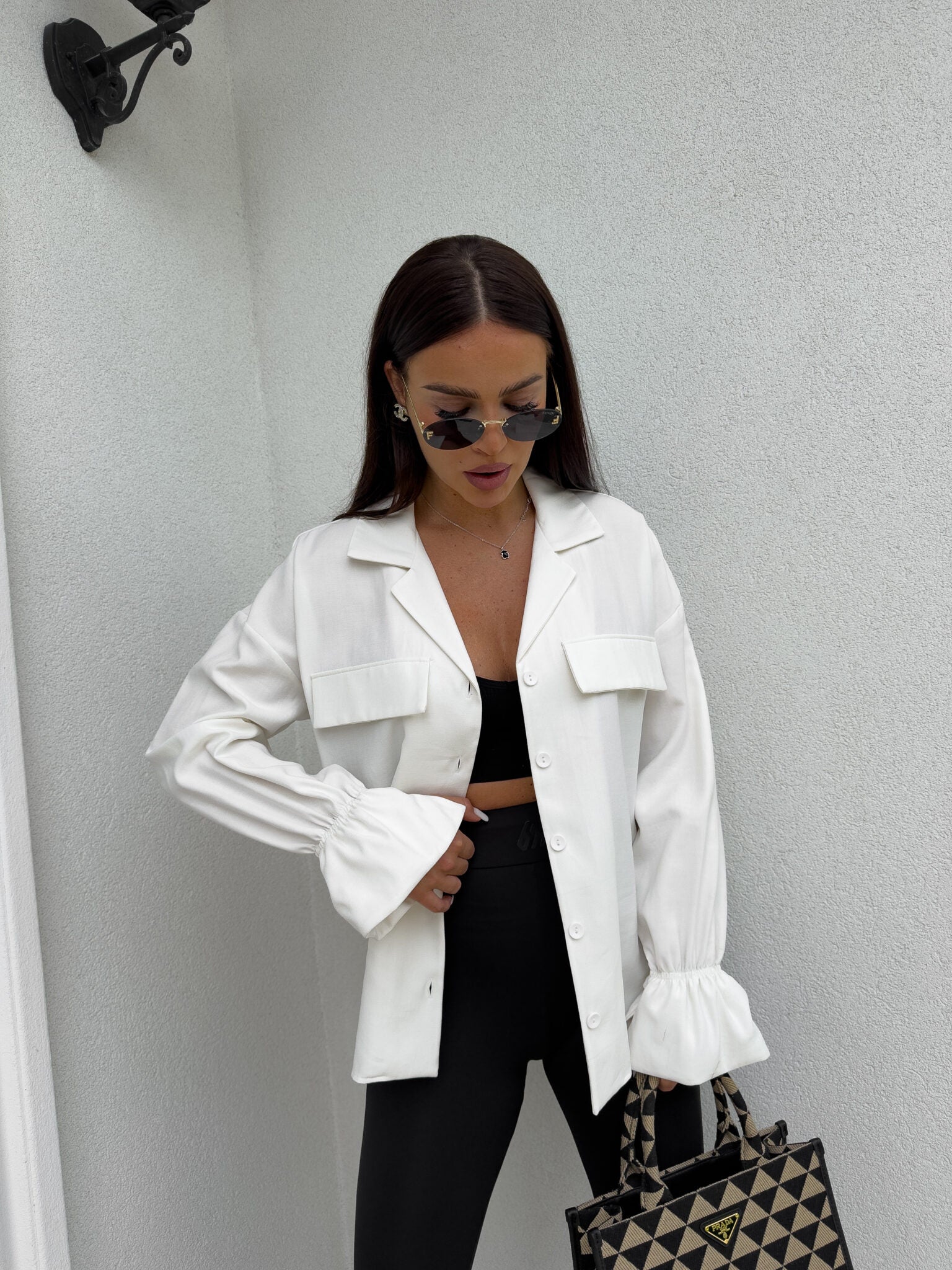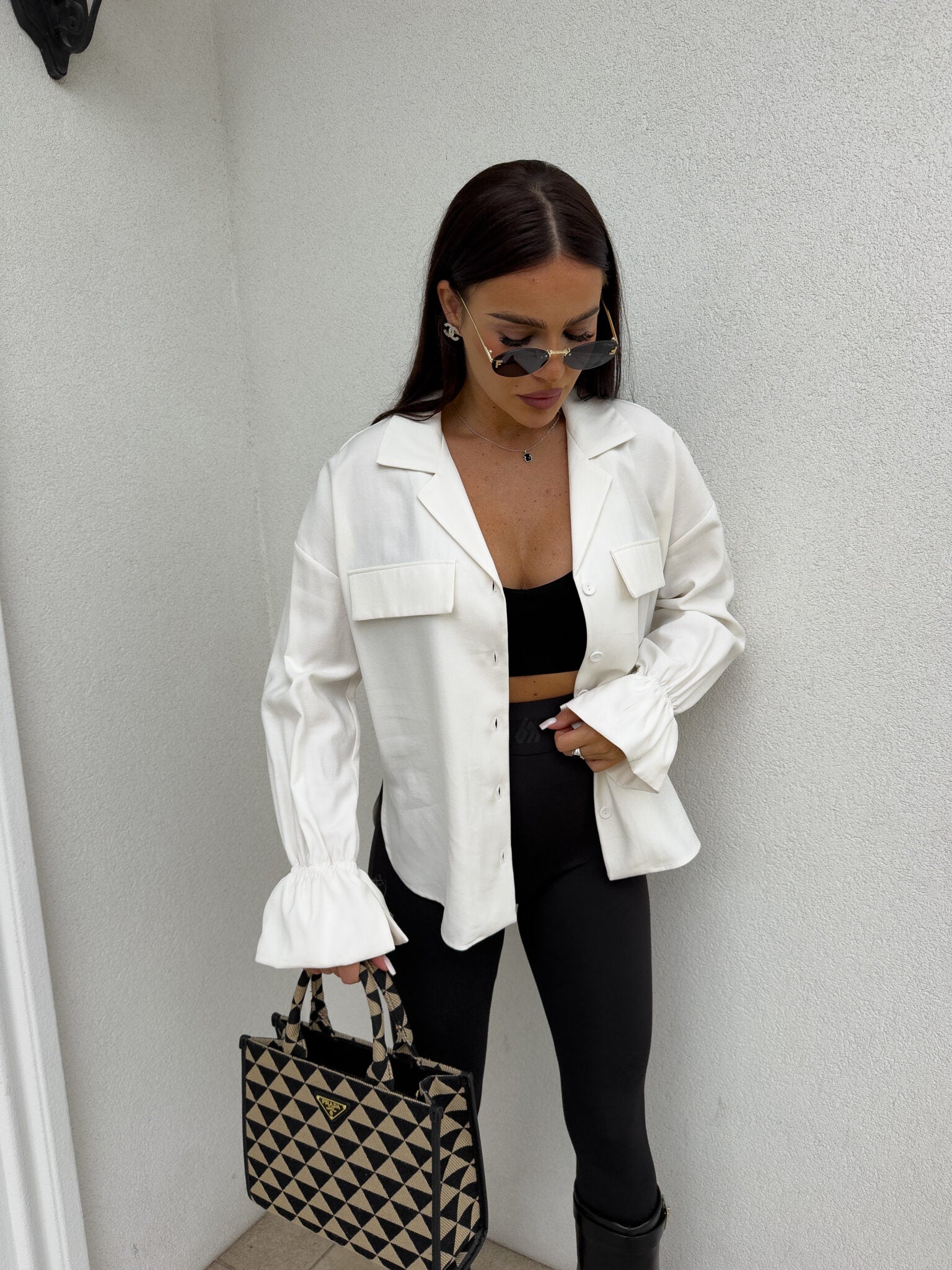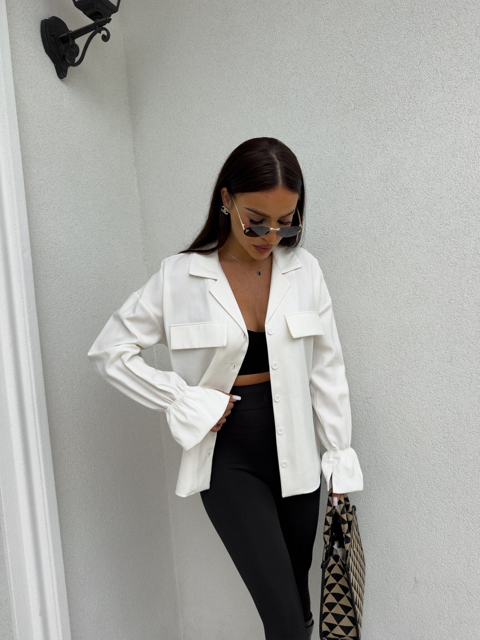 Stilvolles Hemd mit lässigem Oversize-Schnitt, befestigt mit Knöpfen. Der klassische, umklappbare Kragen verleiht die ganze Eleganz, zwei symmetrische Taschen mit Klappen auf Brusthöhe. Lange Ärmel mit breiten Bündchen mit dekorativen Rüschen.