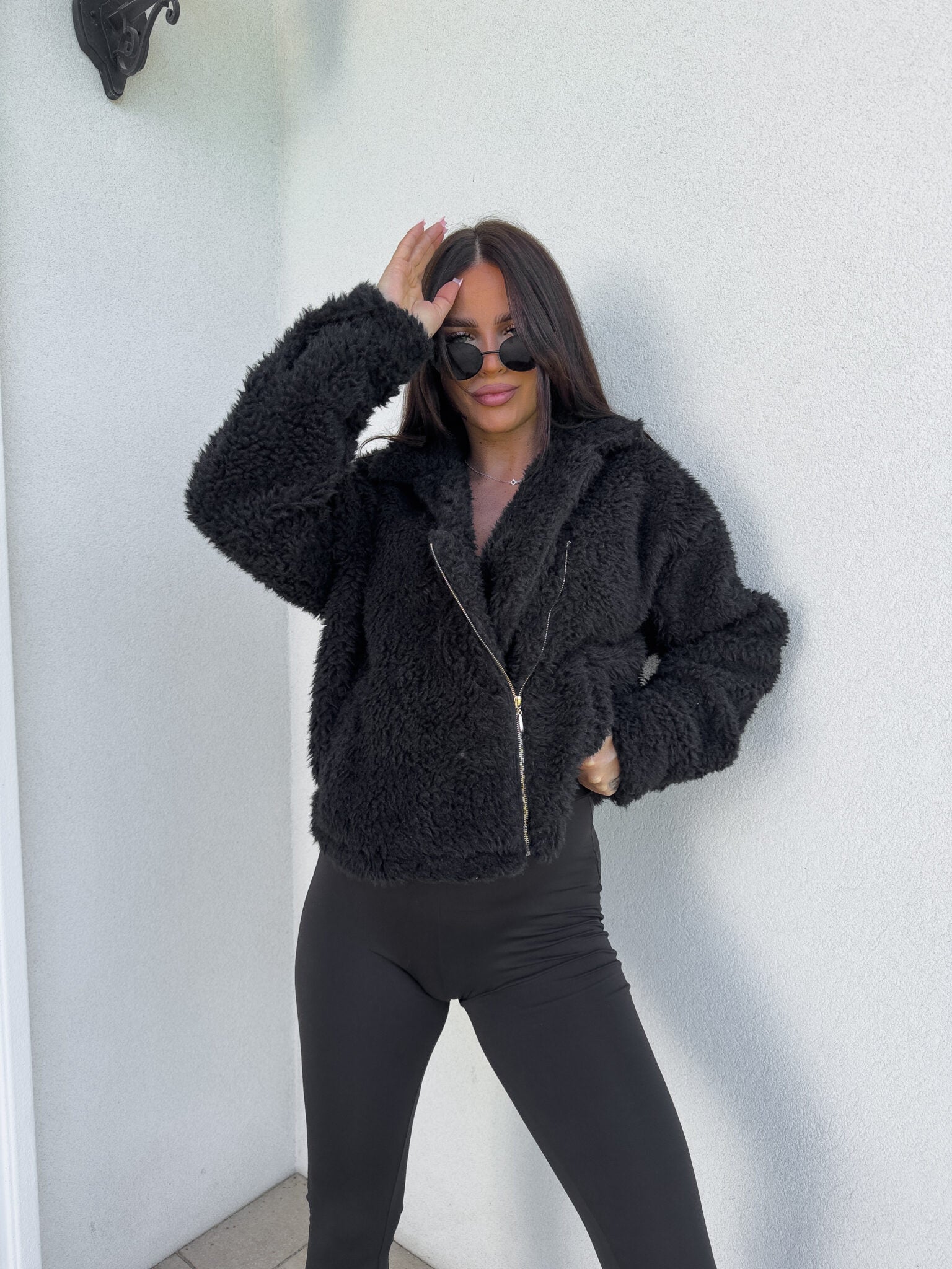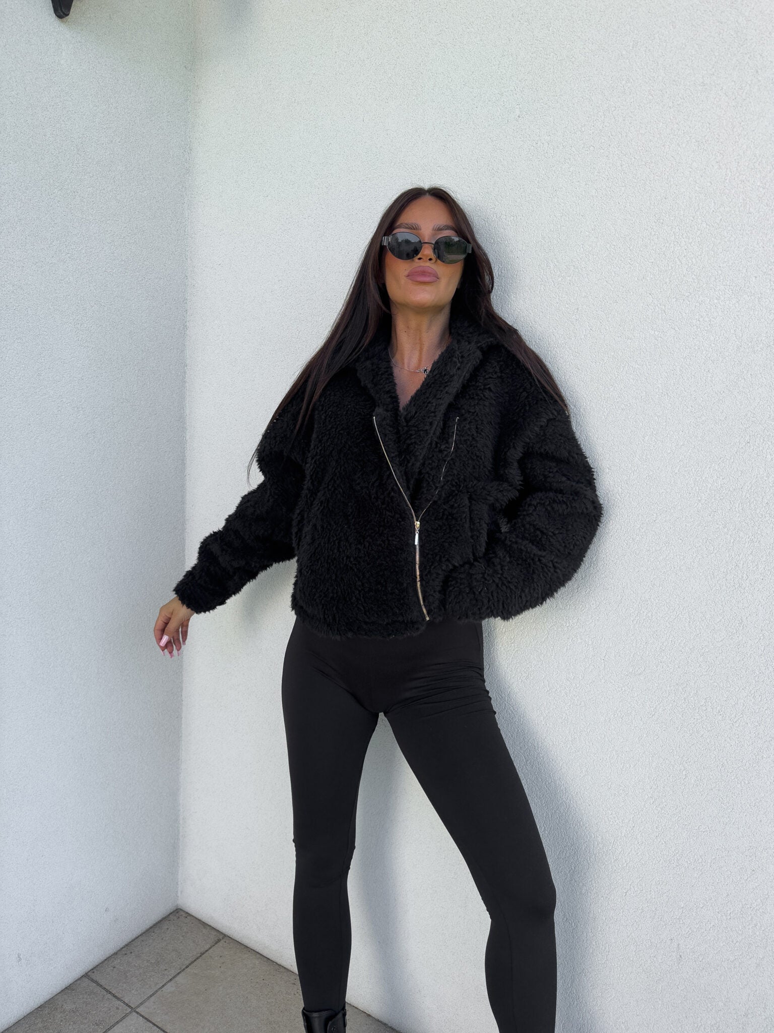 Stilvolle und kuschelige kurze Jacke aus extrem weichem, flauschigem pelzartigem Material. Mit einem Reißverschluss befestigt, passt es sich perfekt der Figur an und sorgt für Tragekomfort. Der klassische, leicht stehende Kragen, ebenfalls mit Fell versehen, verleiht Eleganz und schützt vor Kälte.