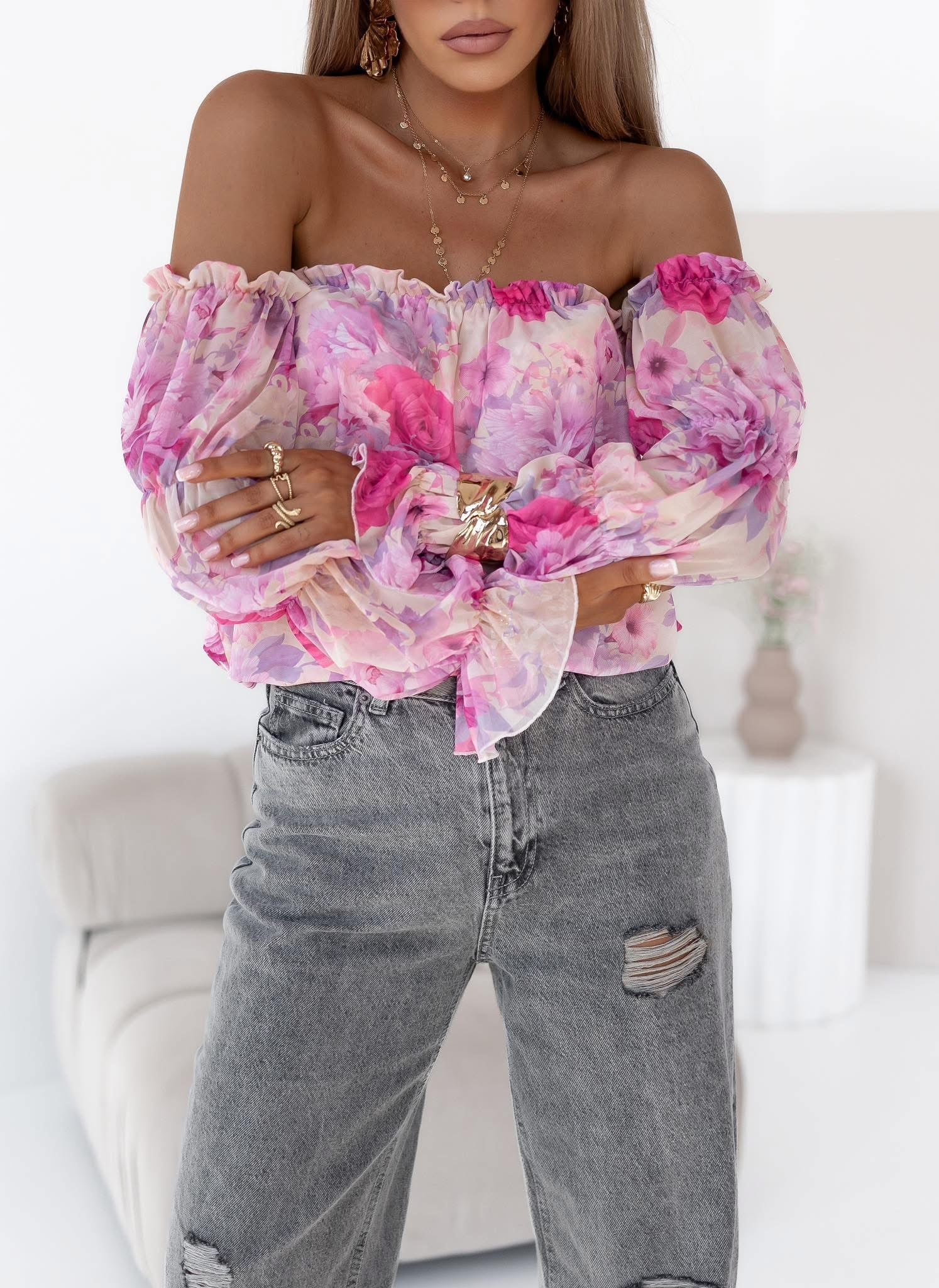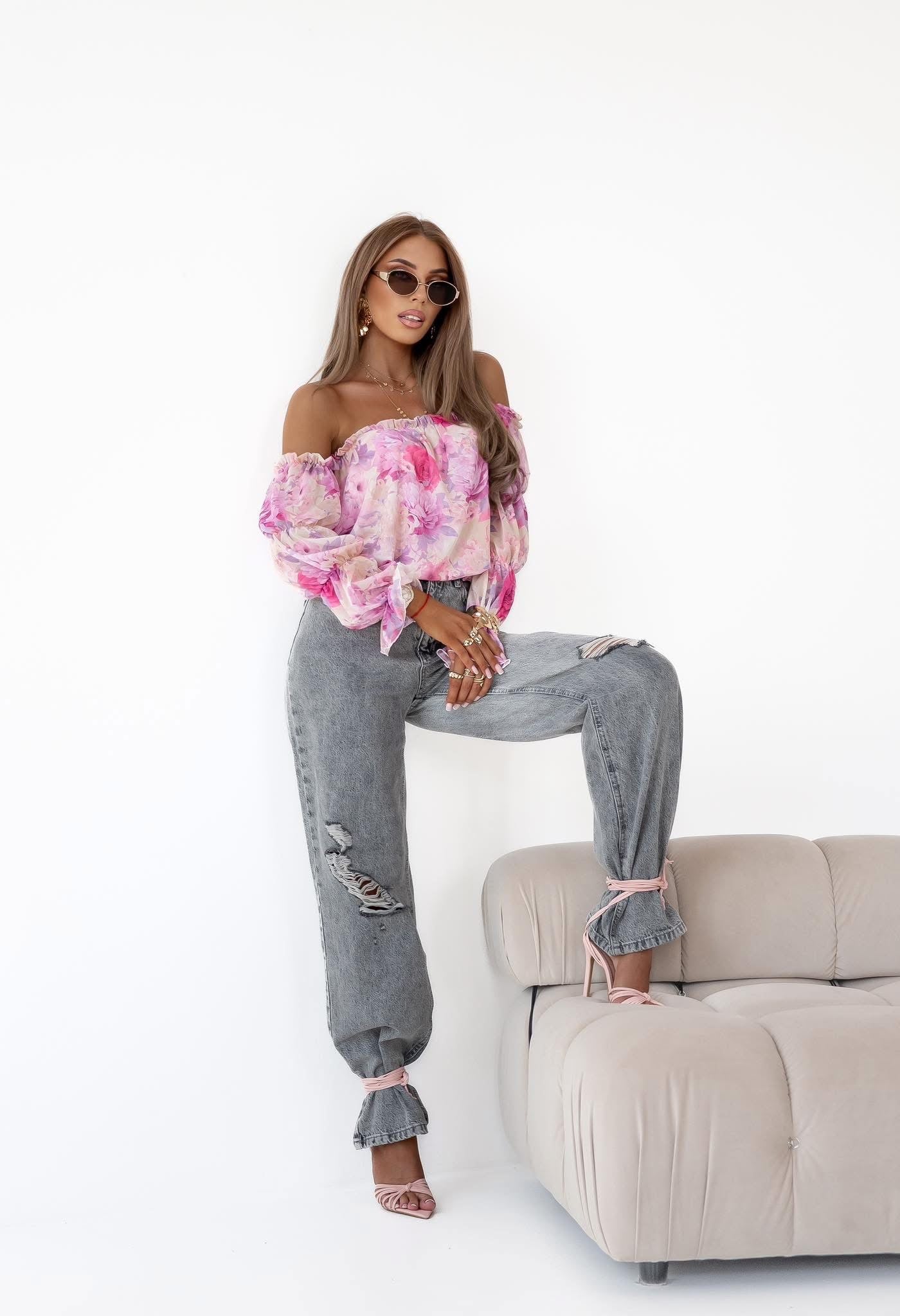 Eine klassische Bluse mit spanischem Schnitt, aus doppeltem Mesh-Material in schönen Blumenmustern.