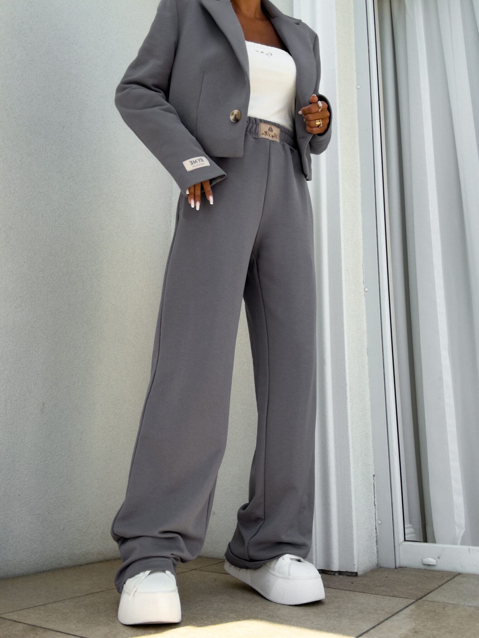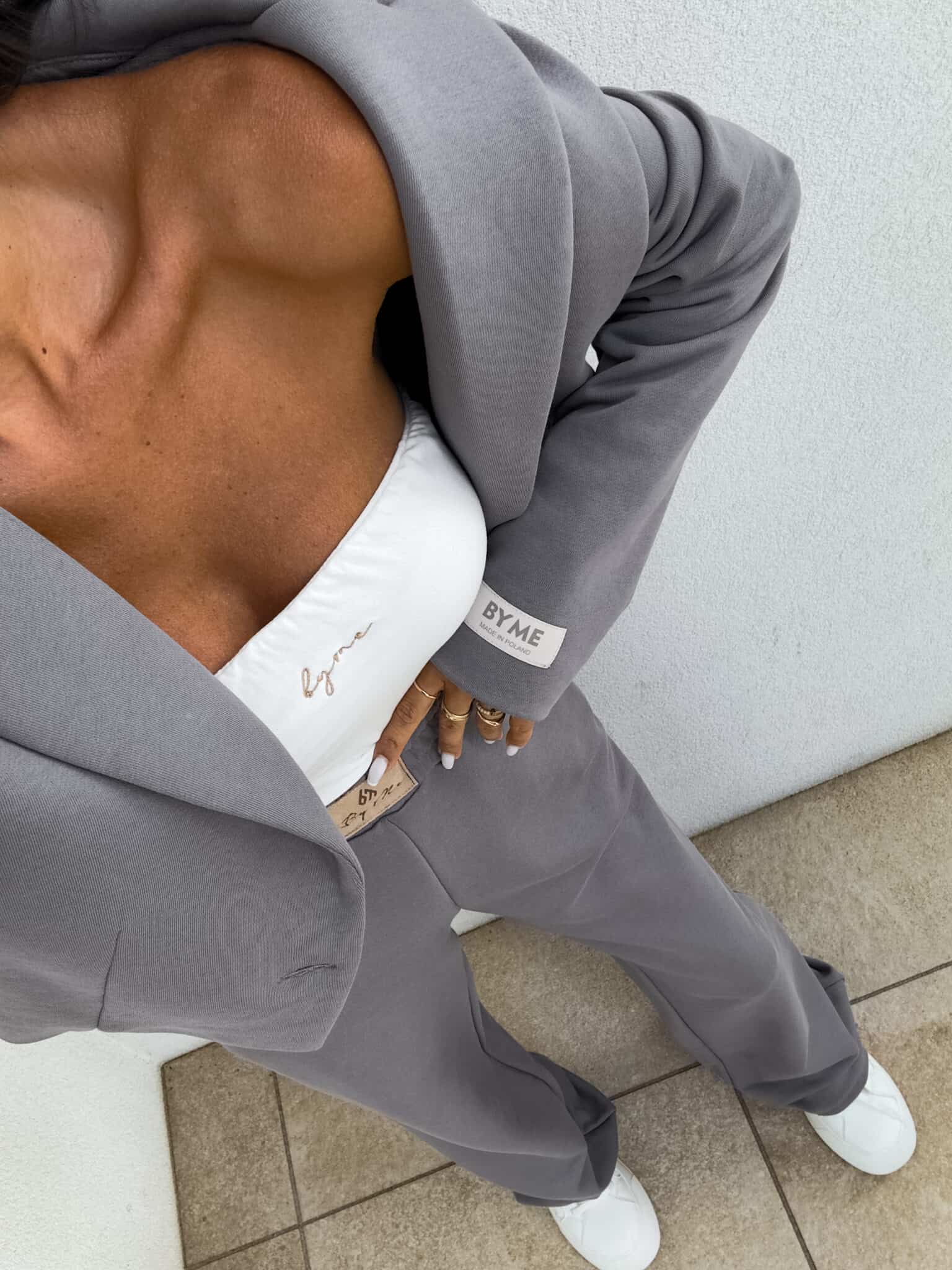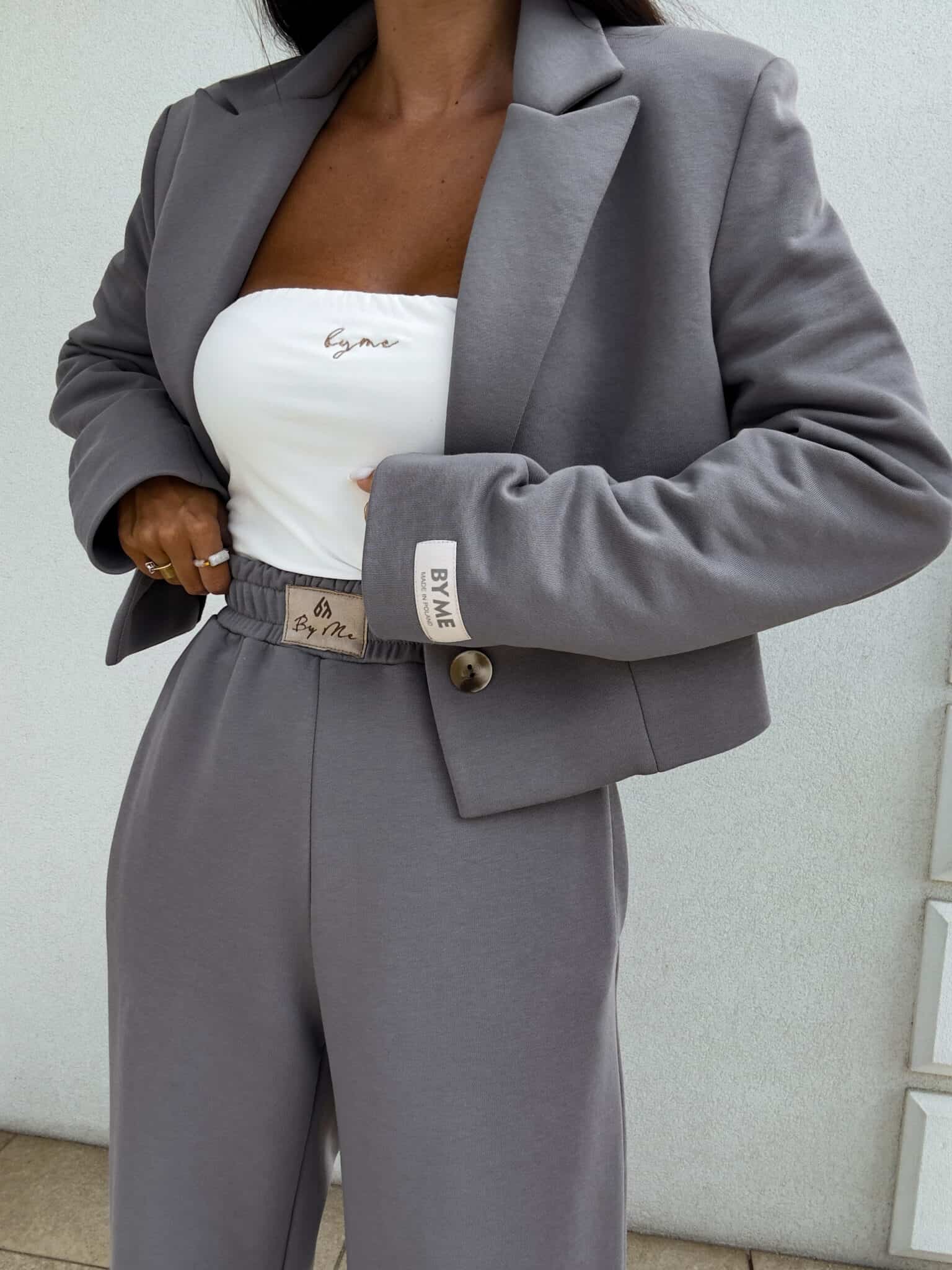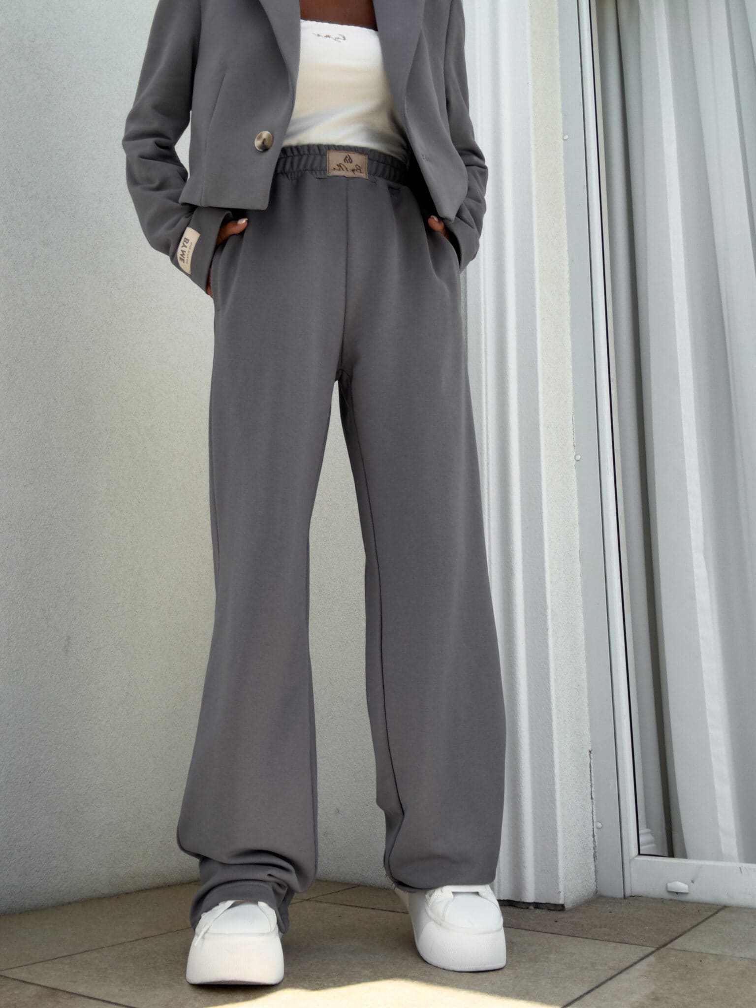 Lockere Jogginghosen mit breiten Beinen sind die perfekte Kombination aus Komfort und lässigem Stil. Sie sind aus weichem Material gefertigt und haben einen geraden Schnitt und breite Beine, die maximalen Komfort und volle Bewegungsfreiheit bieten. An der Taille befindet sich ein Gummiband, dank dem sich die Hose ohne Druck an die Figur anpasst. Ein zusätzliches Detail ist ein subtiles Etikett mit der Inschrift "By Me", die zentral auf das Gummiband genäht ist und den einzigartigen Charakter des Produkts unterstreicht.