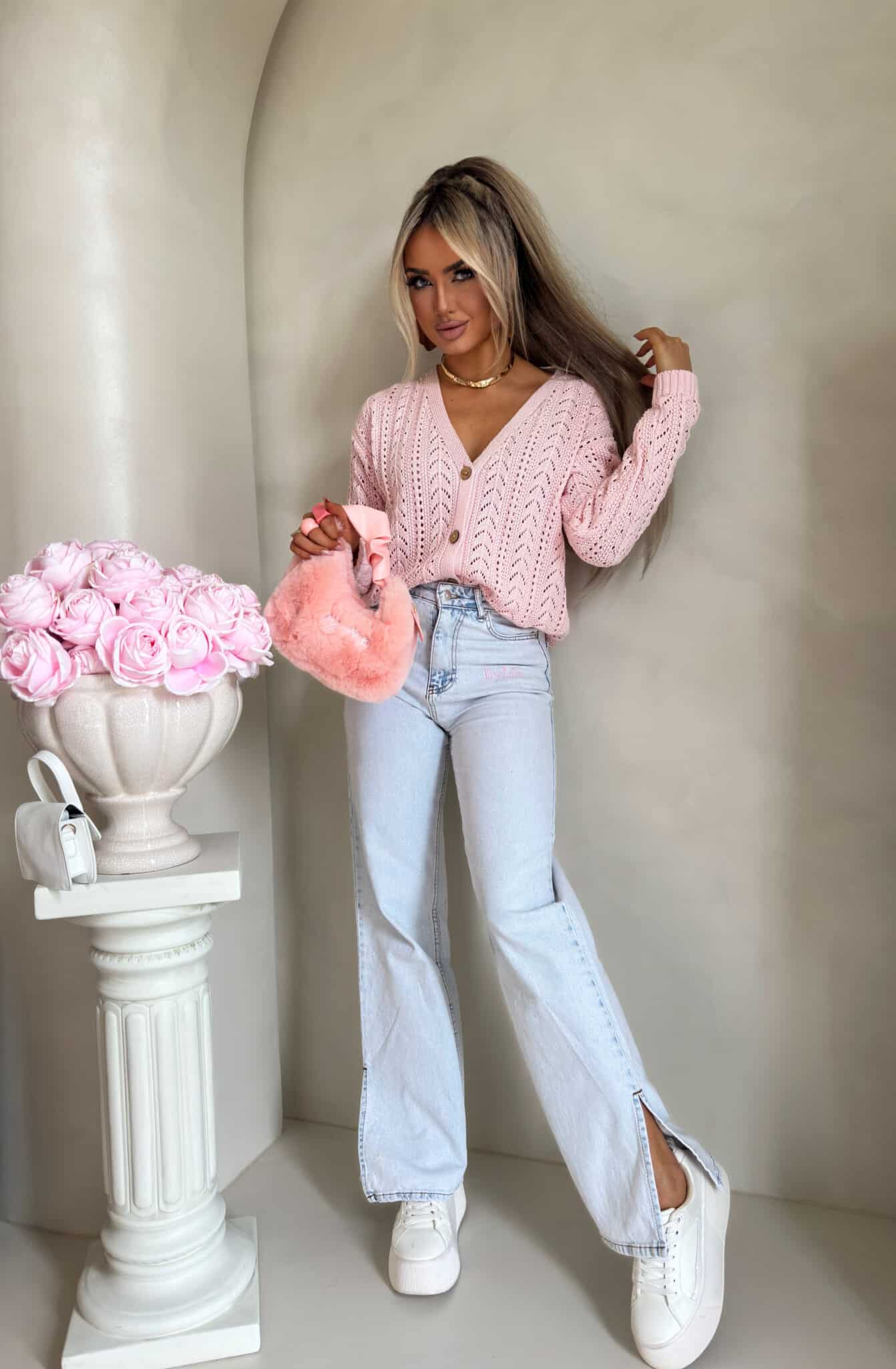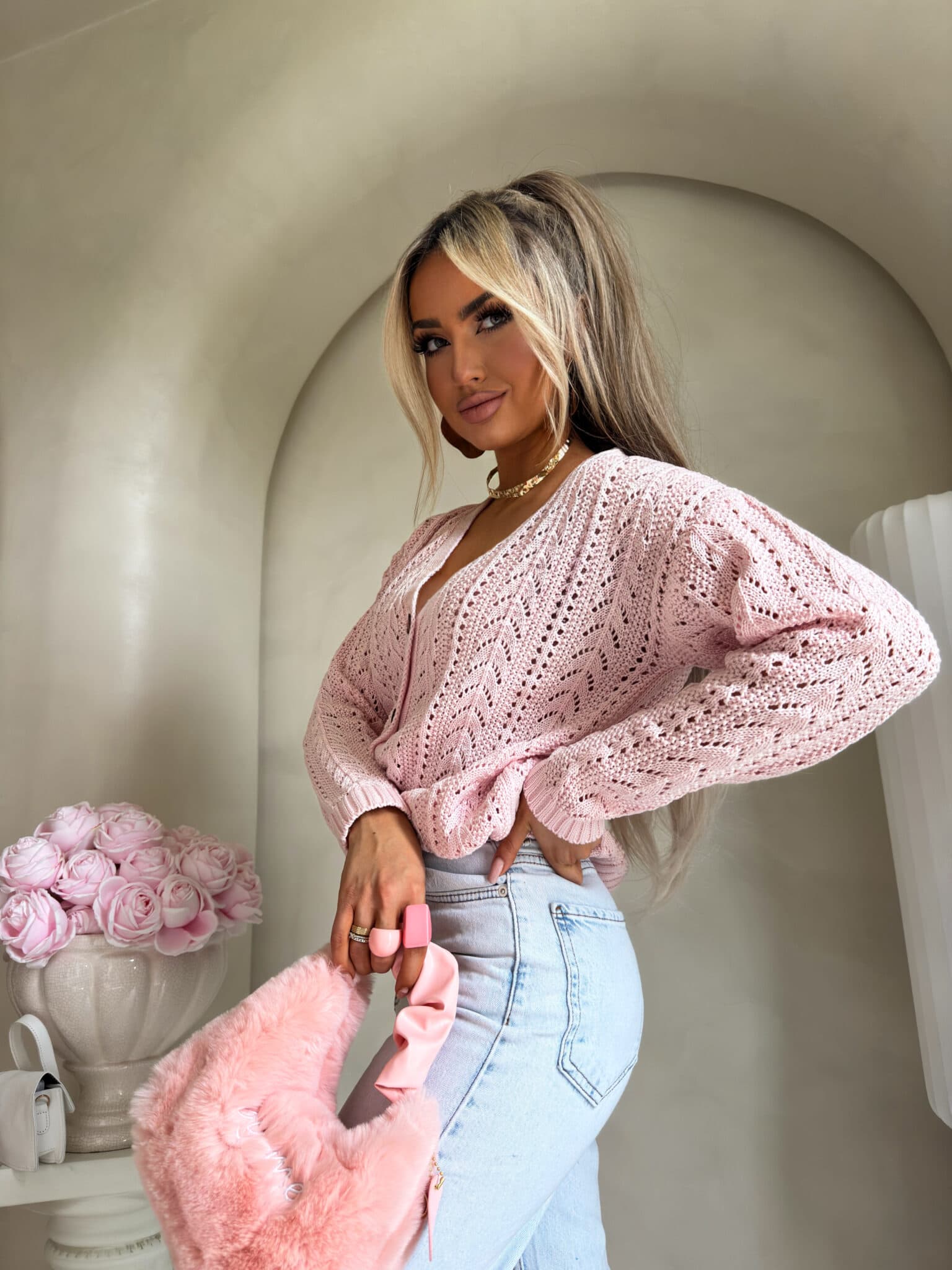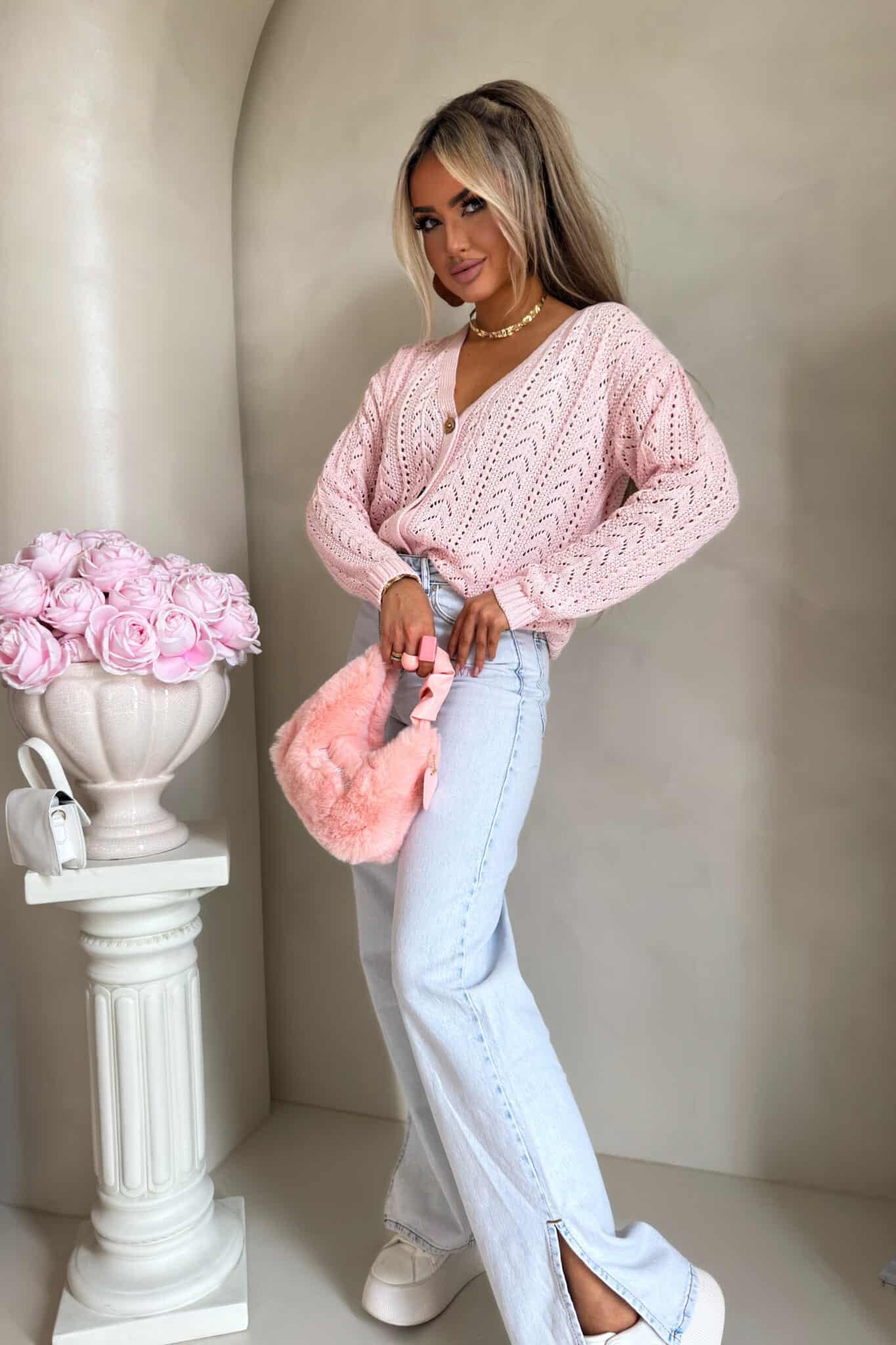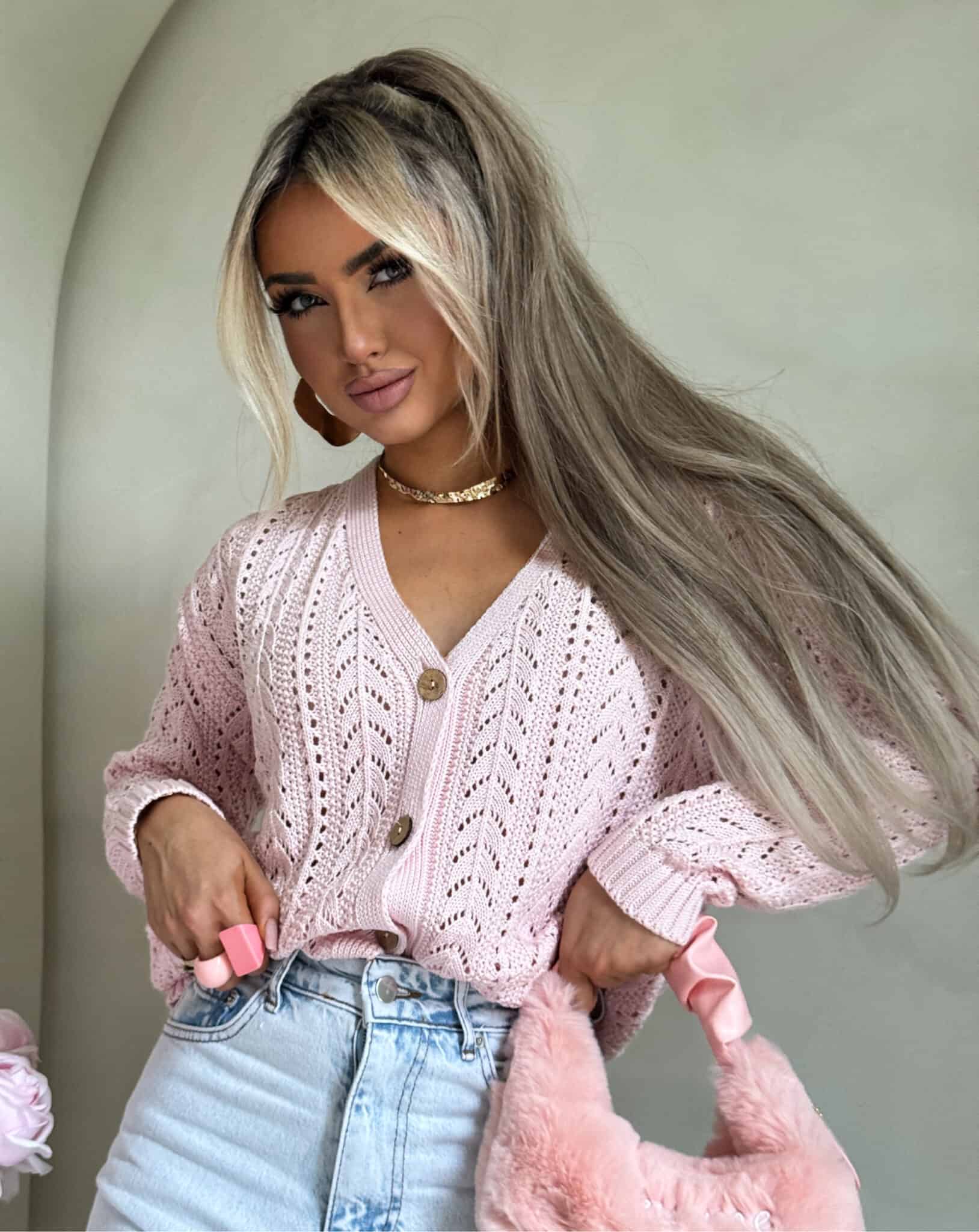 Ein Strickpullover mit einem luftigen, dekorativen Ajourmuster, das dem gesamten Design Leichtigkeit und eine subtile Ausstrahlung verleiht. Das Modell ist kurz geschnitten, verfügt über einen V-Ausschnitt und wird vorne mit stilvollen Holzknöpfen geschlossen. Die langen Ärmel enden mit Strickbündchen – ebenso wie der Saum des Pullovers.