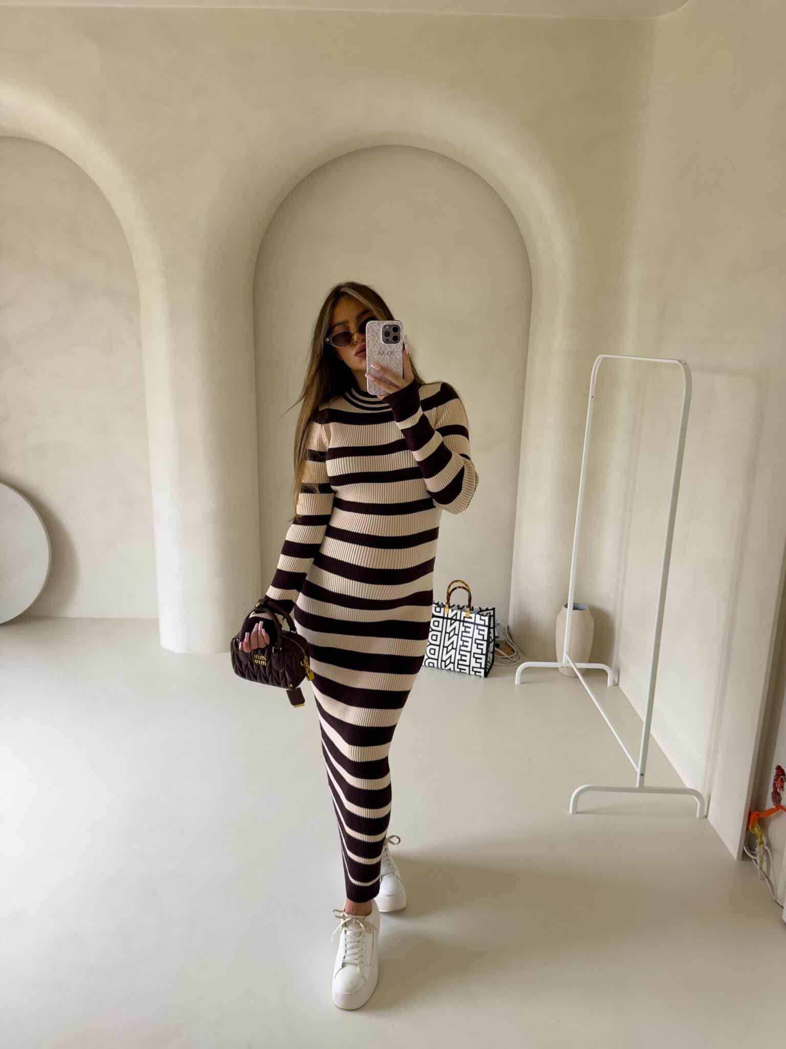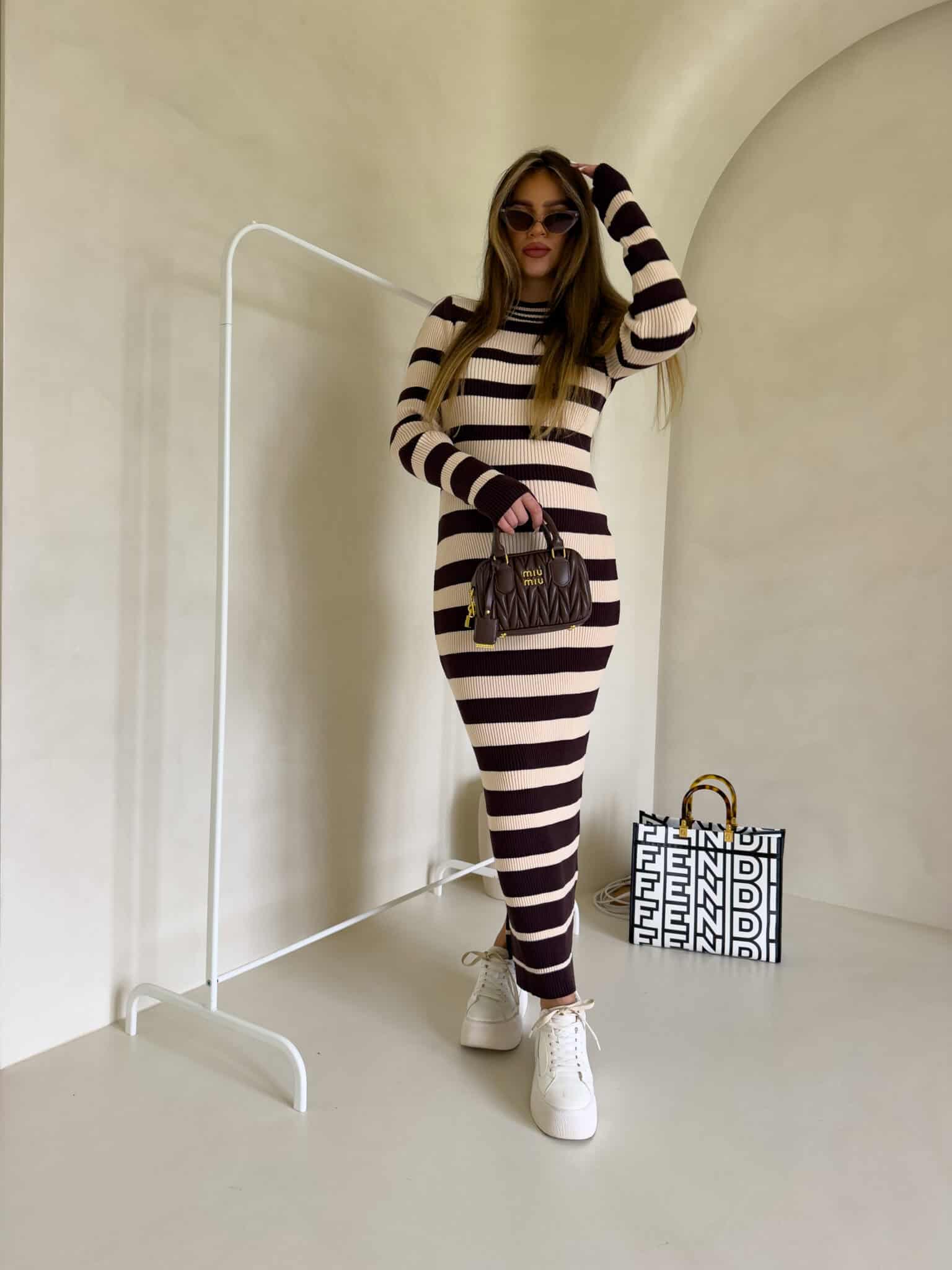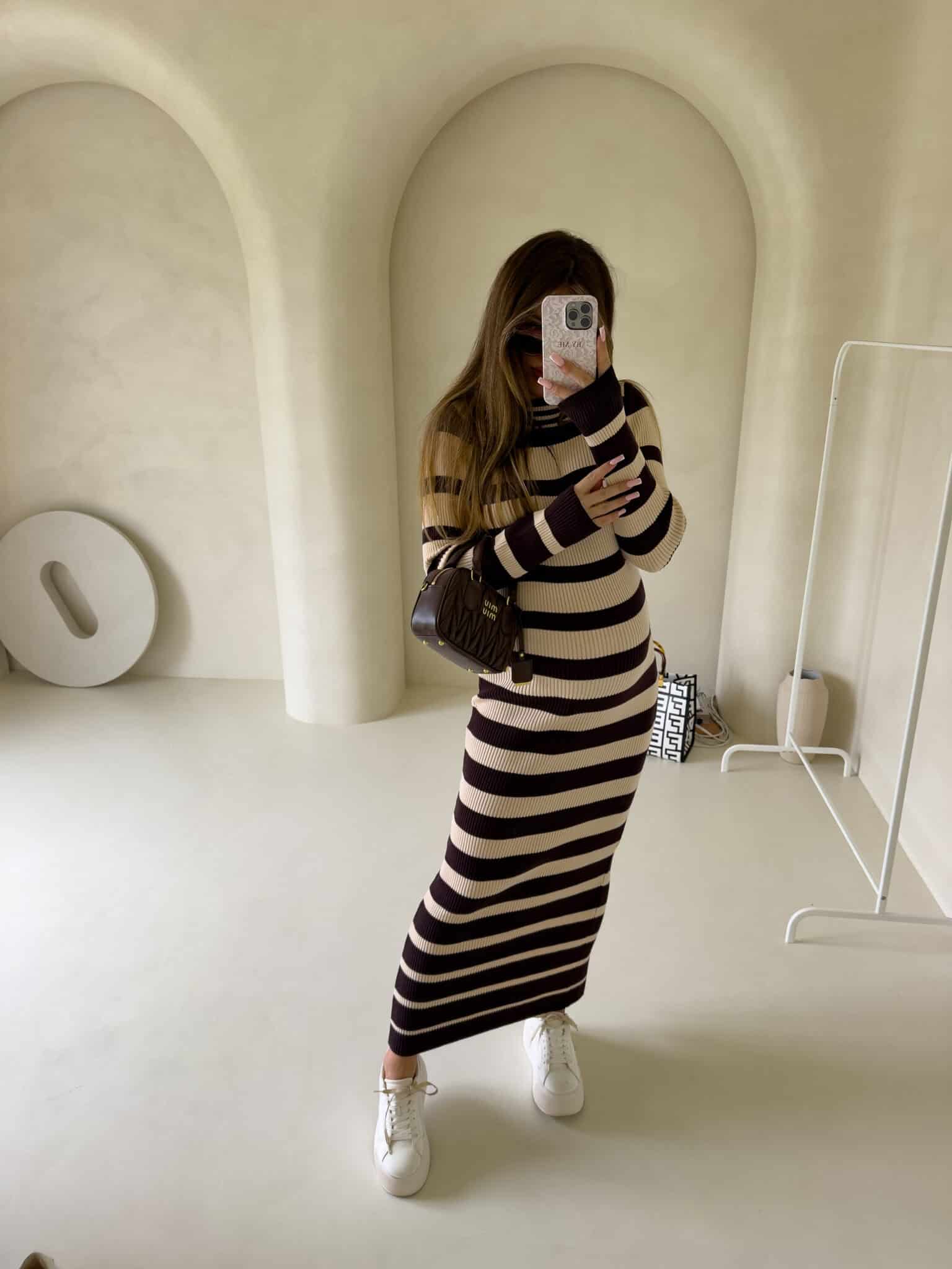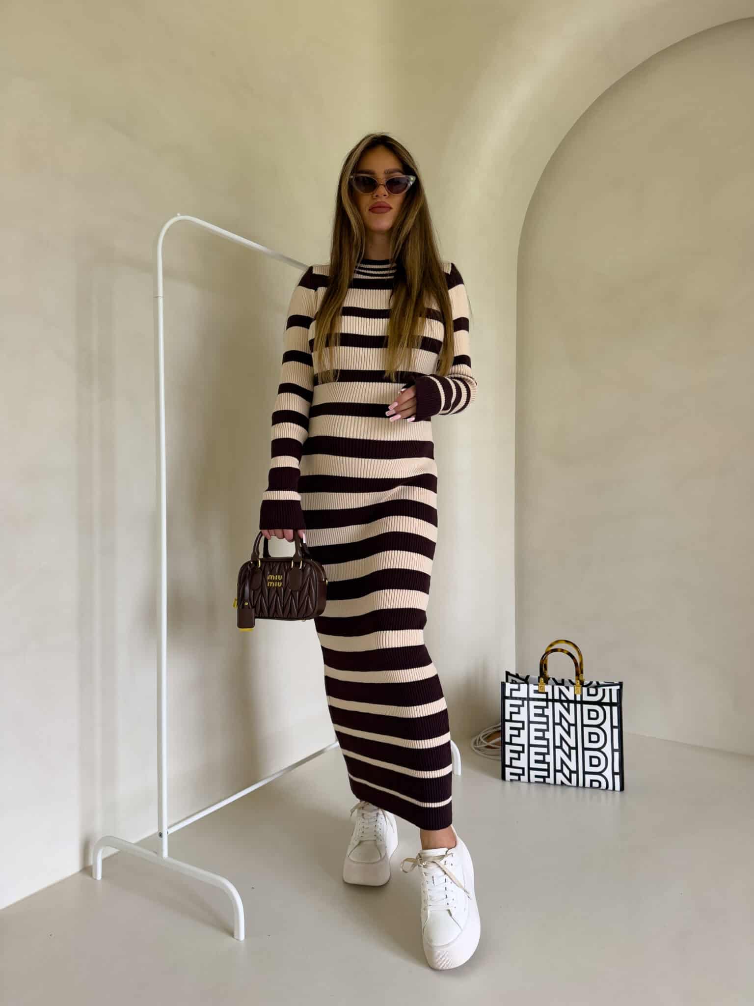 Strickkleid, mit klassischen horizontalen Streifen versehen. Bei einem langen Ärmel reicht es bis zu den Knöcheln, was ihm einen eleganten und minimalistischen Look verleiht. Das Muster der Streifen ist regelmäßig, was die Silhouette visuell betont. Das gerippte Material ist ein gestricktes Gewebe, das sich gut an den Körper anpasst.