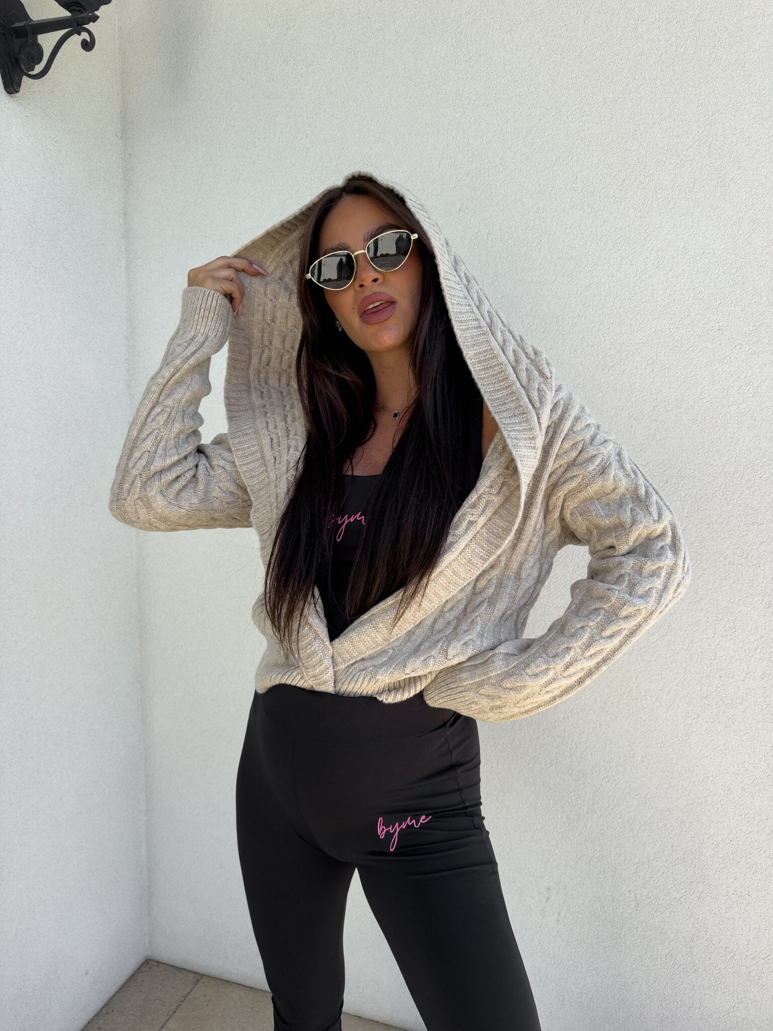 Strickpullover mit Kapuze, aus dickem, geflochtenem Material mit einem ausgeprägten Gewebe. Die Ärmel und die Unterseite des Pullovers sind mit einem Puller versehen.