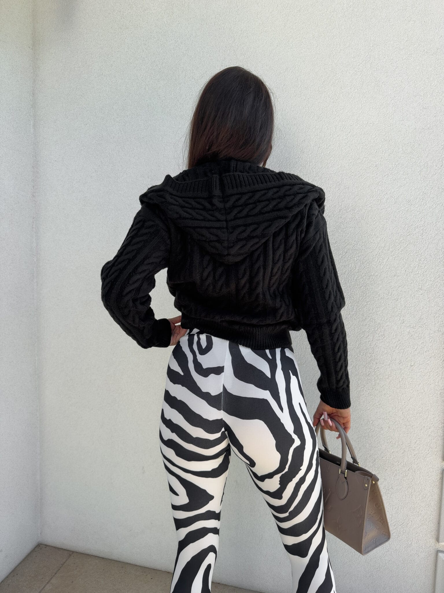 Strickpullover mit Kapuze, aus dickem, geflochtenem Material mit einem ausgeprägten Gewebe. Die Ärmel und die Unterseite des Pullovers sind mit einem Puller versehen.