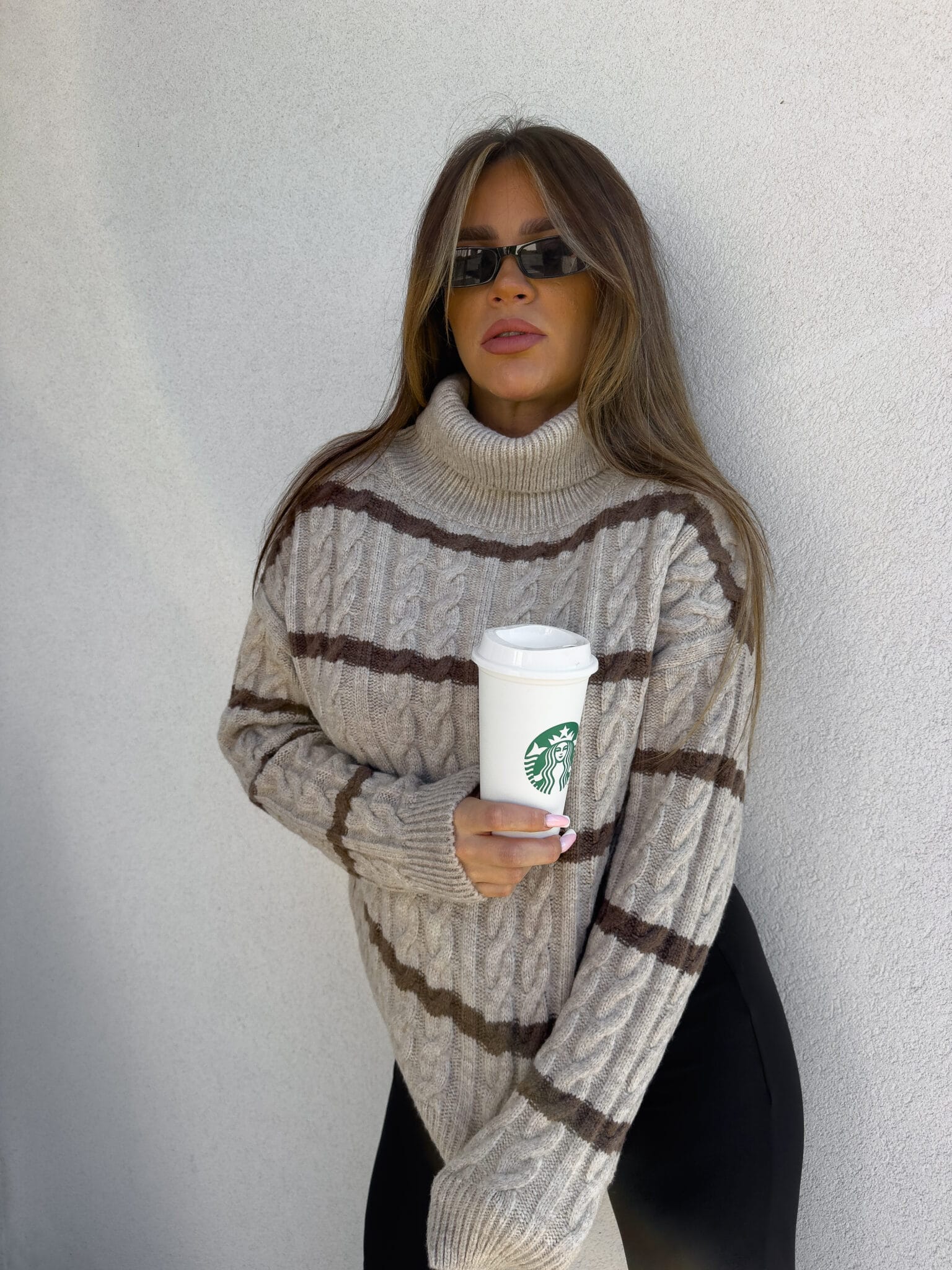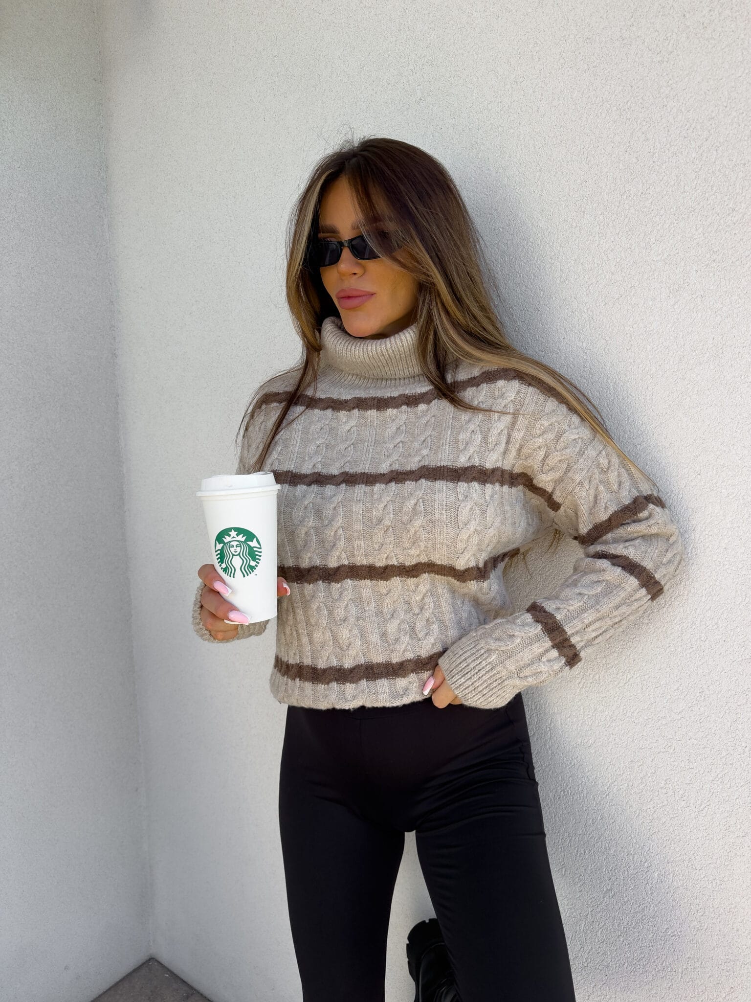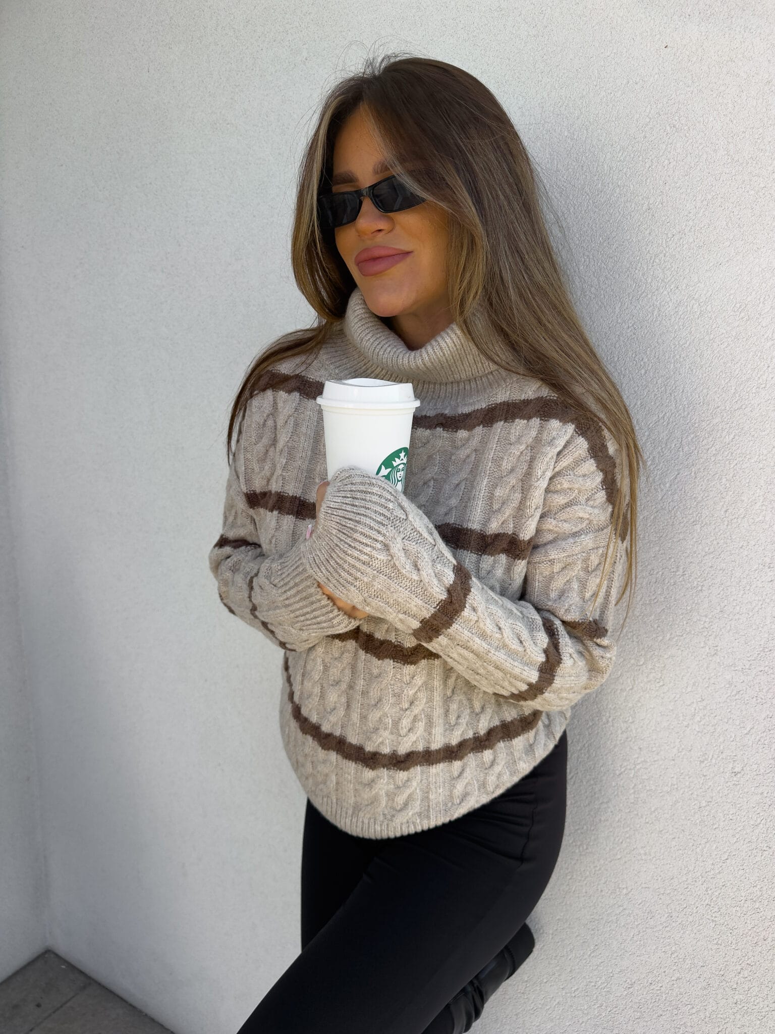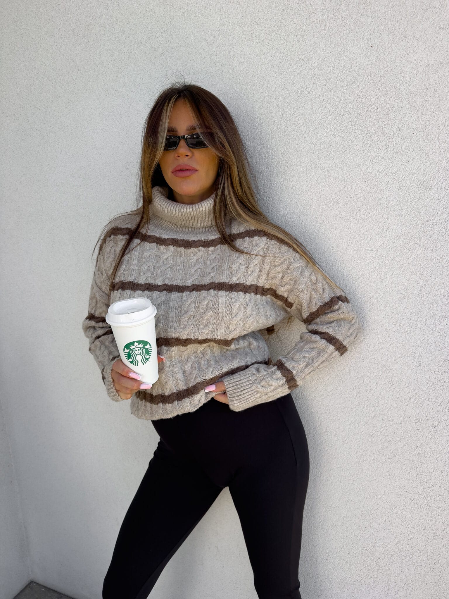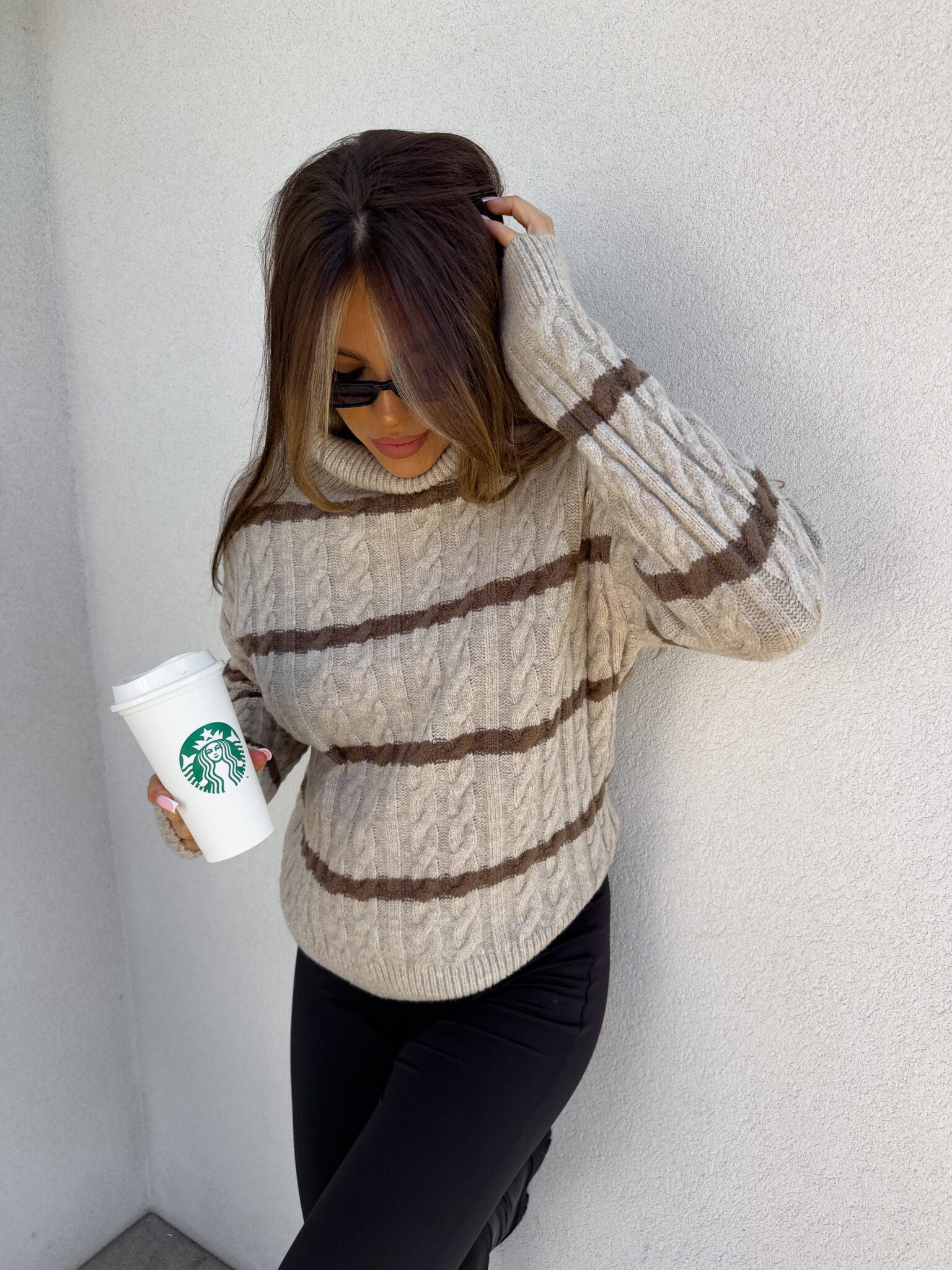 Rollkragenpullover INKO Streifen- beige-Schoko