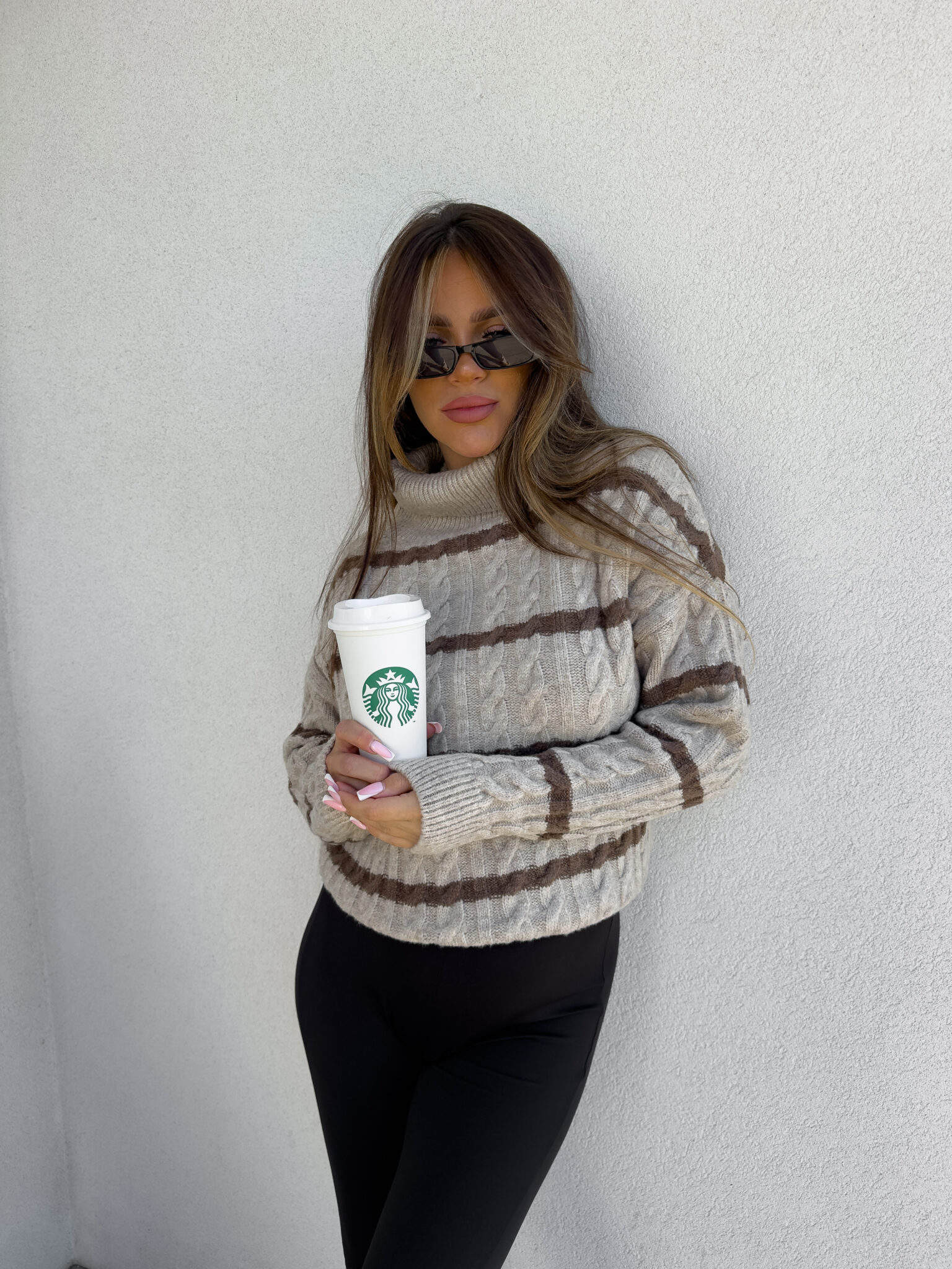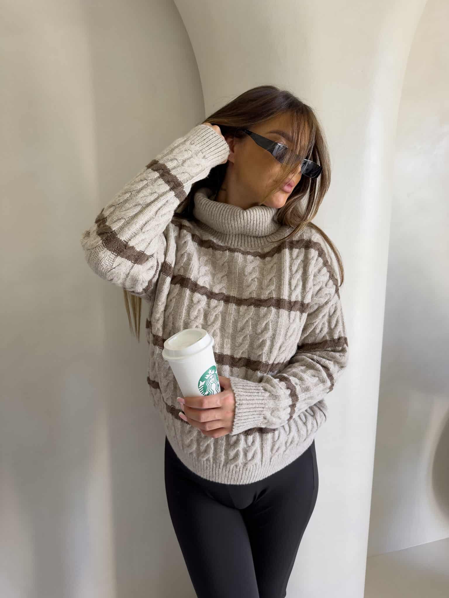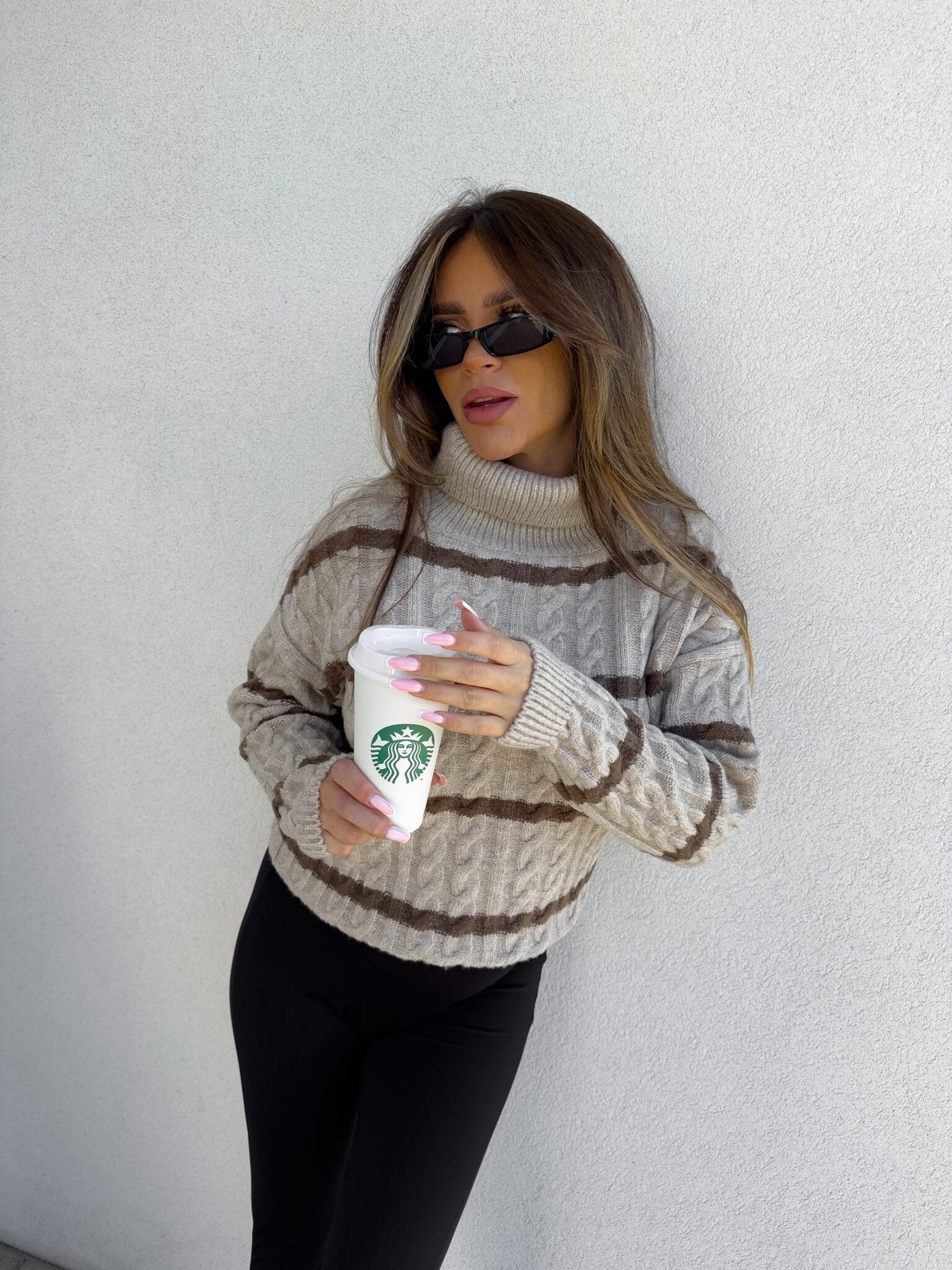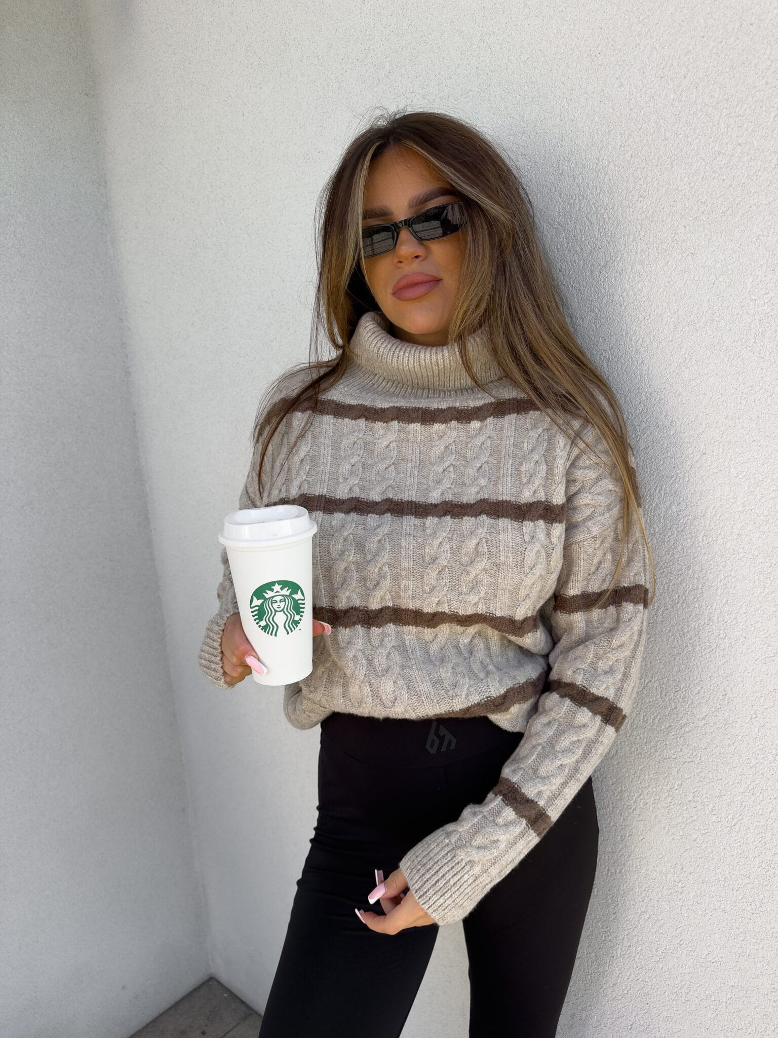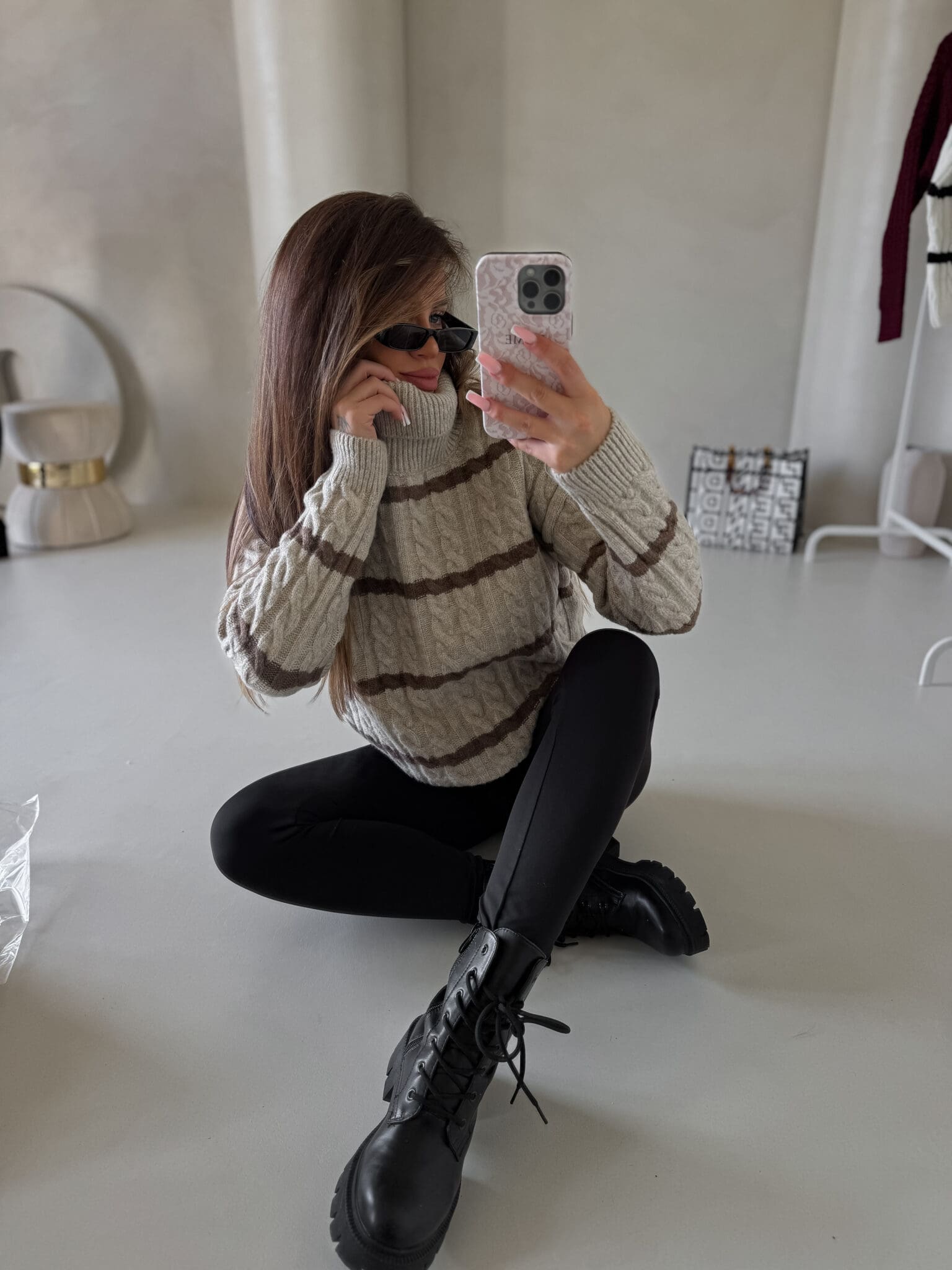 Rollkragenpullover INKO Streifen- beige-Schoko