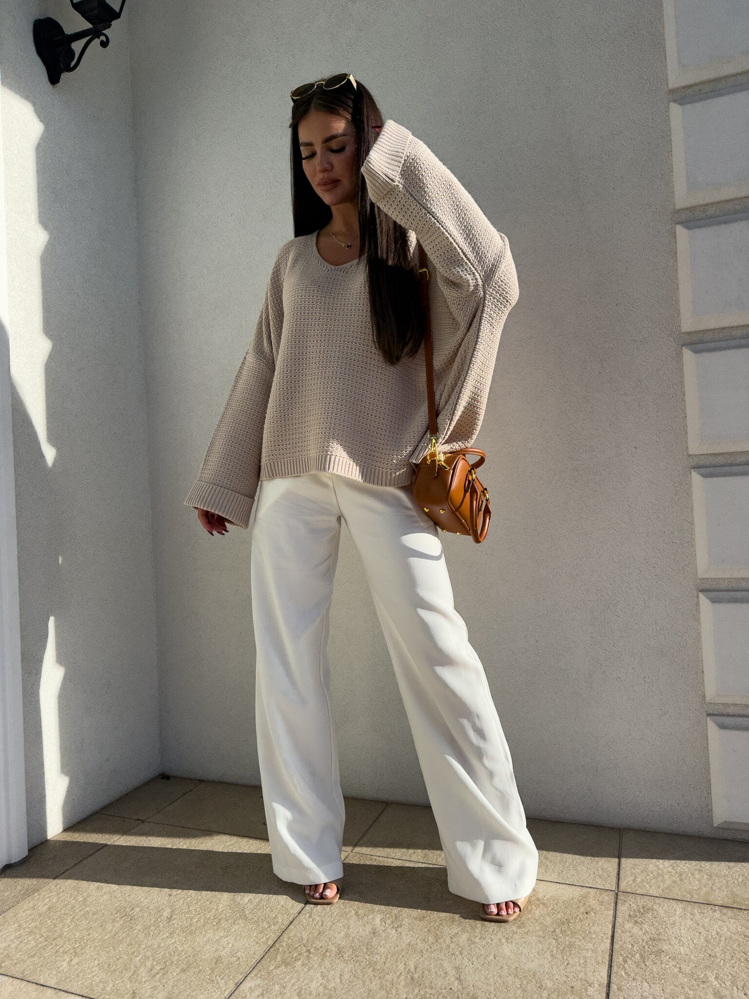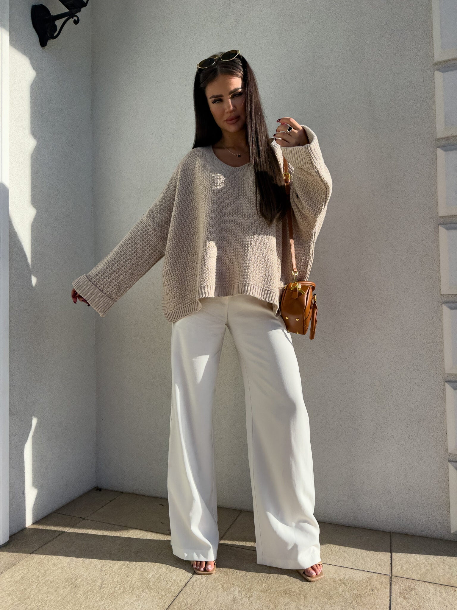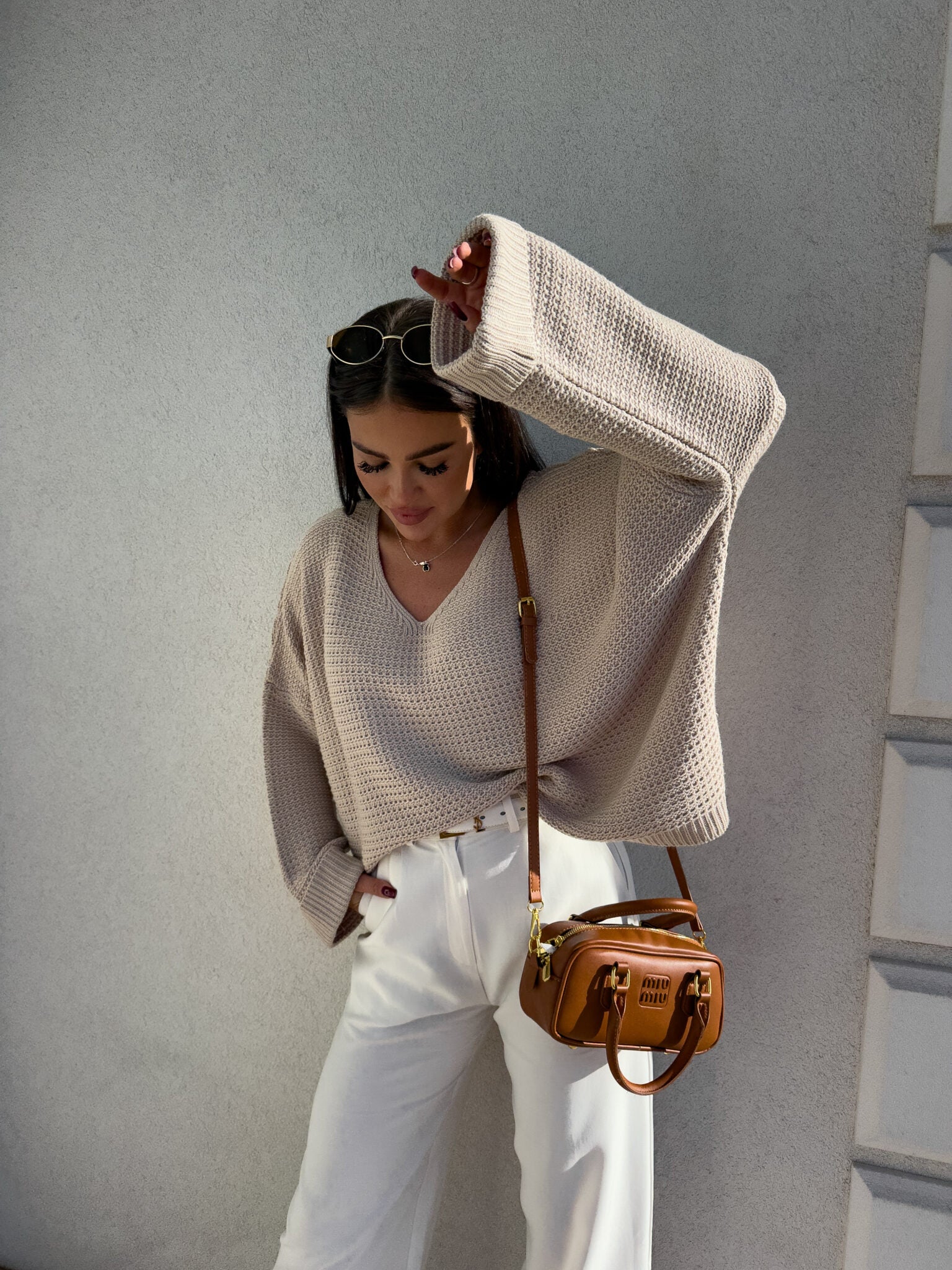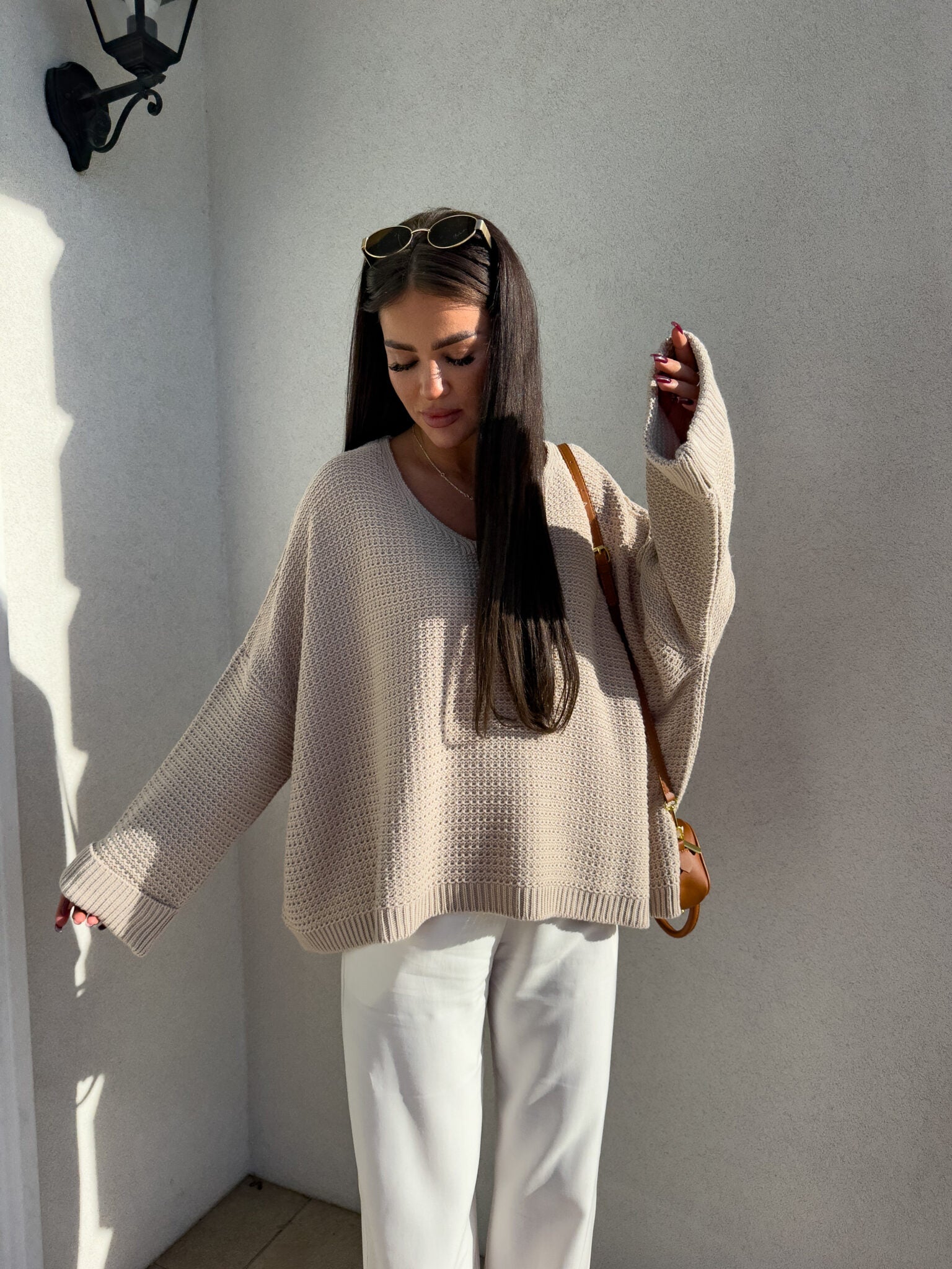 Ein Strickpullover, der über dem Kopf getragen wird, mit langen Ärmeln und V-Ausschnitt ist eine klassische Wahl, die Eleganz mit Komfort verbindet. Es besteht aus weichem, elastischem Strick und bietet den ganzen Tag über Komfort. Der V-Ausschnitt sorgt für Leichtigkeit und subtile Weiblichkeit und betont die Silhouette. Dank seines einfachen, aber zeitlosen Schnitts eignet sich dieser Pullover sowohl für lässige als auch für elegantere Stile. Perfekt für den Alltag, passt es gut zu Jeans, Röcken oder eleganten Hosen.