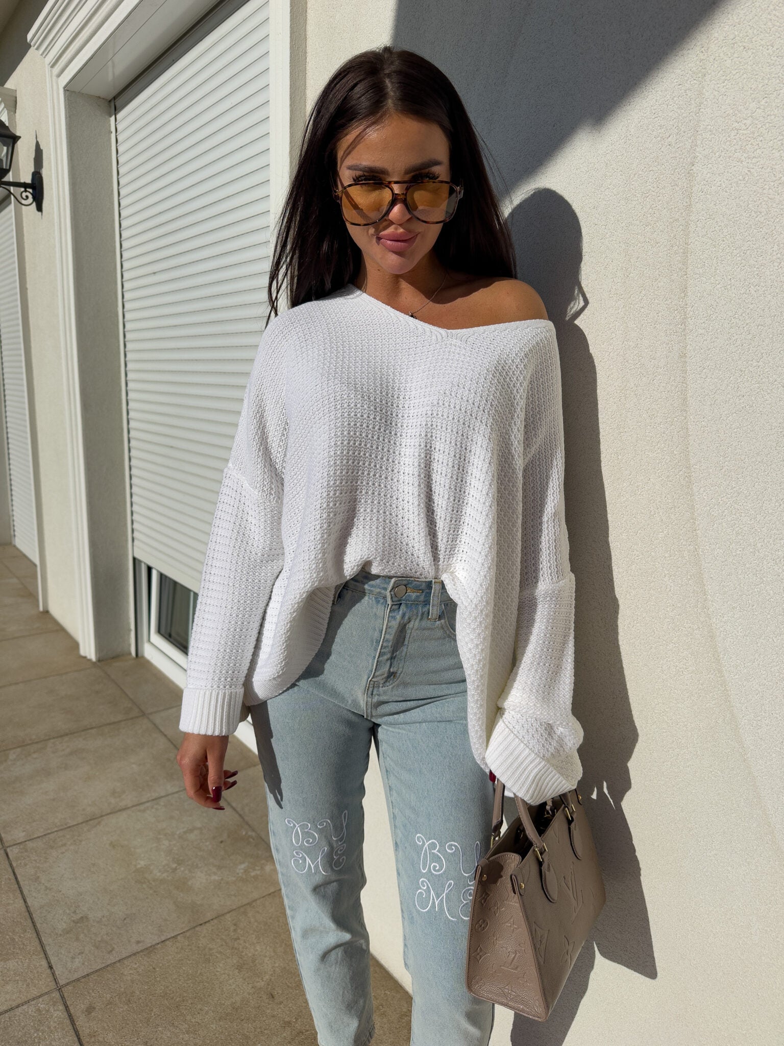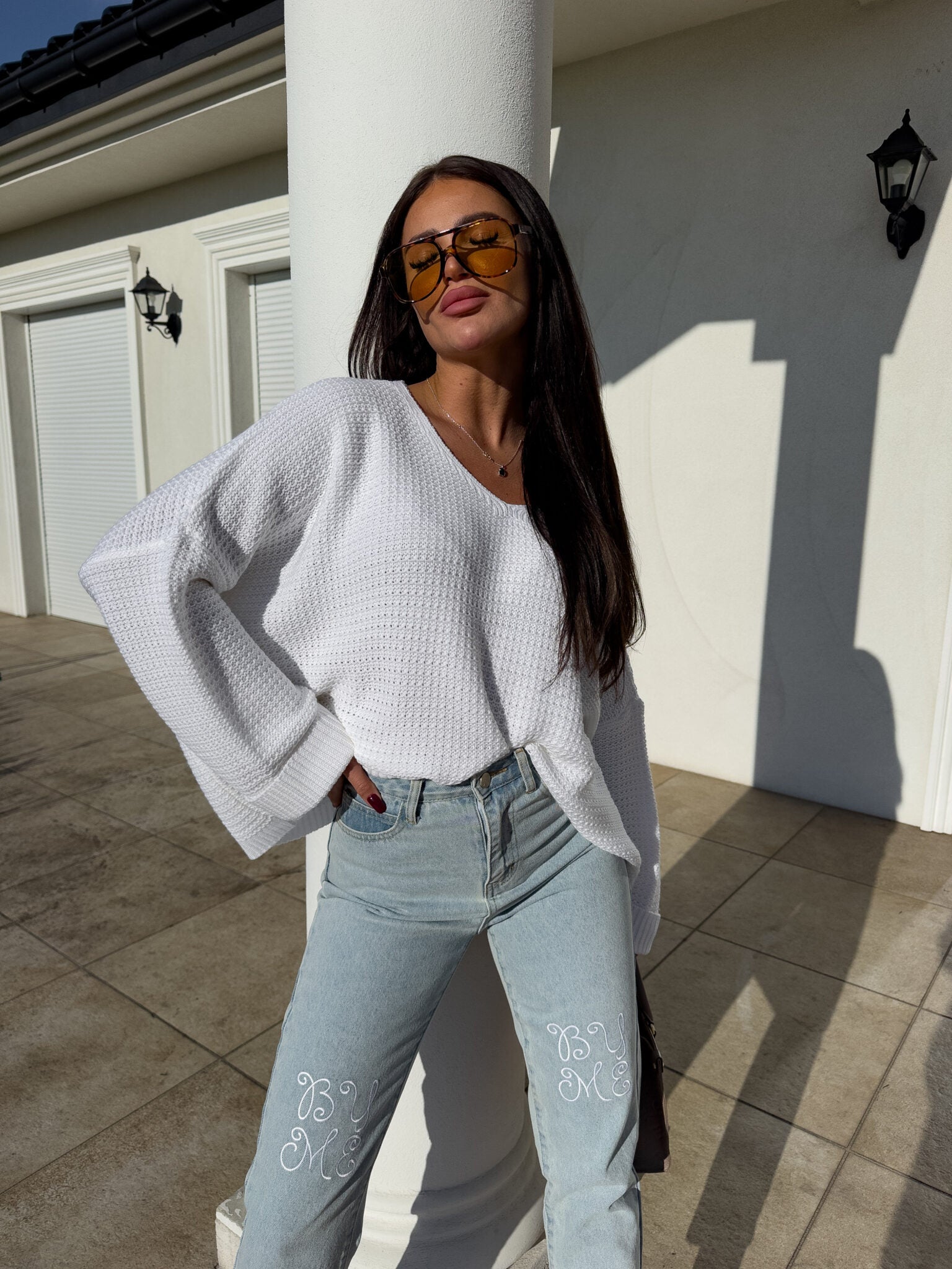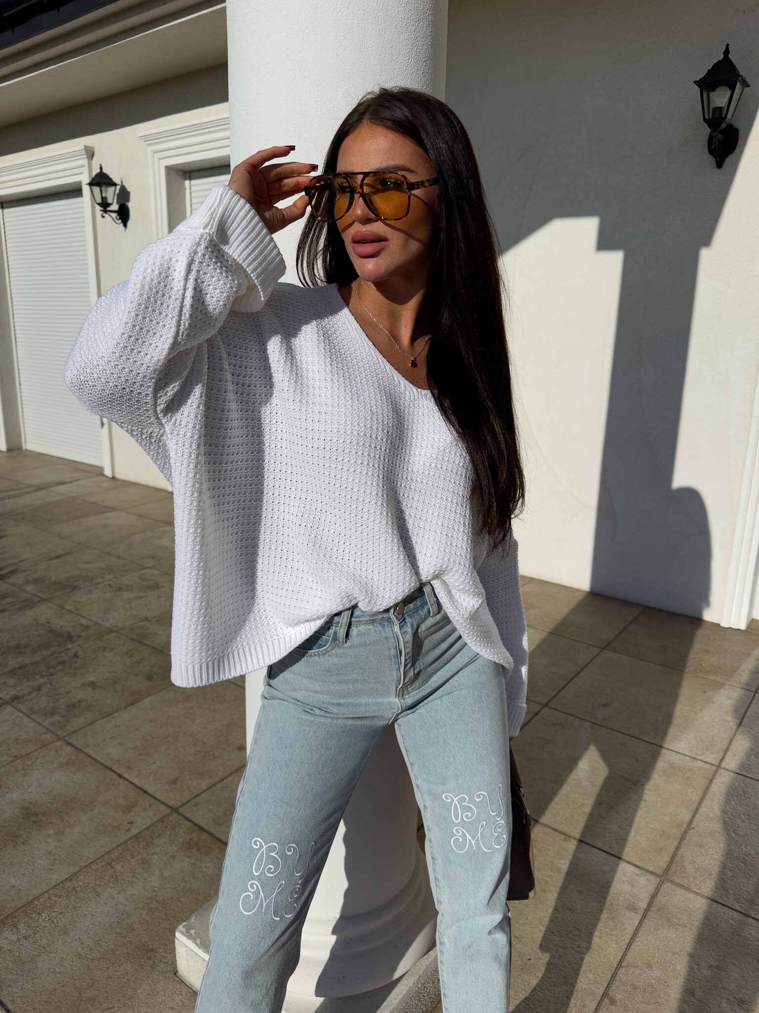Ein Strickpullover, der über dem Kopf getragen wird, mit langen Ärmeln und V-Ausschnitt ist eine klassische Wahl, die Eleganz mit Komfort verbindet. Es besteht aus weichem, elastischem Strick und bietet den ganzen Tag über Komfort. Der V-Ausschnitt sorgt für Leichtigkeit und subtile Weiblichkeit und betont die Silhouette. Dank seines einfachen, aber zeitlosen Schnitts eignet sich dieser Pullover sowohl für lässige als auch für elegantere Stile. Perfekt für den Alltag, passt es gut zu Jeans, Röcken oder eleganten Hosen.